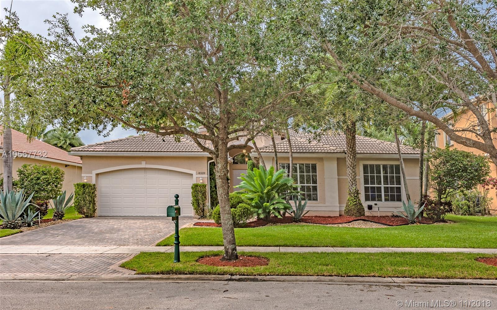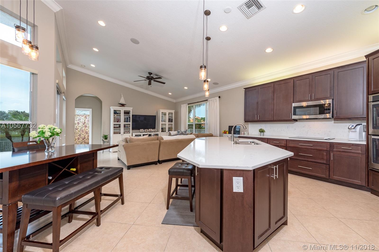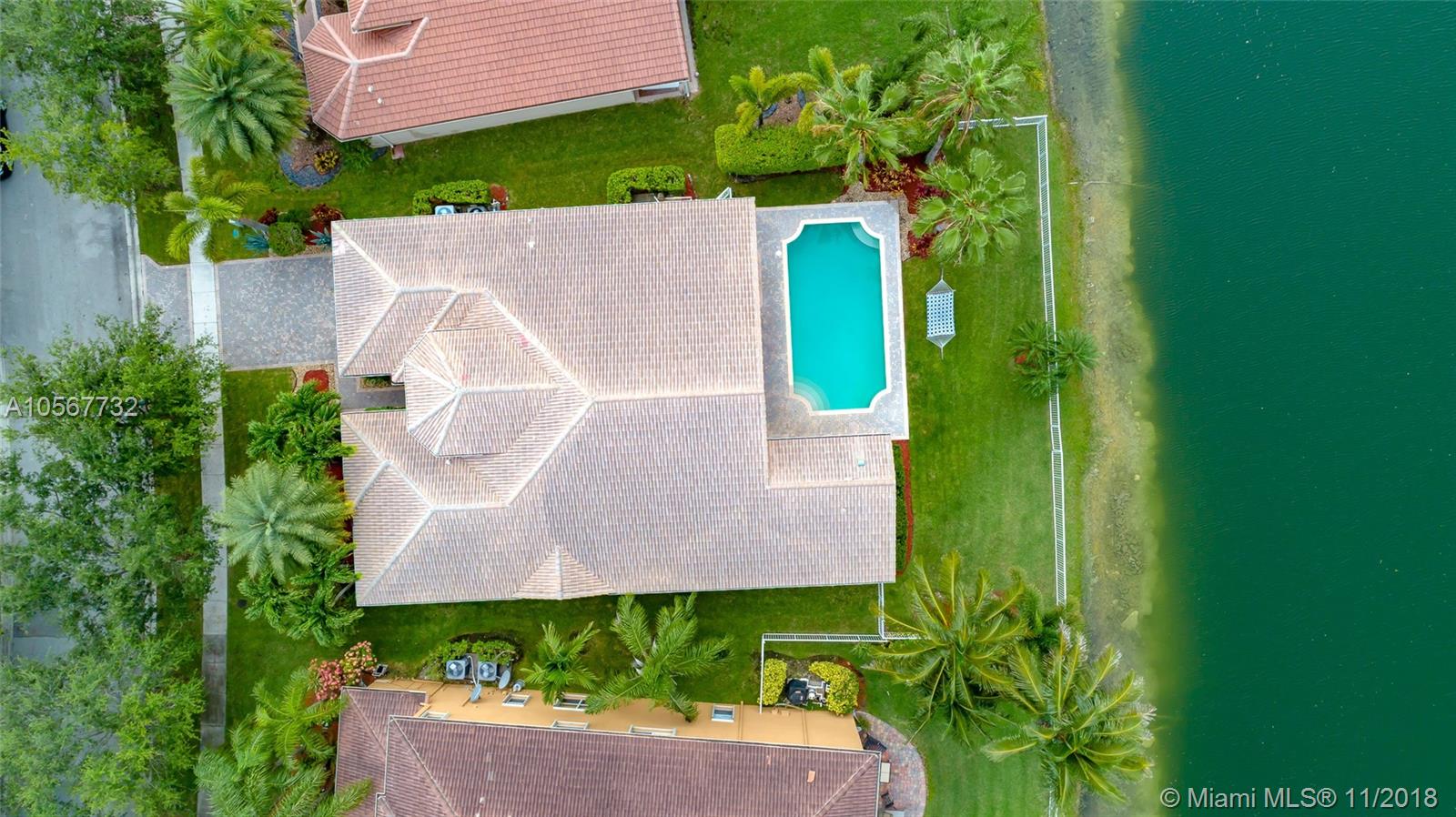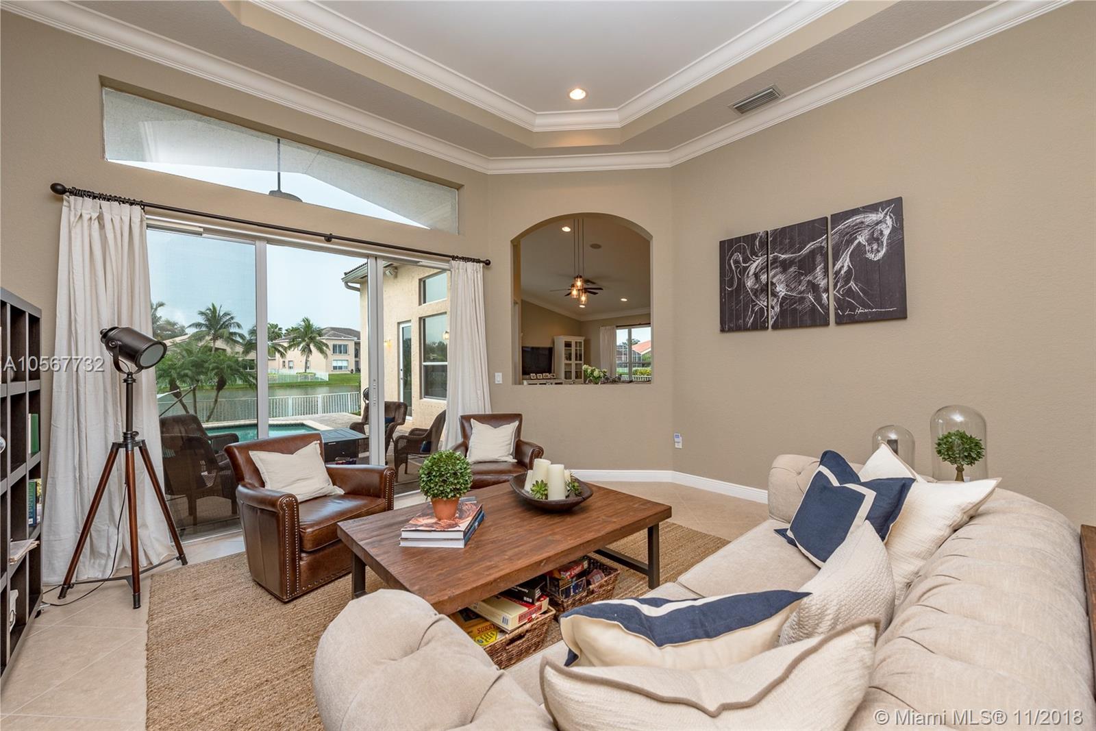 Spectacular Sofia Model home with stunning pool and great Lake view in Sunset Lakes. Home features 5 bedrooms, 3 full bathrooms, laundry room, and 2 car garage. Completely upgraded with high ceilings, tile throughout living area, wood flooring in the bedrooms, quartz countertops, and cherrywood cabinetry in the kitchen , and baths. Home is equipped with surround sound, intercom, and exterior speakers. Brand new appliances were recently installed in 2015, including 2 a/c units, double ovens, dishwasher, refrigerator, washer & dryer. Enjoy beautiful living in this lovely community at Sunset Lakes which includes, guarded gate, clubhouse, pool & spa, 8 tennis courts, exercise room, along with ADT security system, and Xfinity cable included with the HOA.