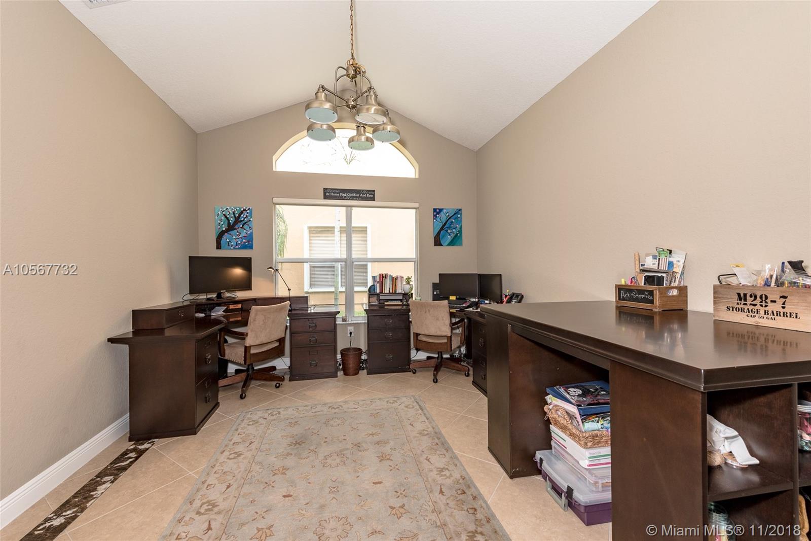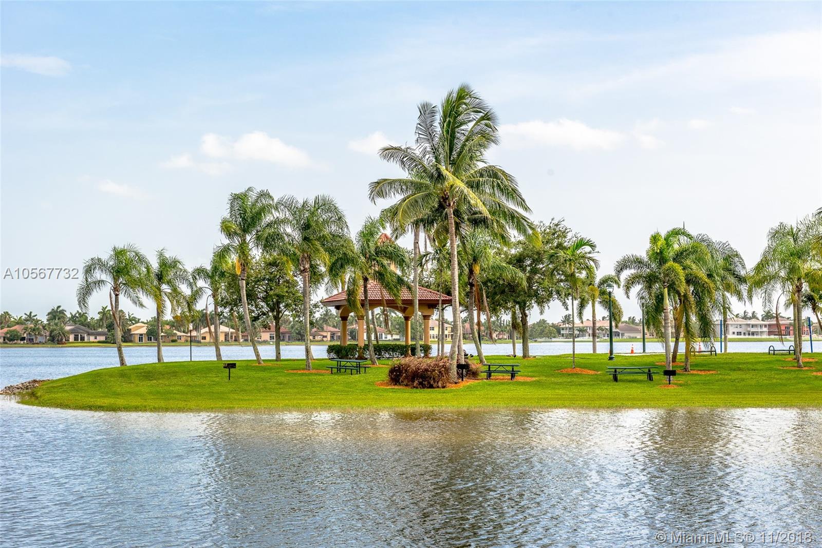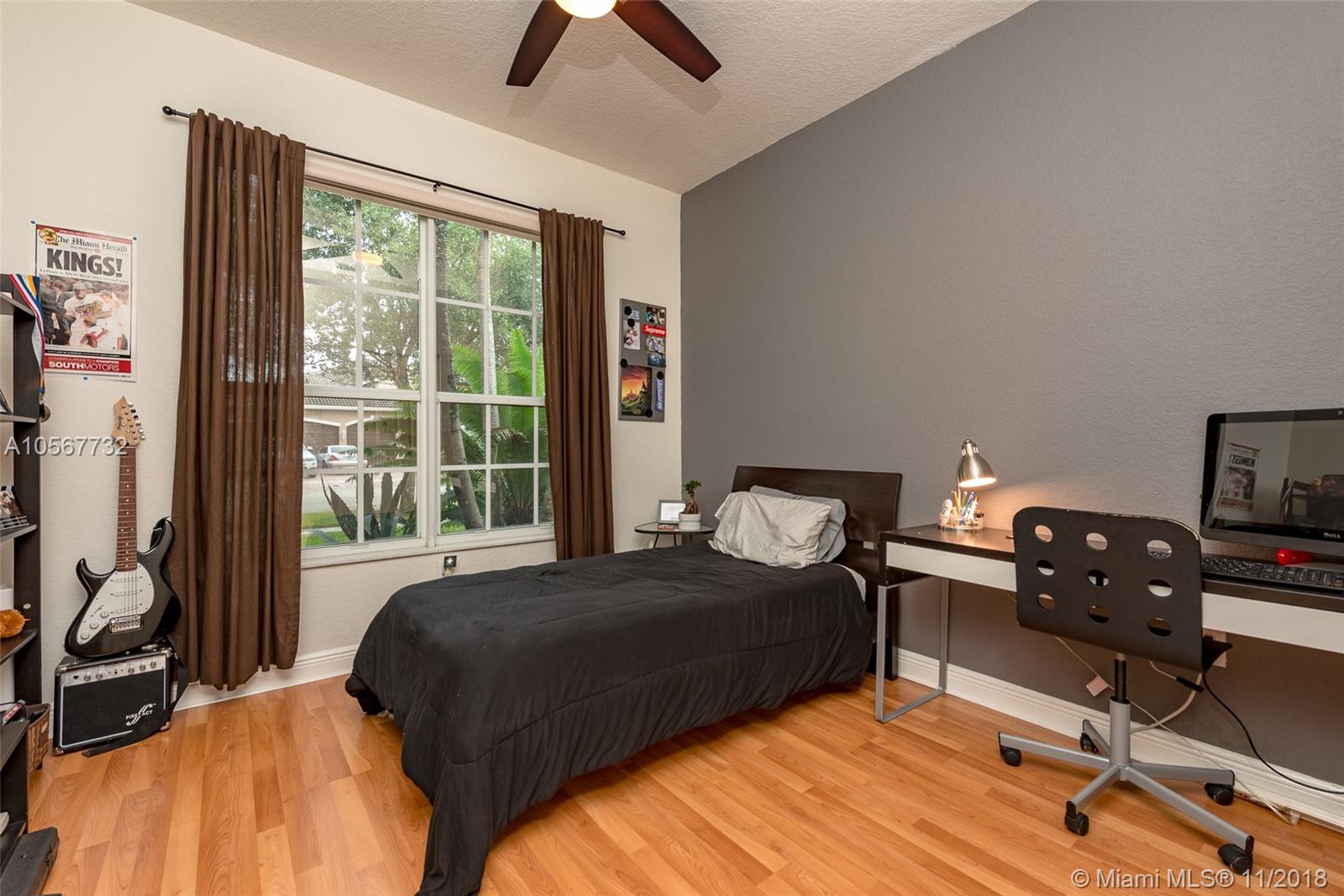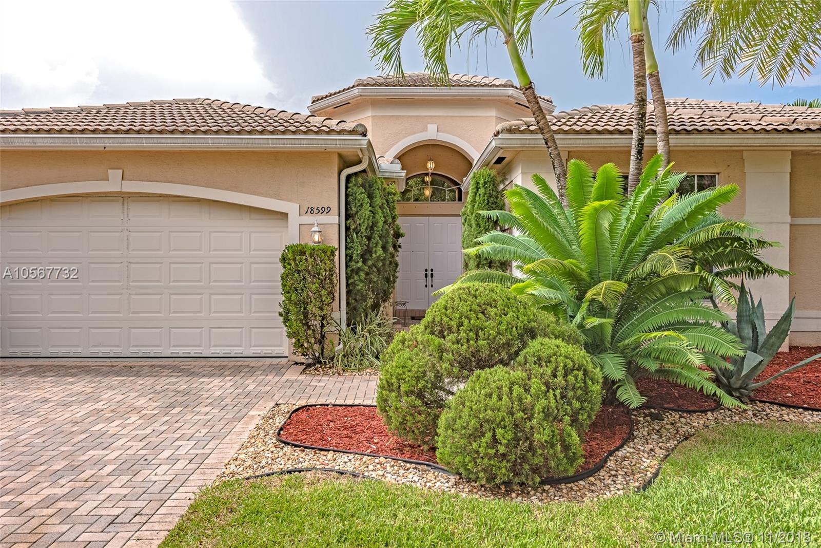 Spectacular Sofia Model home with stunning pool and great Lake view in Sunset Lakes. Home features 5 bedrooms, 3 full bathrooms, laundry room, and 2 car garage. Completely upgraded with high ceilings, tile throughout living area, wood flooring in the bedrooms, quartz countertops, and cherrywood cabinetry in the kitchen , and baths. Home is equipped with surround sound, intercom, and exterior speakers. Brand new appliances were recently installed in 2015, including 2 a/c units, double ovens, dishwasher, refrigerator, washer & dryer. Enjoy beautiful living in this lovely community at Sunset Lakes which includes, guarded gate, clubhouse, pool & spa, 8 tennis courts, exercise room, along with ADT security system, and Xfinity cable included with the HOA.