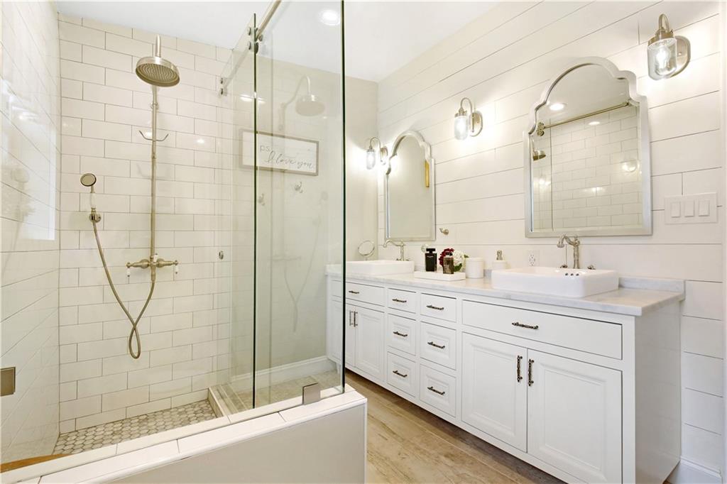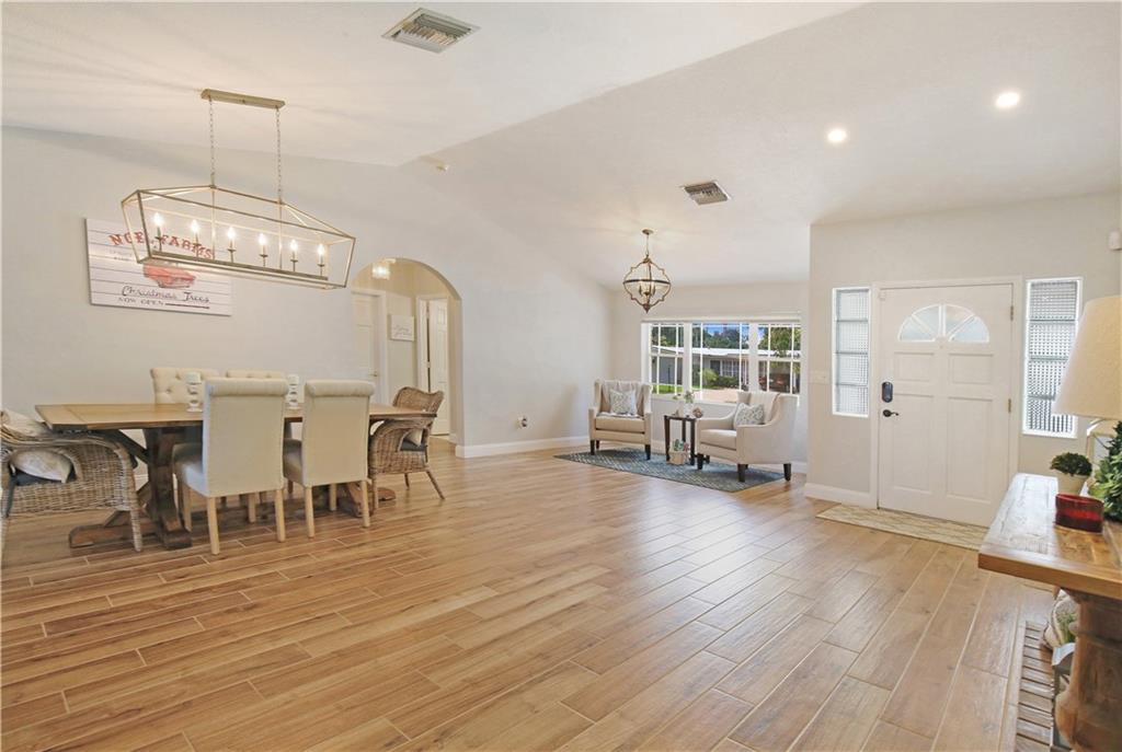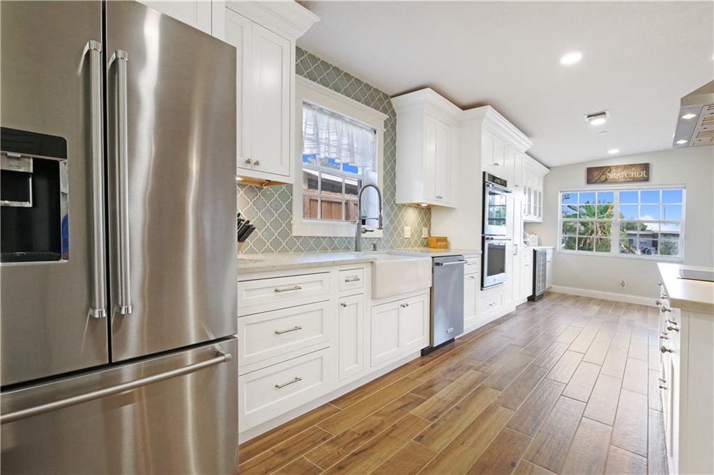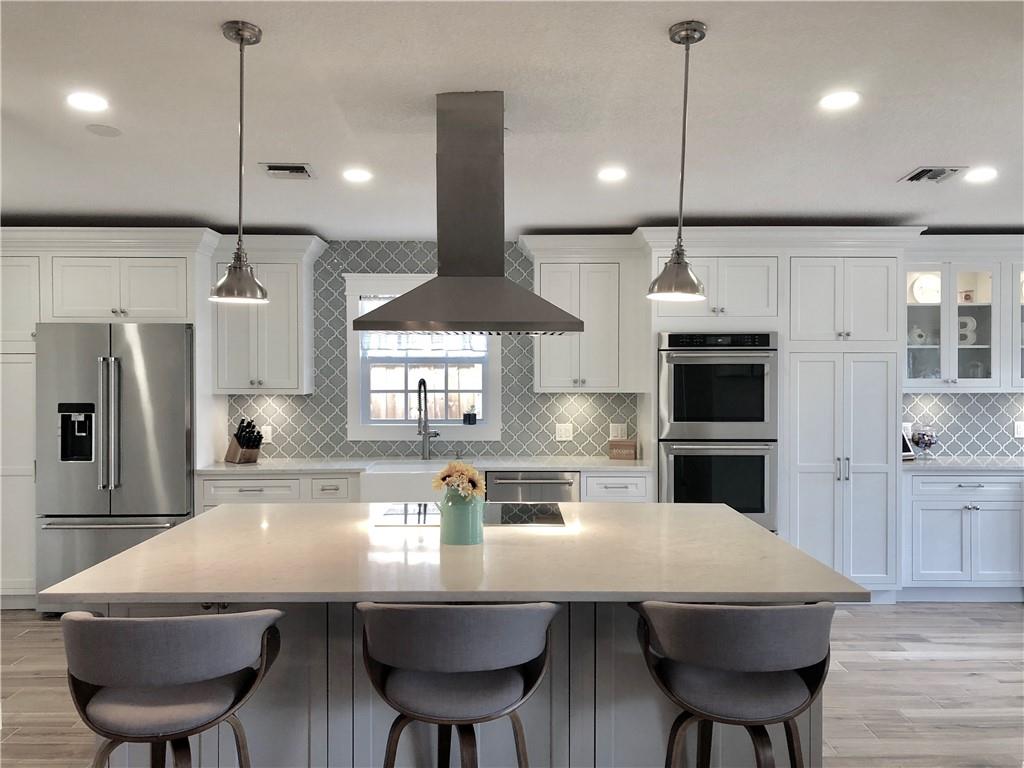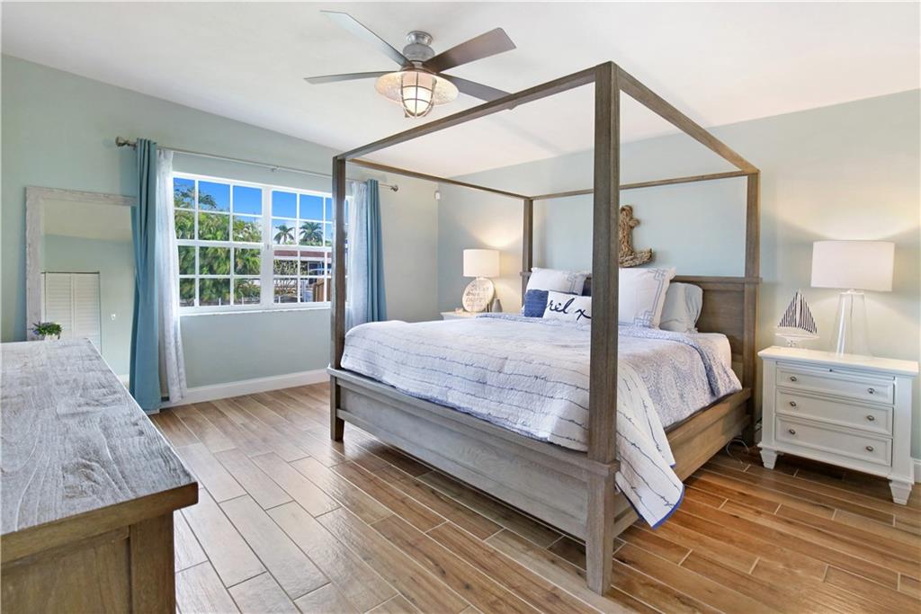 Stunning Lauderdale Isles home with timeless renovations. Beautifully updated 3BR/2BA with 60ft on deepwater/ocean access canal. Spacious floorplan with approx 2300 sq ft, vaulted ceilings, and new porcelain plank floors continuous throughout living areas and bedrooms. Dreamy, white open concept chef's kitchen with cooking island and counter seating, breakfast area, top stainless appliances, quartz counters, farmhouse sink, and recessed lighting. Sliding doors seamlessly blend interior with outdoor living. Generous master bedroom with walk-in closet, dual sinks and frameless shower. Screened east-facing patio for year-round entertaining and west facing patio to catch the sunset. Newly permitted garage door for 1CG with 4 driveway parking.