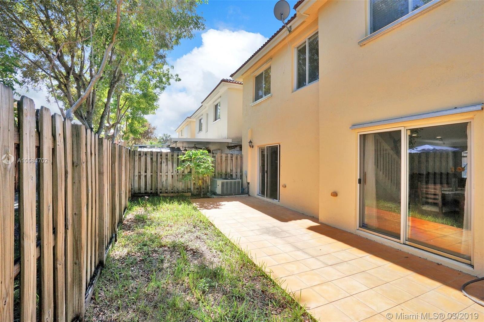 Large 1860 sq. ft., 3 bedrooms, 2 baths, 2 story townhome located at Bella Colina in Miami Lakes. Laminate floors upstairs, tile downstairs. Hide hat lighting. Stainless steel appliances except the range, washer and dryer. Walk-in closet. Tub and shower in the master bathroom. Big patio. Beautiful townhome. This one won’t last.