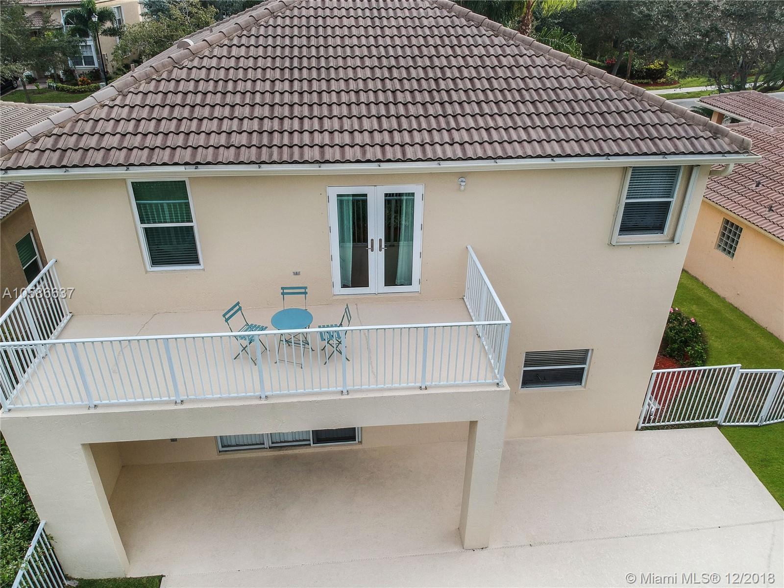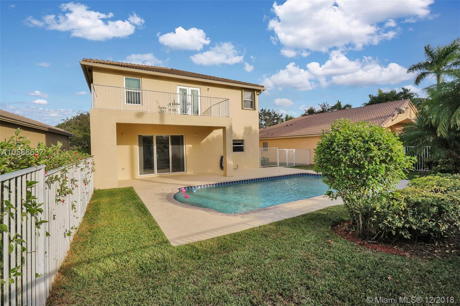 Pristine home located in highly desired Emerald Estates Community in Weston, FL. Two story (all CBS construction), 4 bedroom home with 2.5 baths and pool. Very spacious Master bedroom with sitting area and French door opening to balcony. Impact windows/door and accordion shutters upstairs. Flooring in all bedrooms upgraded to engineered hardwood and new carpet on stairs. Tile on 1st floor.Kitchen has Stainless steel appliances. Easy and close access to I-75. Publix shopping center and Cleveland Clinic hospital 1 mile away. A+ schools for area and school bus stop one house away. Wonderful neighborhood amenities (clubhouse with gym and pool; park with playground and tennis courts). Beautiful sunset views.Association includes cable, landscaping,internet and alarm.The roof was just checked