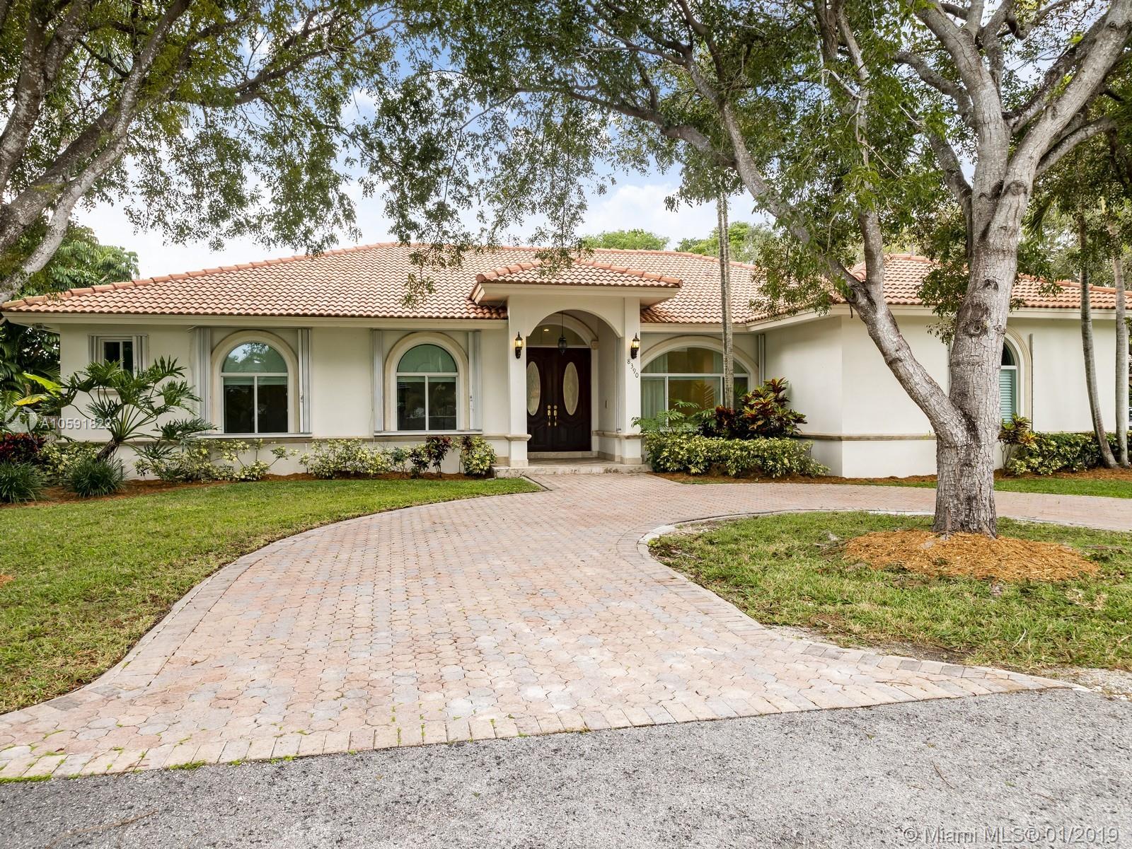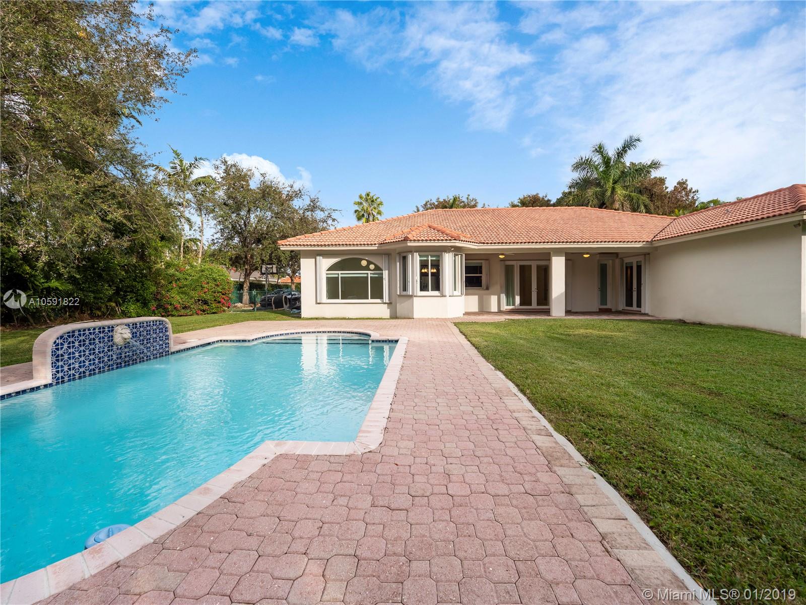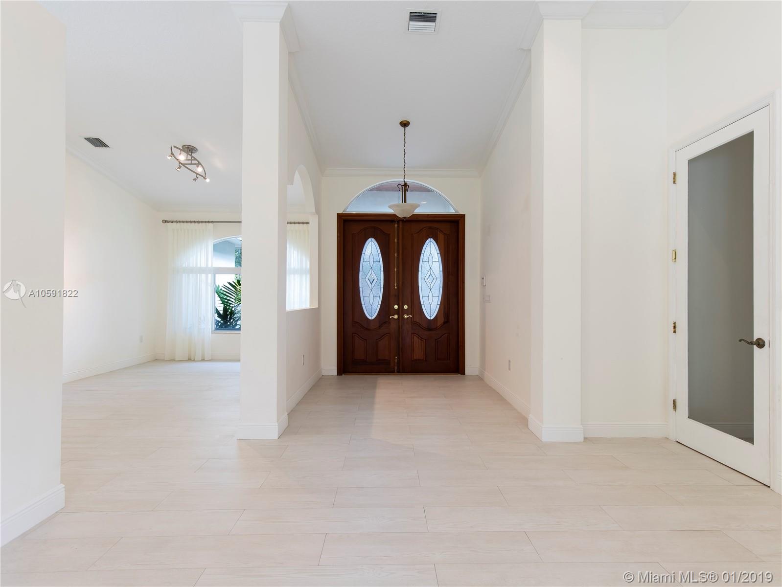 Lovely updated 4 bedroom, 3.5 bath home, offers great and spacious features: Private Entrance with beautiful Coral Rock Wall,luscious landscape, Family room, high ceilings, new tile floors throughout, and 2,840 SF of living area. Beautiful arched windows in the Dining and Family room, French Doors in Living room overlooking the pool/patio. Ample New kitchen with stone counters tops, Stainless Steel appliances integrated with the spacious Family room. Great master suit/bath with double vanities and Jacuzzi tub! Great patio for entertaining.Two car garage circular driveway.