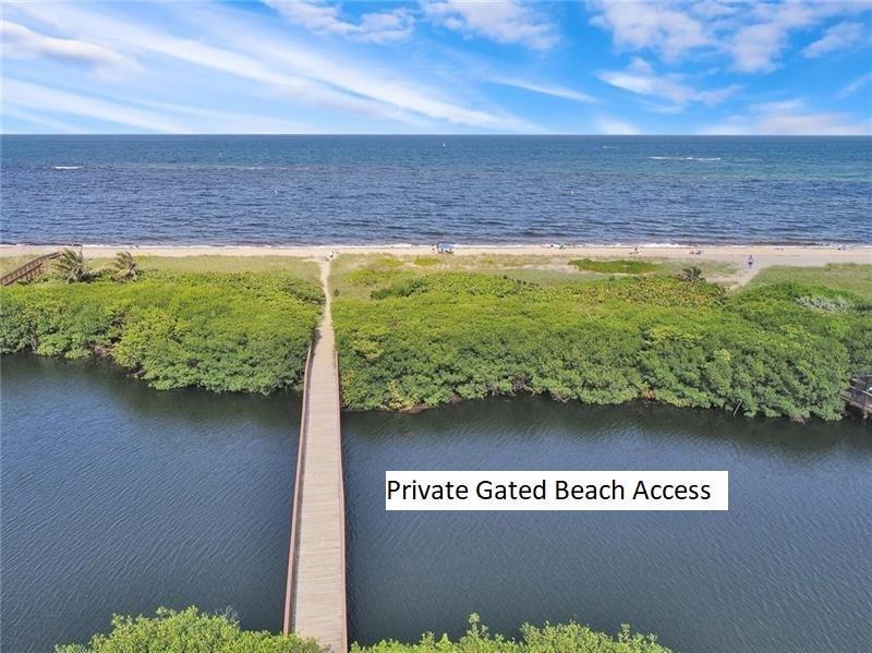 Your dream of a home at the beach is about to come true. Hillsboro Bay By The Sea is a unique upscale oceanfront gated community on one of the most beautiful stretches of beach in South Florida. Your gated beach access is unlike any other with a footbridge over a lagoon through lush tropical mangroves to the sand where you will enjoy the view of the lighthouse and endless boat parade through Hillsboro inlet. This spacious tri-level townhome is architecturally designed with European elegance. Elevator, marble floors, 2 car garage, new A/C, move in ready. 1st floor flex room & bath-4th bedroom/in-law suite or family room opens to private patio with in-ground spa & natural gas BBQ grill. From master suite balcony, you can catch a glimpse of the ocean! This is your opportunity. Call today.