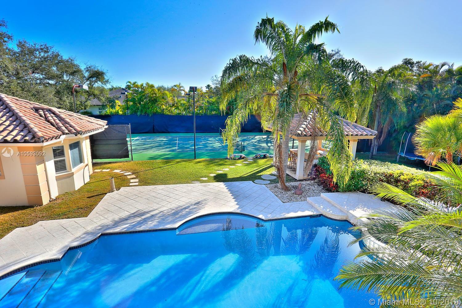 Gated Pinecrest estate featuring a lighted, N/S tennis court, basketball court, heated pool, spacious patio and gazebo. Quiet, no-traffic cul-de-sac street. Updated throughout - spectacular "cook's kitchen" w/quartz counters, natural wood cabinetry and stainless steel appliances. Adjacent to the kitchen is a large family room with a working fireplace. Neutral colors, marble floors throughout, 10' ceilings, LED lighting, impact glass doors/windows. Split bedroom plan with one bedroom currently used as an office w/built-in cabinetry. Master bedroom has separate sitting area overlooking pool/patio, lavish master bath and generous closets. Separate apartment above garage features wood floors, living/dining area, kitchen, bedroom and bath. Walk to Pinecrest Elementary. Vacant - Easy to show.