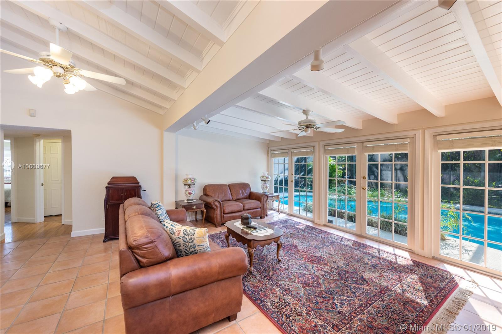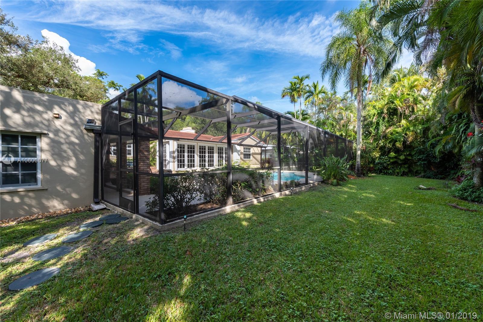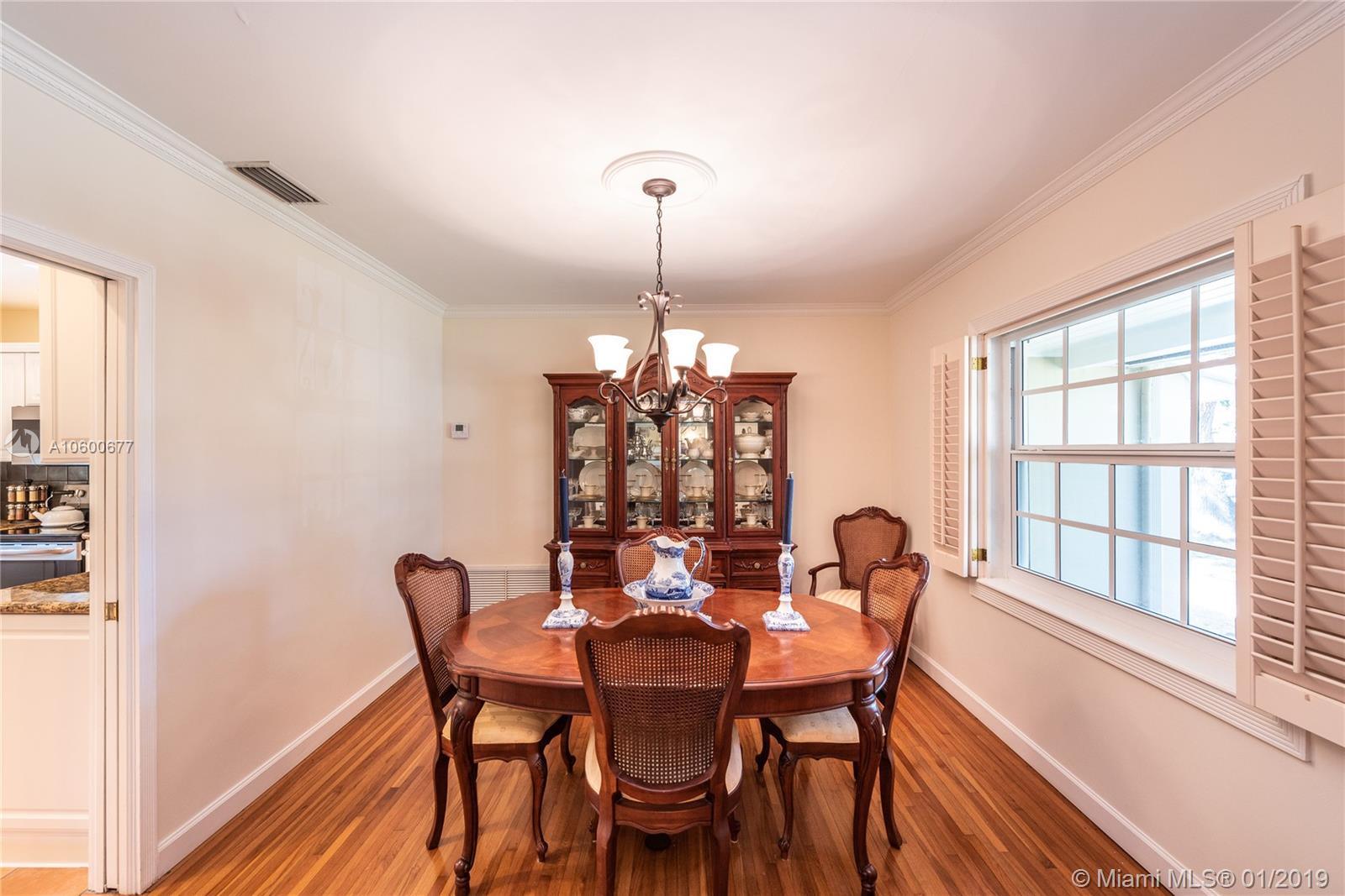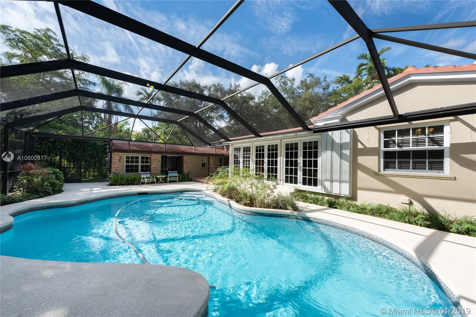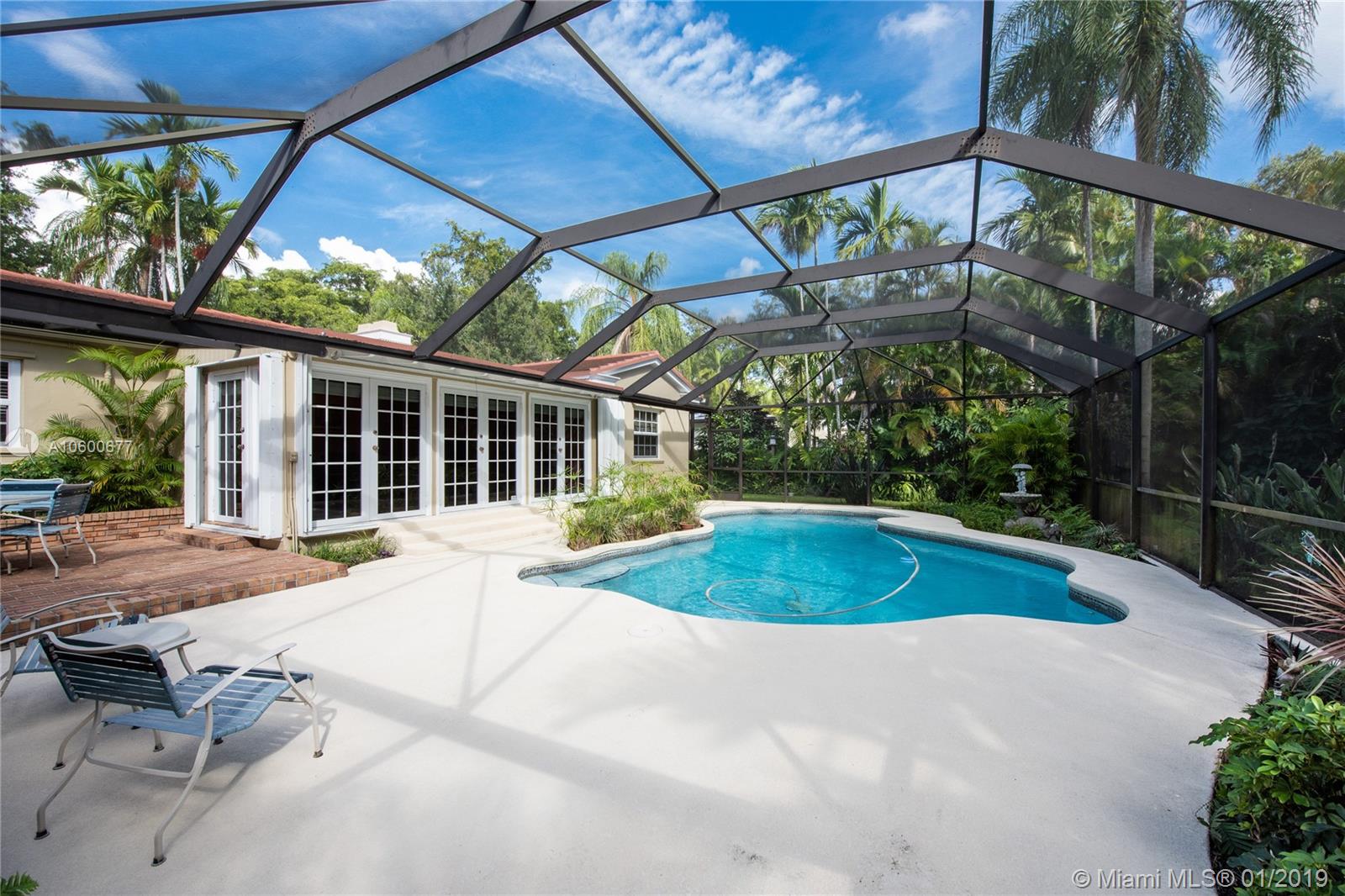 New Listing in the Golden Triangle near the Gables Library. One-story traditional home. 3 bdrm/2 bath + separate guest quarters (in-law suite) with a bath that overlooks the pool. Another full bath is next to the laundry room which could be a pool bath. (4/4 total). Also, space to create a large office under an existing roof. Living room w/fireplace and Formal dining room. A large Family room w/beamed ceiling has a wall of glass doors to the sparkling pool. Light, bright kitchen with new appliances and expansive counter space. The 2-car garage has a wide Chicago brick driveway. Over 2,500 adj.sq.ft on a 13,900 lot. Hardwood floors. Crown moldings. Newer roof. Impact windows/shutters for doors. Some updating will make this house a very special home for your family. FIRM PRICE. Easy to show.