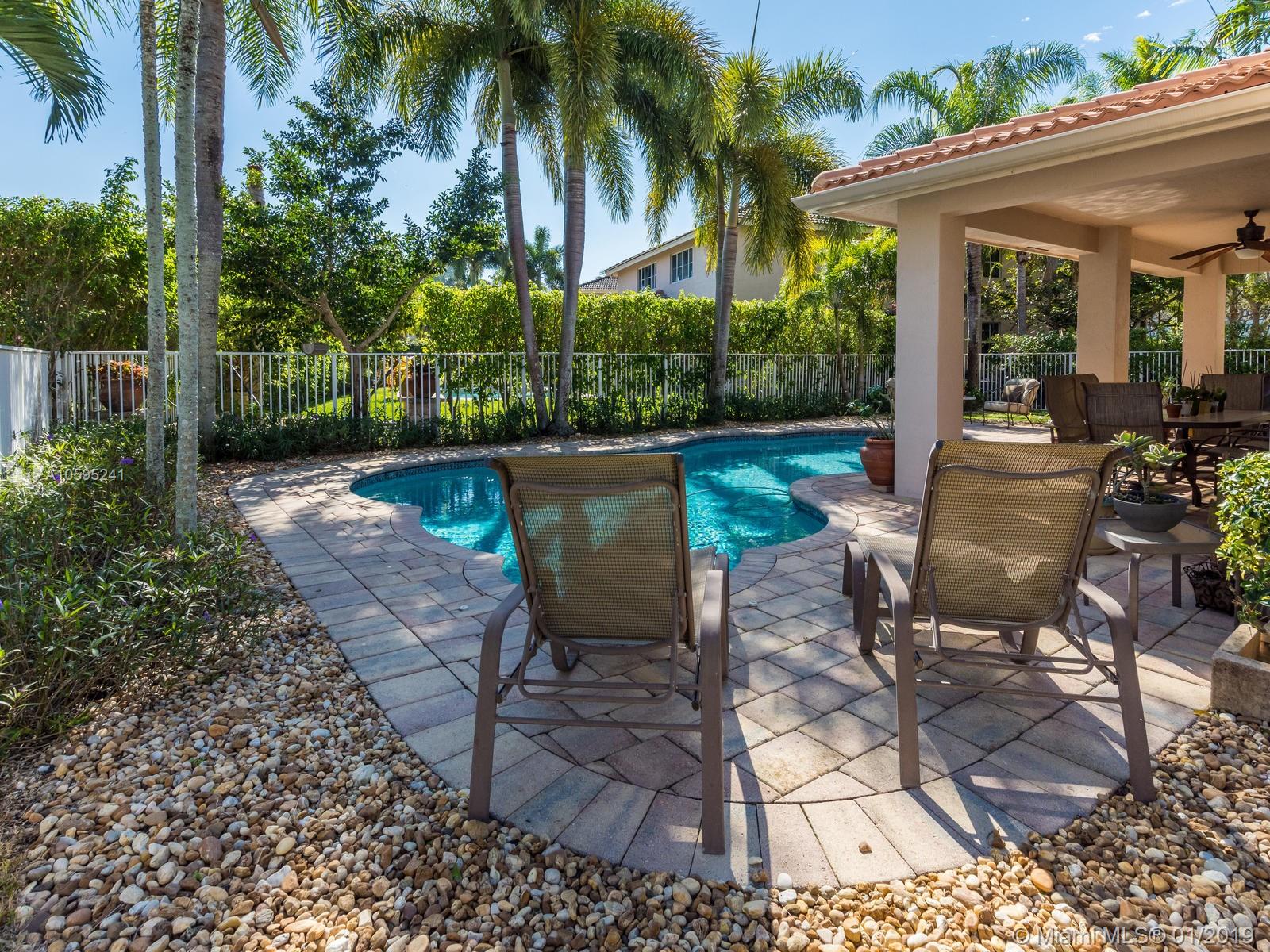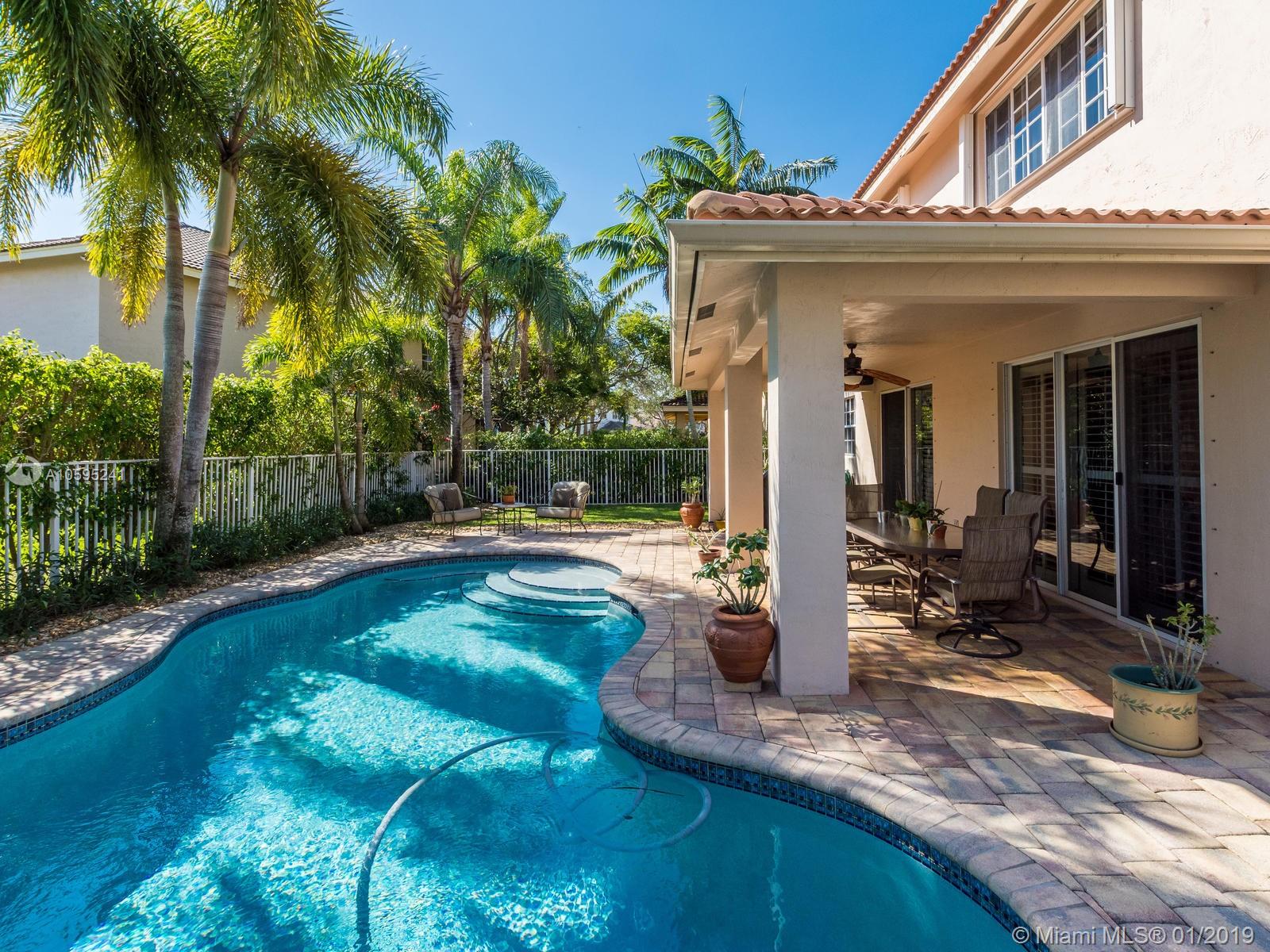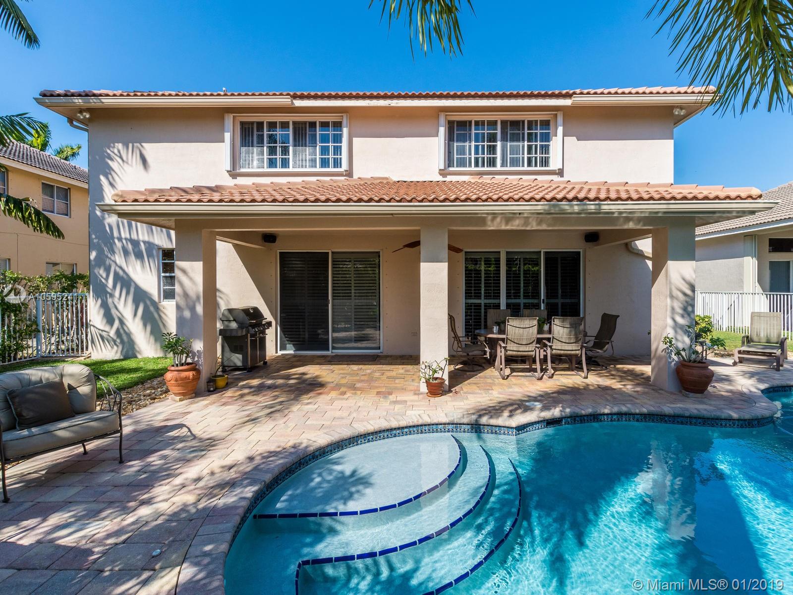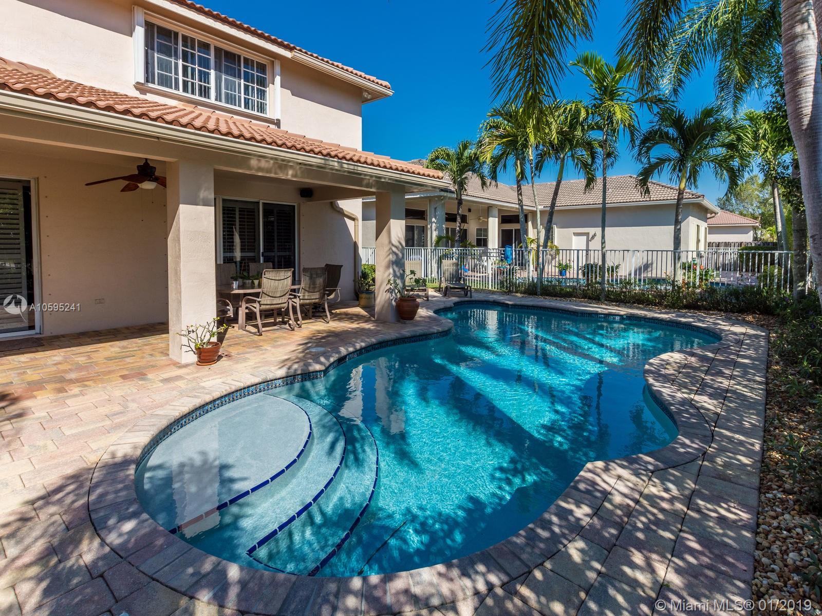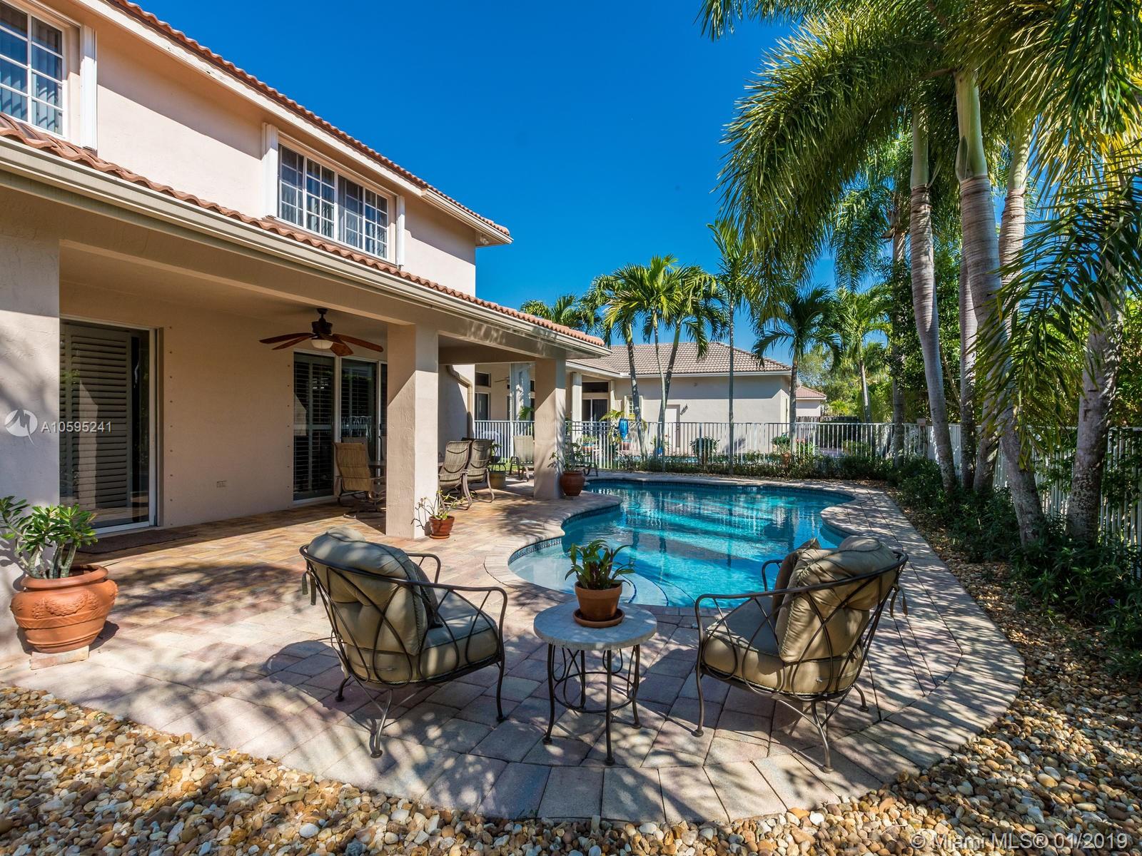 Pristine 6 bedroom/4 bath light and bright home with newer roof (2006) and new AC units (2017). Two story foyer, crown molding, neutral porcelain diagonal tile flooring, wood floor foyer and downstairs bedroom and upgraded carpeting in bedrooms/stairs. Stunning custom kitchen w/ granite, double oven, wood cabinets and top of line stainless steel appliances- perfect for cooking and entertaining. Open floor plan from kitchen to large family room w/ plantation shutters and adjacent bedroom w/ French doors. Grand master bedroom w/ updated master bathroom plus 4 large bedrooms incl. two with Jack & Jill bathroom. Tranquil backyard with covered patio, salt chlorinated pool and newer diamond brite. 2nd story has accordion hurricane shutters/first floor panels. Great neighborhood and A+ schools.