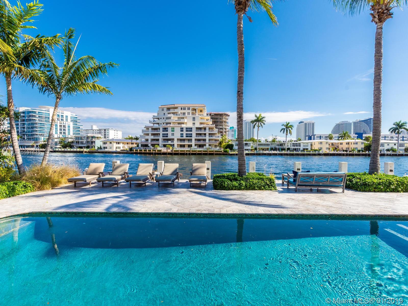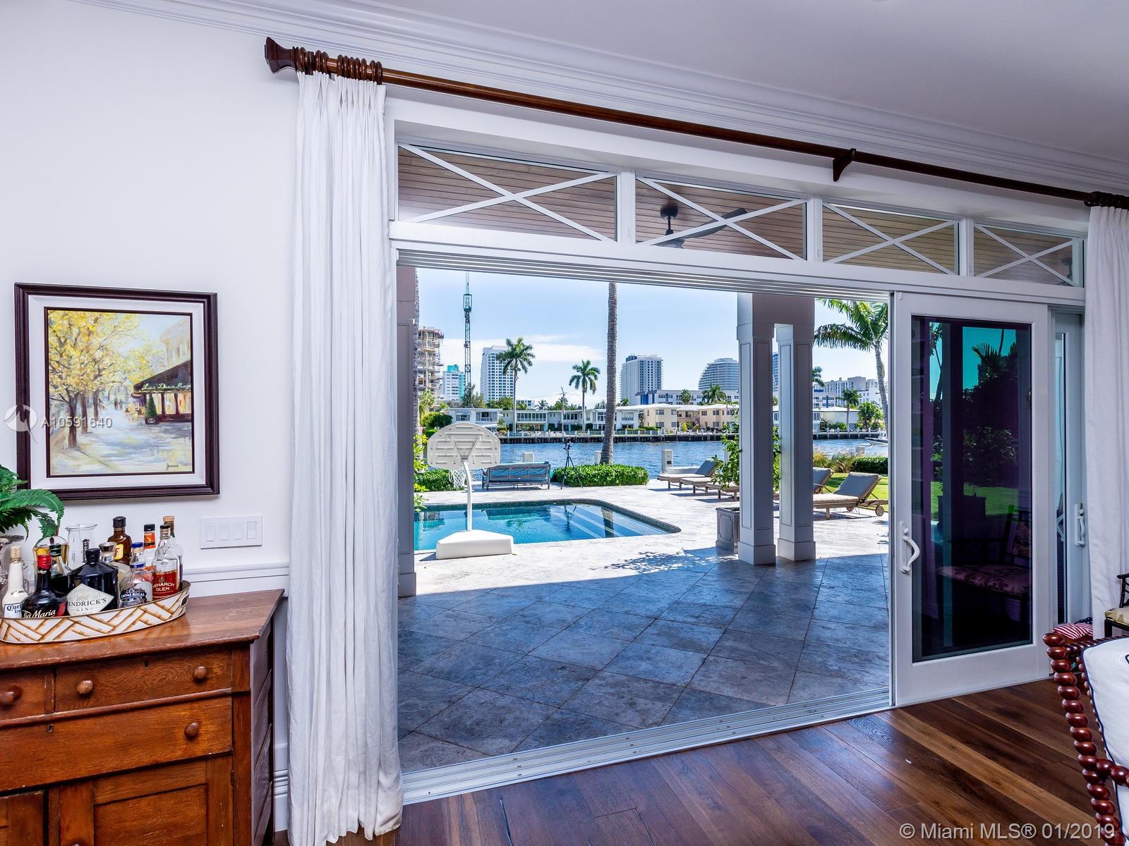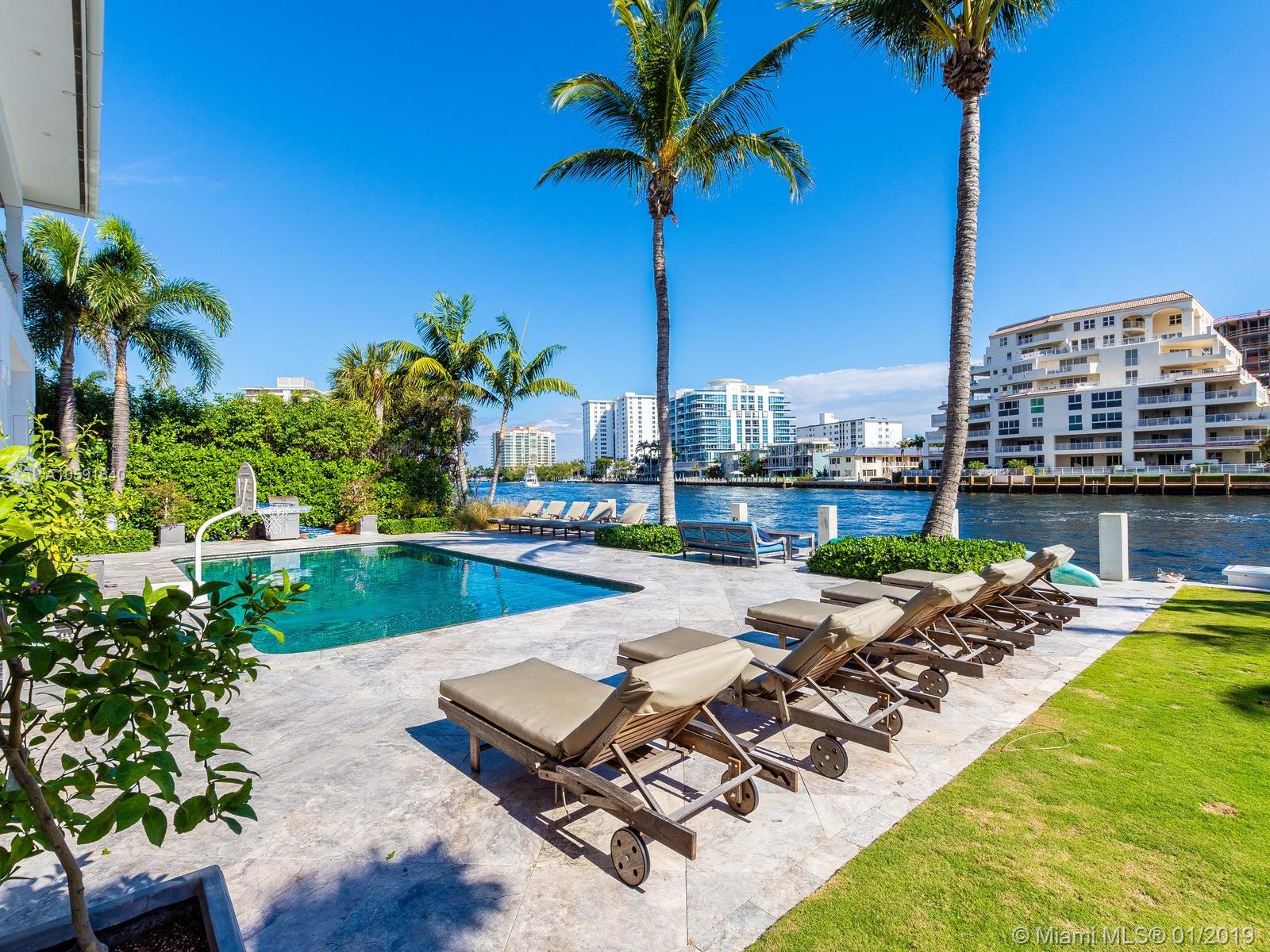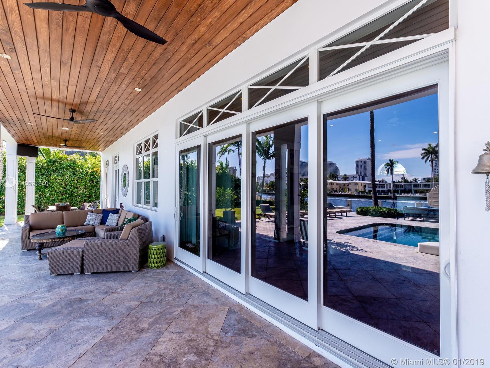 Exudes the feeling of "HOME" the minute you walk into this custom built designer British west indies style home which boasts 100' of Intracoastal Waterway, with an 80'X10' concrete dock. Complete with 6 FULL bathrooms in main house and 1 FULL bathroom in "Mother in Law Suite". Main house has 4 ensuite bedrooms, an office off of the kitchen and mudroom. The 4th bedroom has 2 bathrooms, "the bunk room", is 28'11" X 15' a total of 421.65 sqft designed to be converted into two bedrooms if needed. A wood burning fireplace in the upstairs family room. Custom built-ins. Open floor plan to maximize the Intracoastal Waterway views. Truly a unique home with top of the line kitchen and finishes throughout in the most sought out community in all of Fort Lauderdale, Sunrise Intracoastal.