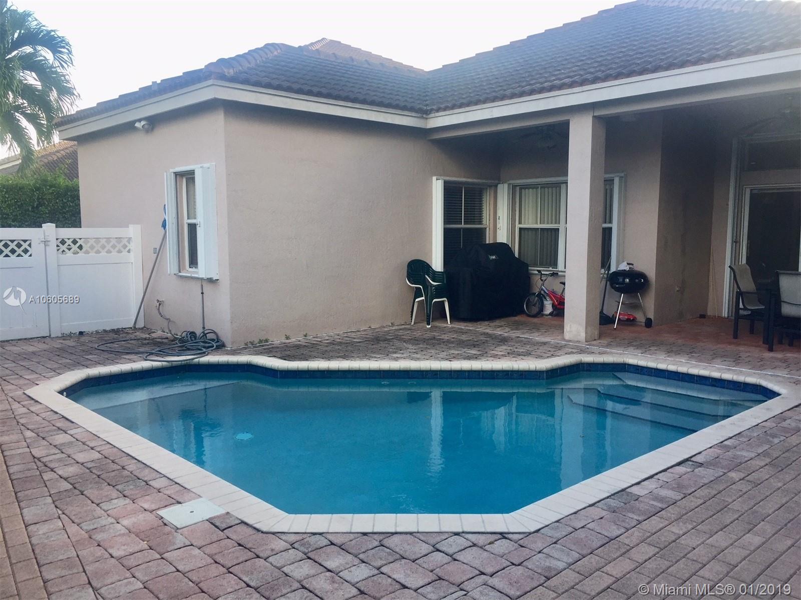 Beautiful 3 bed, 2 bath with a pool in Savanna in Weston, Florida. Property has a 2-car garage, modern stainless steel appliances, granite countertop kitchen, large capacity frontload washer & dryer, costumed designed wood California closets, wood floor in all bedrooms, and childproof fence around the pool. A/C unit is 4-5 years old. The schools for Savanna Community residents can go to Gator Run Elementary School, Falcon Cove Middle School and Cypress Bay High School. Tenants to move out May 7th 2019.
