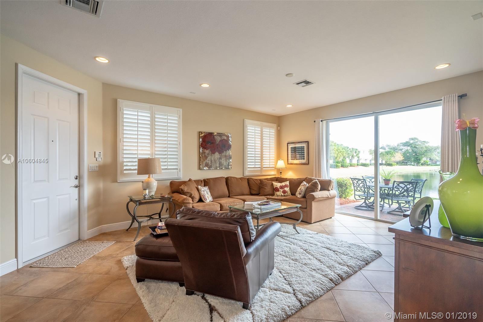 Gorgeous and immaculate corner unit on the water and next to the pool. Move-in ready, 3 bedroom/2.5 bath 2-story townhouse in highly desirable and conveniently located Saddle Bridge. Spacious and bright with open floorplan living area and numerous upgrades. Granite and stainless steel appliances in kitchen, hurricane impact windows, full-size w/d (upstairs), tile floors, carpet in bedrooms, peaceful and secure overlooking lake/preserve, centrally located near schools, shopping, major highways and airport. Low monthly maintenance includes beautiful community pool. Attached garage and security alarm, meticulously maintained, one-owner since built in 2009. Furnishings negotiable.