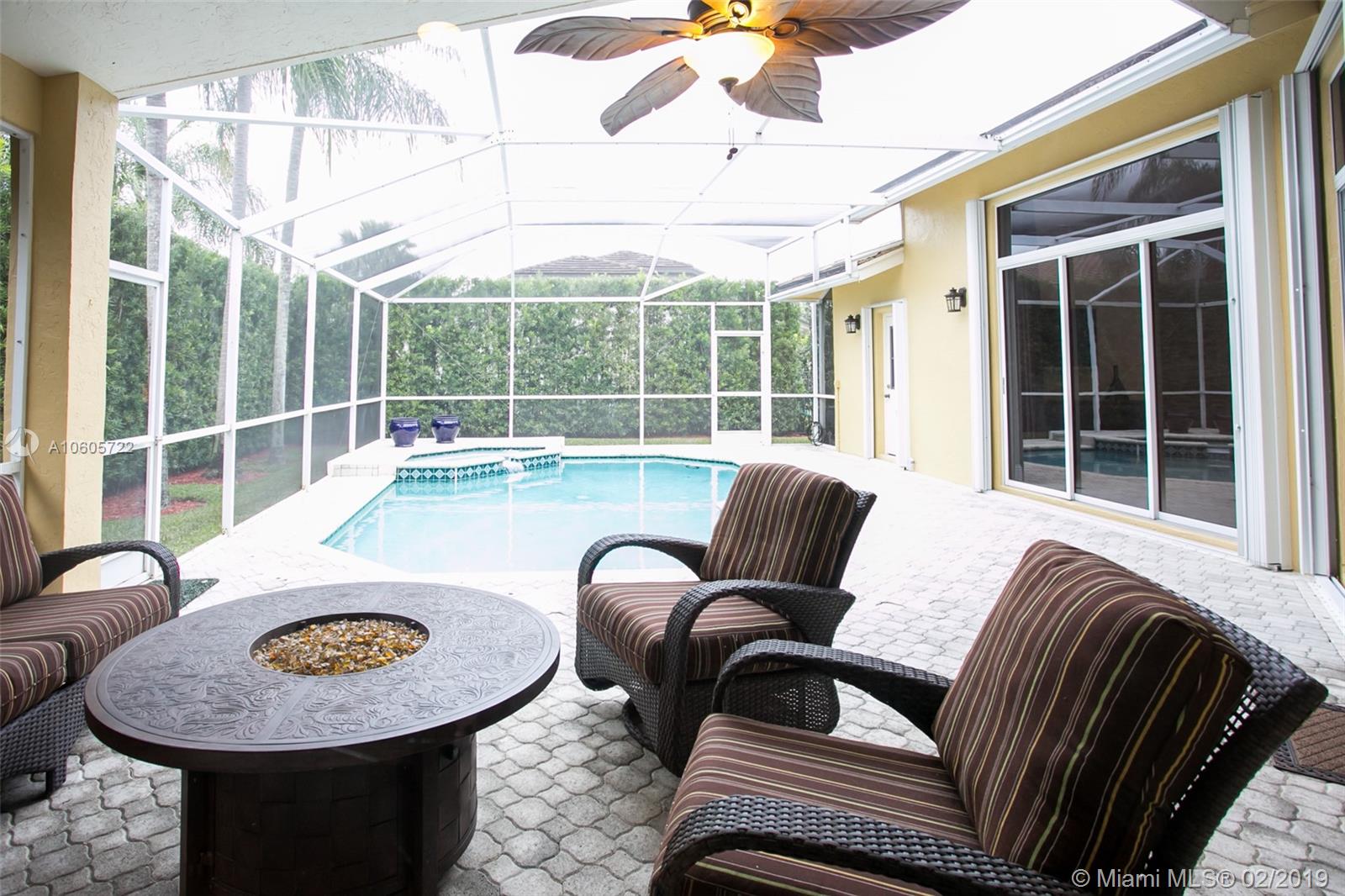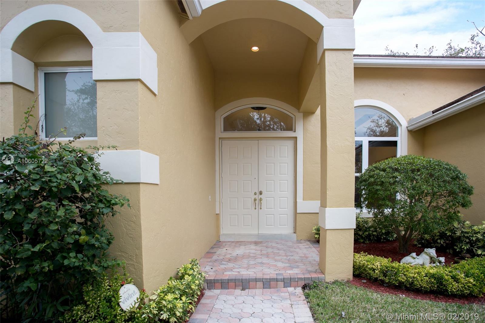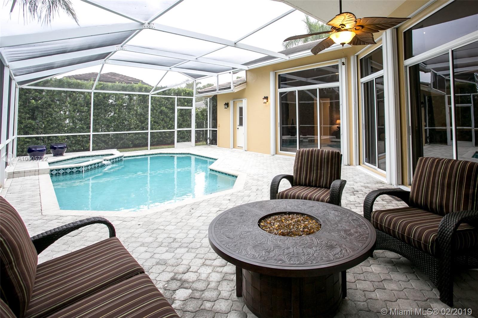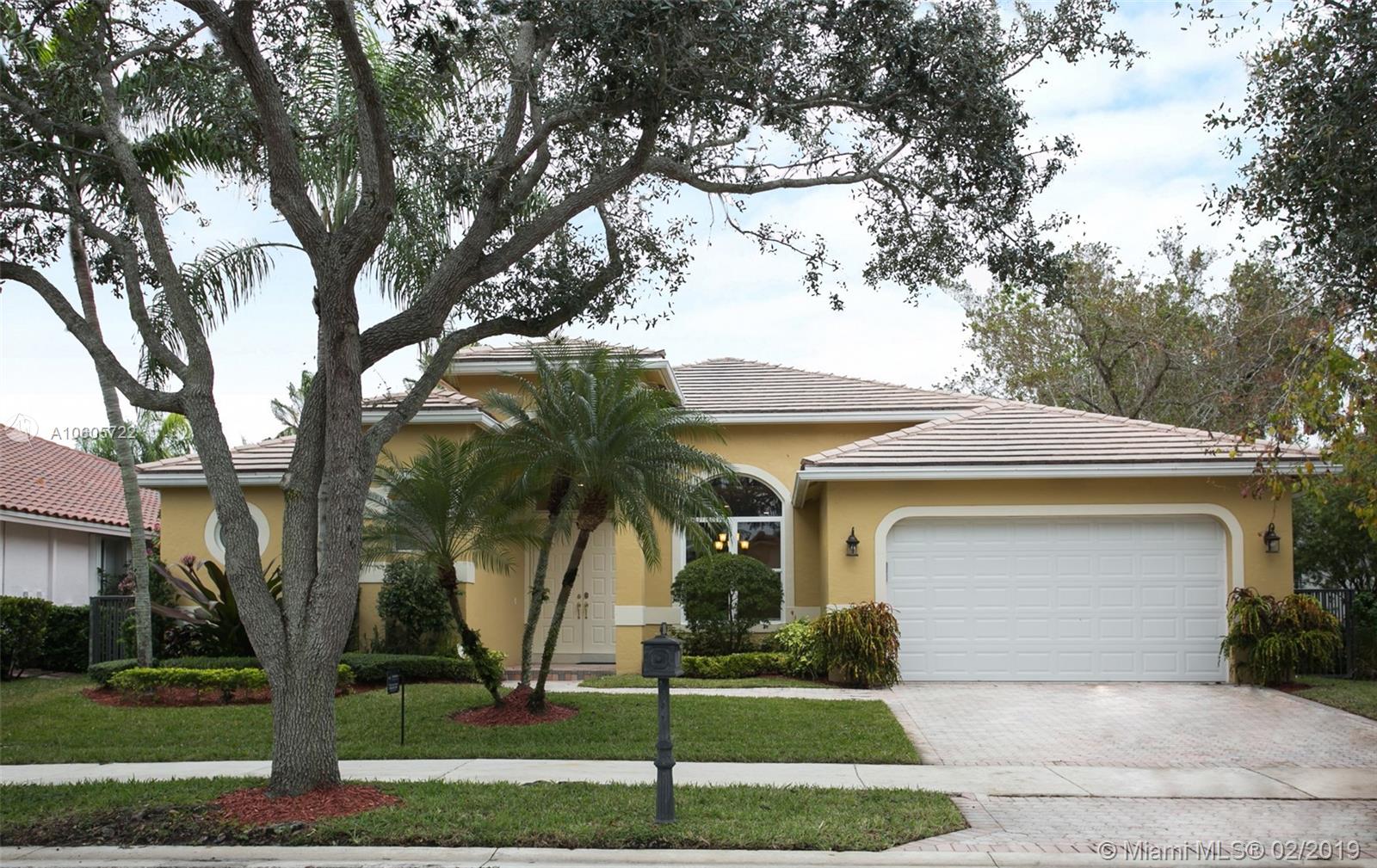 Move in Ready! Set in Weston Hills Country Club, this stunning 4 bedroom 3 bathroom home features a sparkling screened pool, raised spa and paver patio, perfect for enjoying Florida outdoor living! The yard is fully fenced and lushly landscaped for complete privacy! Updated kitchen boasts detailed custom wood cabinets, stainless steel appliances and unique granite counter tops. Tastefully remodeled master bathroom has custom wood cabinets, lighted onyx counters, slipper tub marble tile and flooring. Large neutral tile in living areas and wood flooring in bedrooms. Interior is freshly painted. Impact front windows, accordion shutters and new garage door for hurricane protection. Furnishings available!