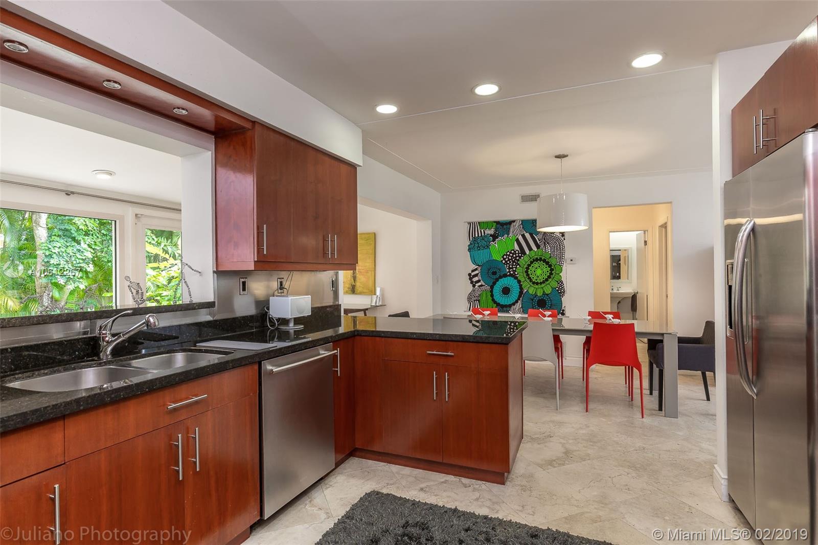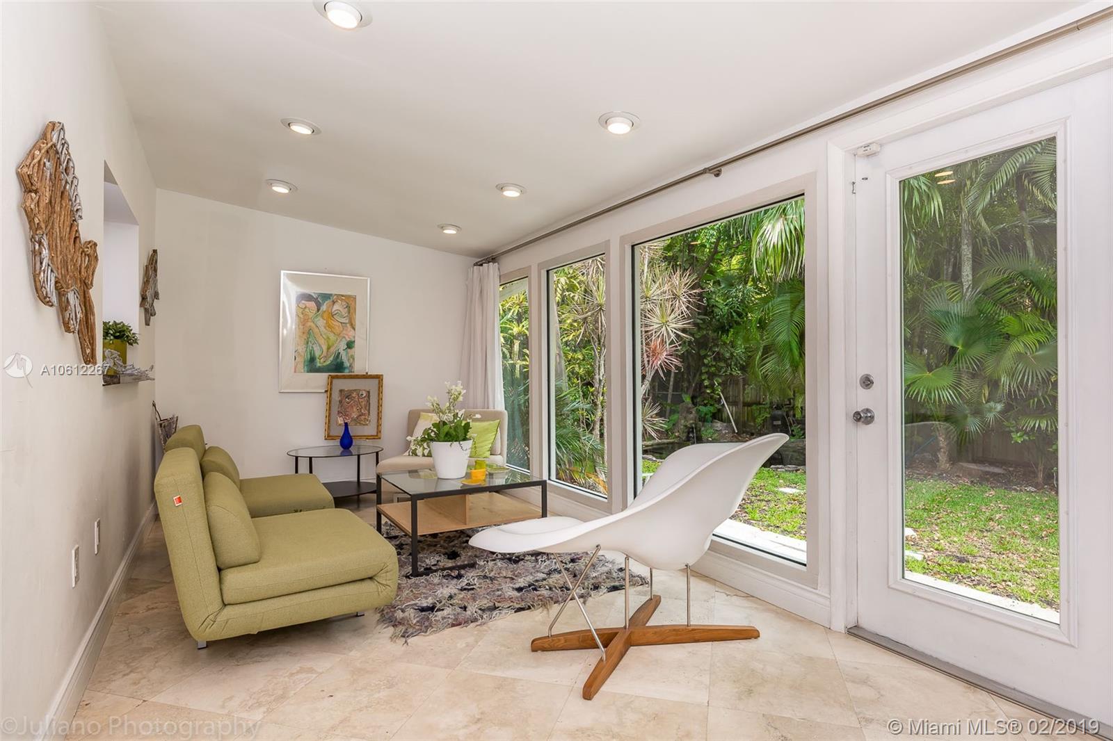 Beautiful Mid-Century Modern home in coveted South Grove neighborhood. Light filled interior spaces w/ white-on-white color palette throughout. Features include stone floors, new marble baths & renovated kitchen w/sleek wood cabinetry, stainless backsplash & high end appliances. Family room w/floor to ceiling windows opens to lush tropical garden w/enchanting Koi pond. Expansive garage w/vaulted wood beamed ceilings has potential to be converted to a luxurious master suite. Close to the Grove village center.