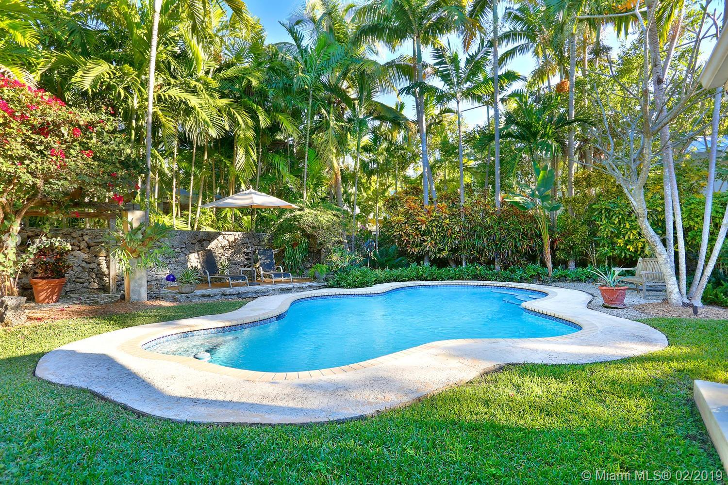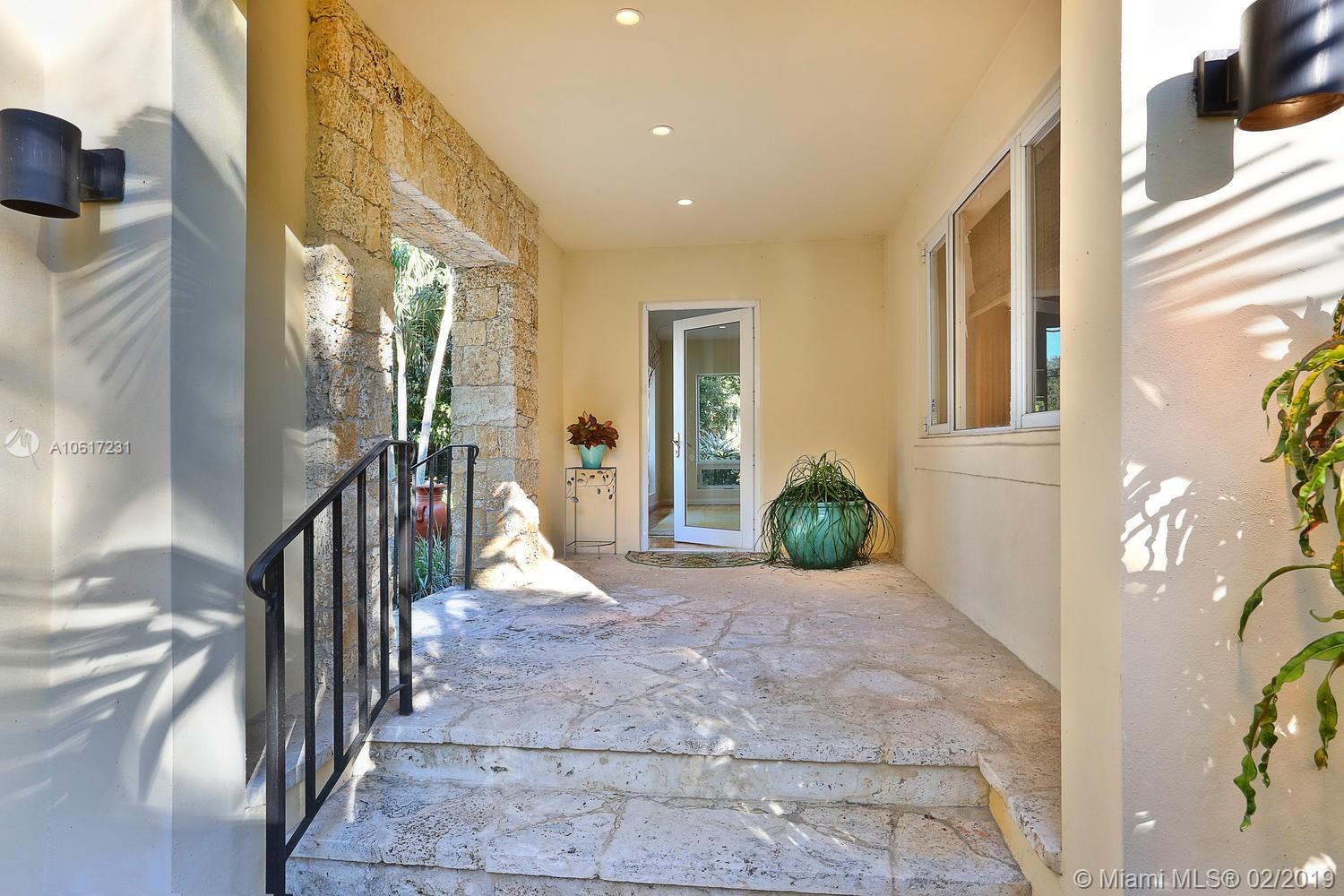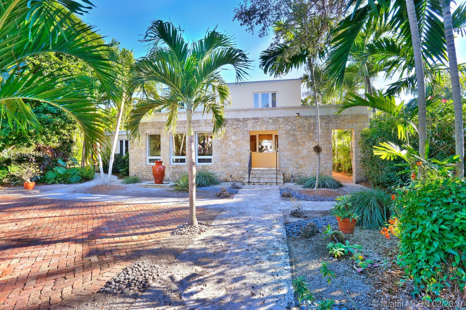 Architecturally unique home with striking coral rock facade, located on a quiet street in South Coconut Grove. The residence is walled, gated and surrounded by 14,000 SF of lush, tropical grounds. Renovation, restoration & expansion in 2005 by acclaimed architect Max Strang. Light-filled, expansive living spaces featuring grand foyer, formal living & dining, breakfast area, family room and den +office. Exquisite interior details include gleaming hardwood & terracotta floors and custom millwork/built-ins throughout. 2nd level master suite features over-sized walk-in closet & separate sitting room/office with fireplace. Enjoy year-round outdoor living & entertaining on the oversized “Old Florida” style screened porch that overlooks the ultra-private, magical garden and serene pool.