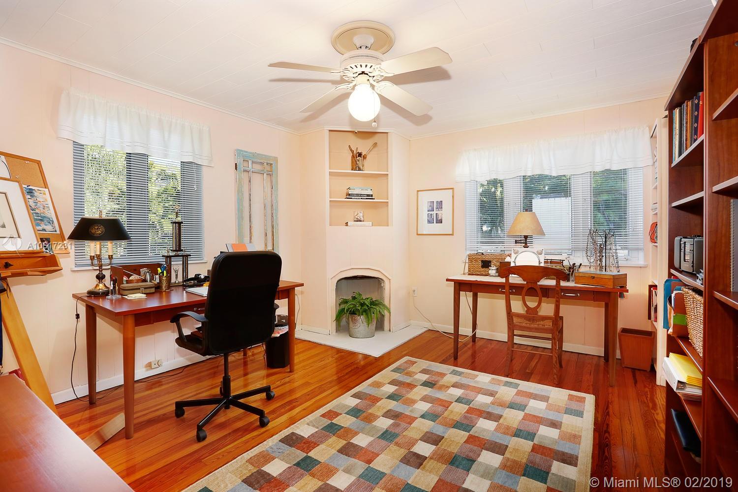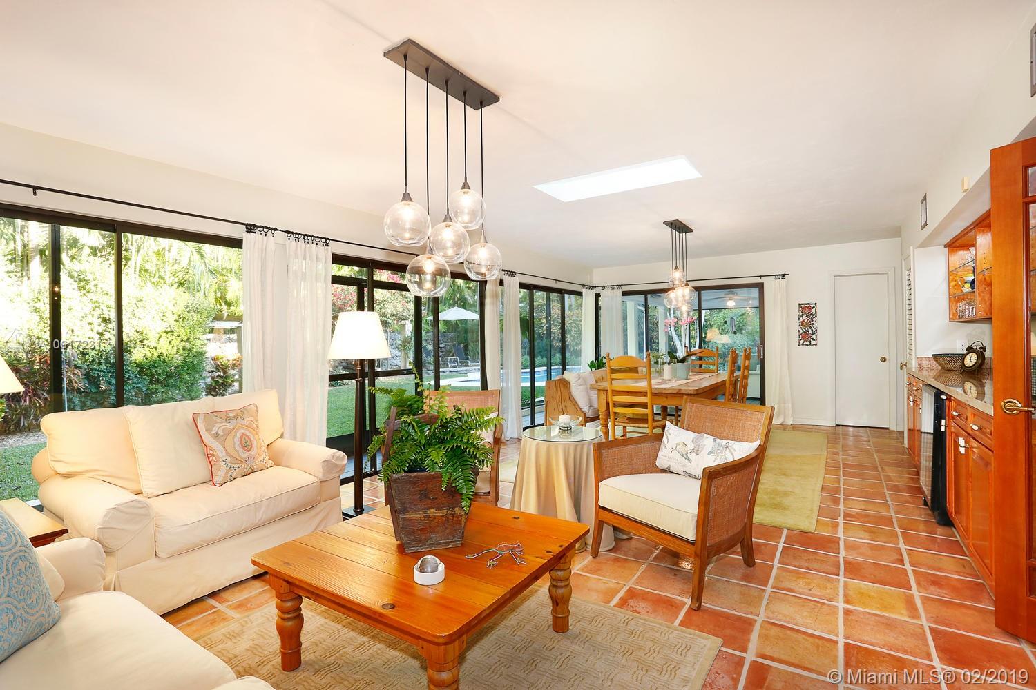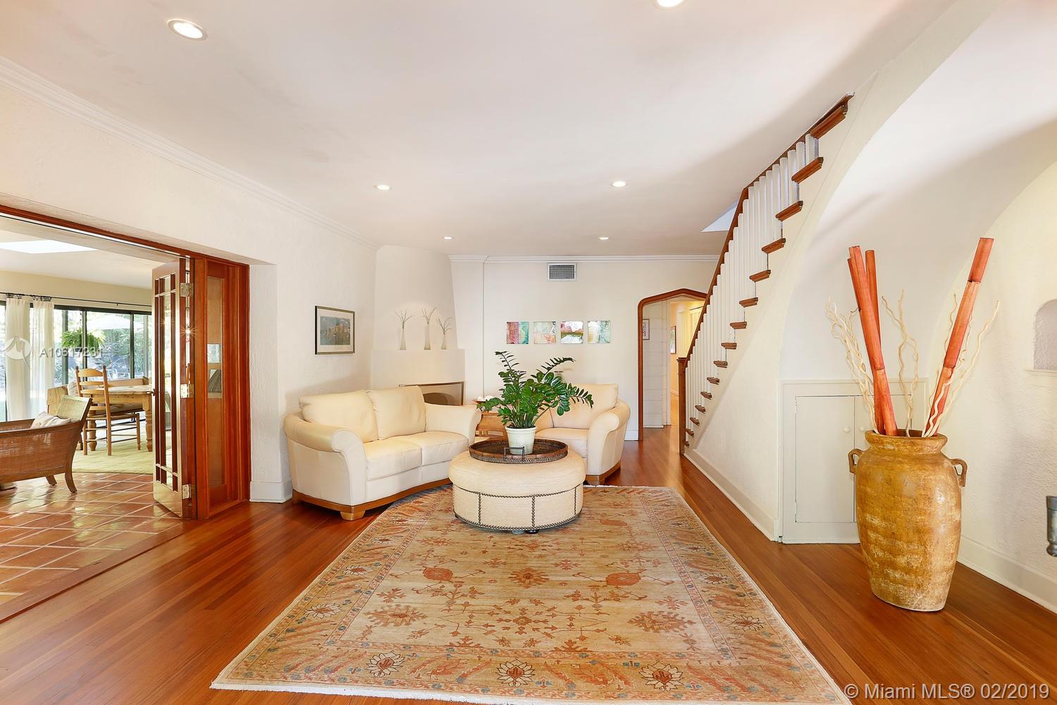 Architecturally unique home with striking coral rock facade, located on a quiet street in South Coconut Grove. The residence is walled, gated and surrounded by 14,000 SF of lush, tropical grounds. Renovation, restoration & expansion in 2005 by acclaimed architect Max Strang. Light-filled, expansive living spaces featuring grand foyer, formal living & dining, breakfast area, family room and den +office. Exquisite interior details include gleaming hardwood & terracotta floors and custom millwork/built-ins throughout. 2nd level master suite features over-sized walk-in closet & separate sitting room/office with fireplace. Enjoy year-round outdoor living & entertaining on the oversized “Old Florida” style screened porch that overlooks the ultra-private, magical garden and serene pool.