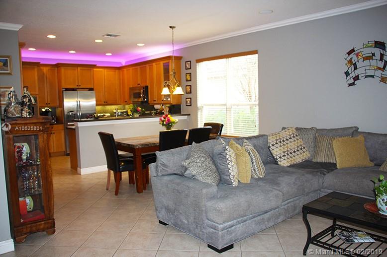Beautiful 4 bedroom, 2 1/2 bath home in Sunset Falls. Upgrades throughout with open design floor plan, all impact windows and doors, wood cabinets, granite countertops, stainless steel appliances, recessed lighting, surround sound system and much more. Separate laundry room with stainless steel appliances and sink. One bedroom conveniently located downstairs. Spacious living area and large enclosed patio for entertaining. Low maintenance includes security, guard gate, clubhouse, community pools and jacuzzi, gym, tennis and basketball courts. Located near transportation, shopping and great schools. Must see.