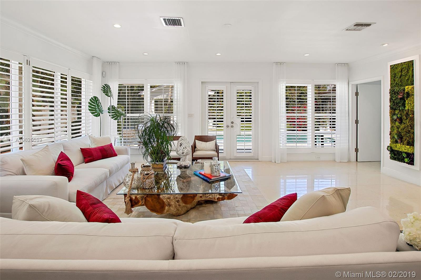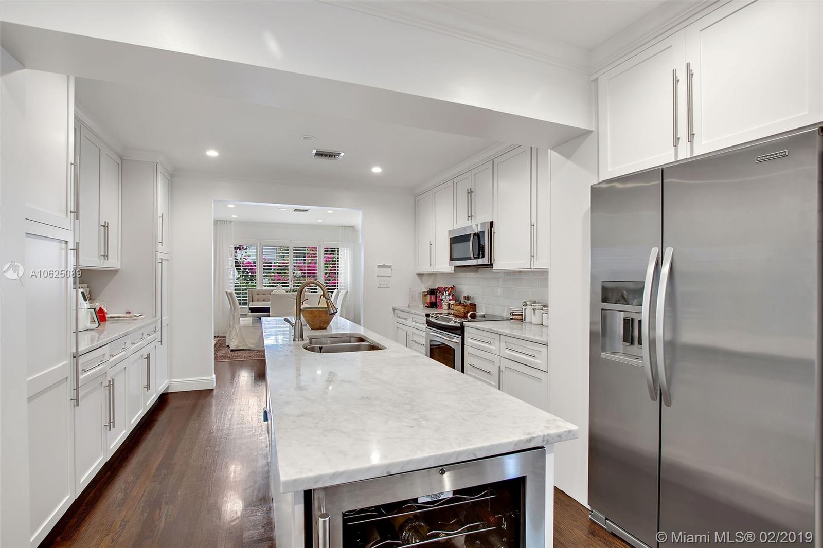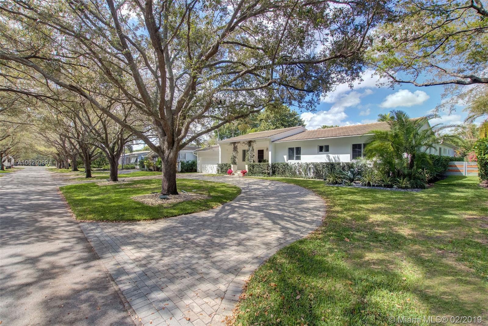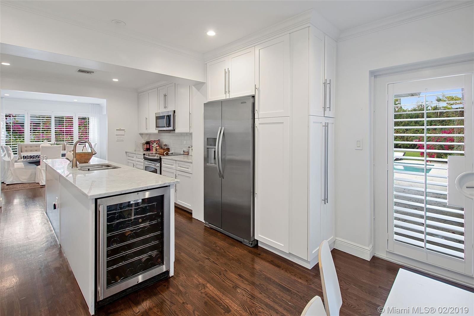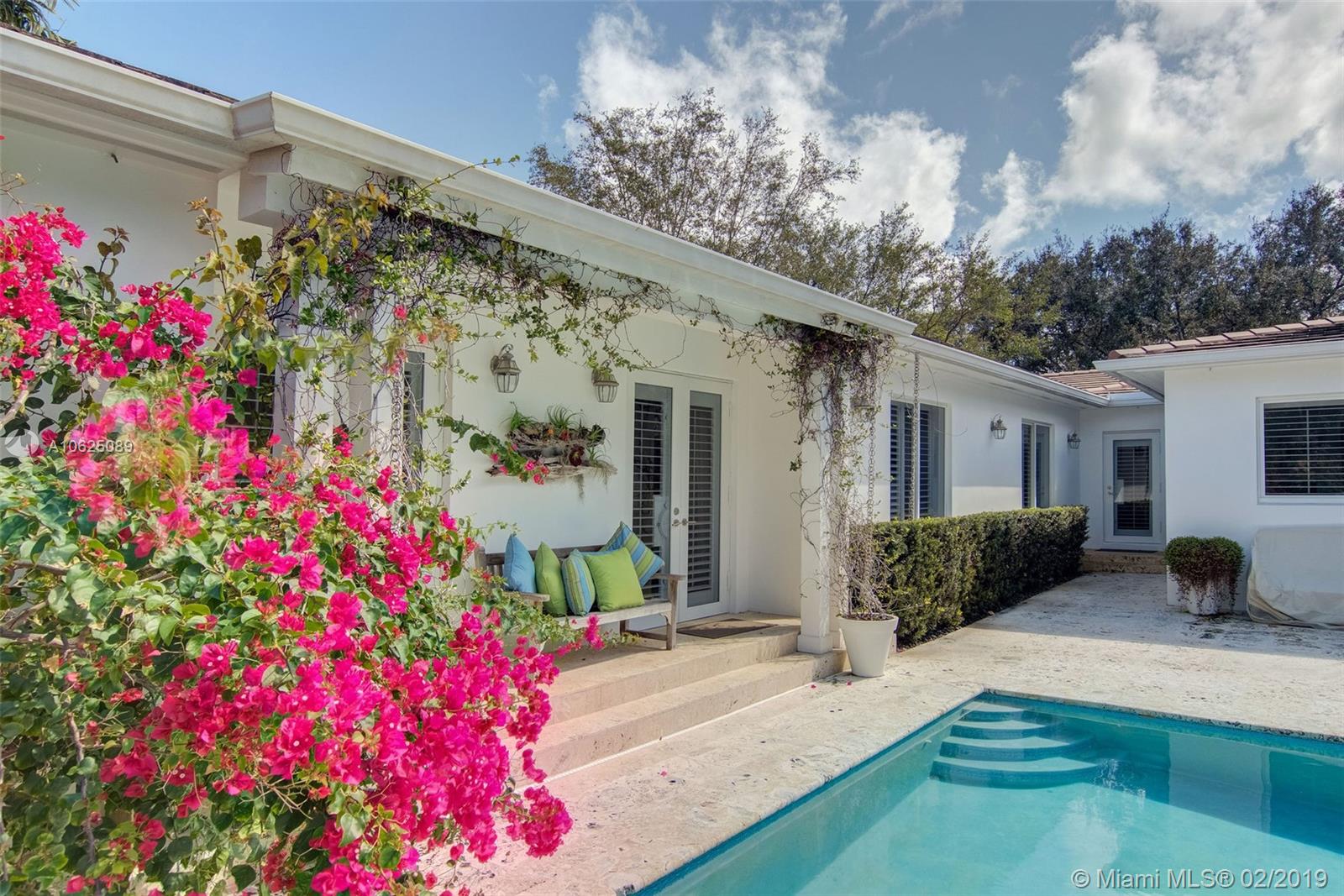 Relaxing ambiance defines this completely remodeled Plantation style home. Enjoy the beach house feeling as you enter the living/dining room, abundant natural light, white plantation shutters & beautiful garden/ pool/gazebo view. Elegant wood floors throughout the house, marble in living room, French doors open to the garden, high impact windows, comfortable floor plan, 5 bedrooms w/ private bath + a cabana bath. Kitchen connects two areas of the house, white wood cabinets with Carrara marble counter top, SS appliances & wine cooler. The summer kitchen by the pool is the perfect place to entertain any time of year, grill, refrigerator, ice maker & sink. Oversize lot, lush landscaping & gorgeous Bougainvillea.