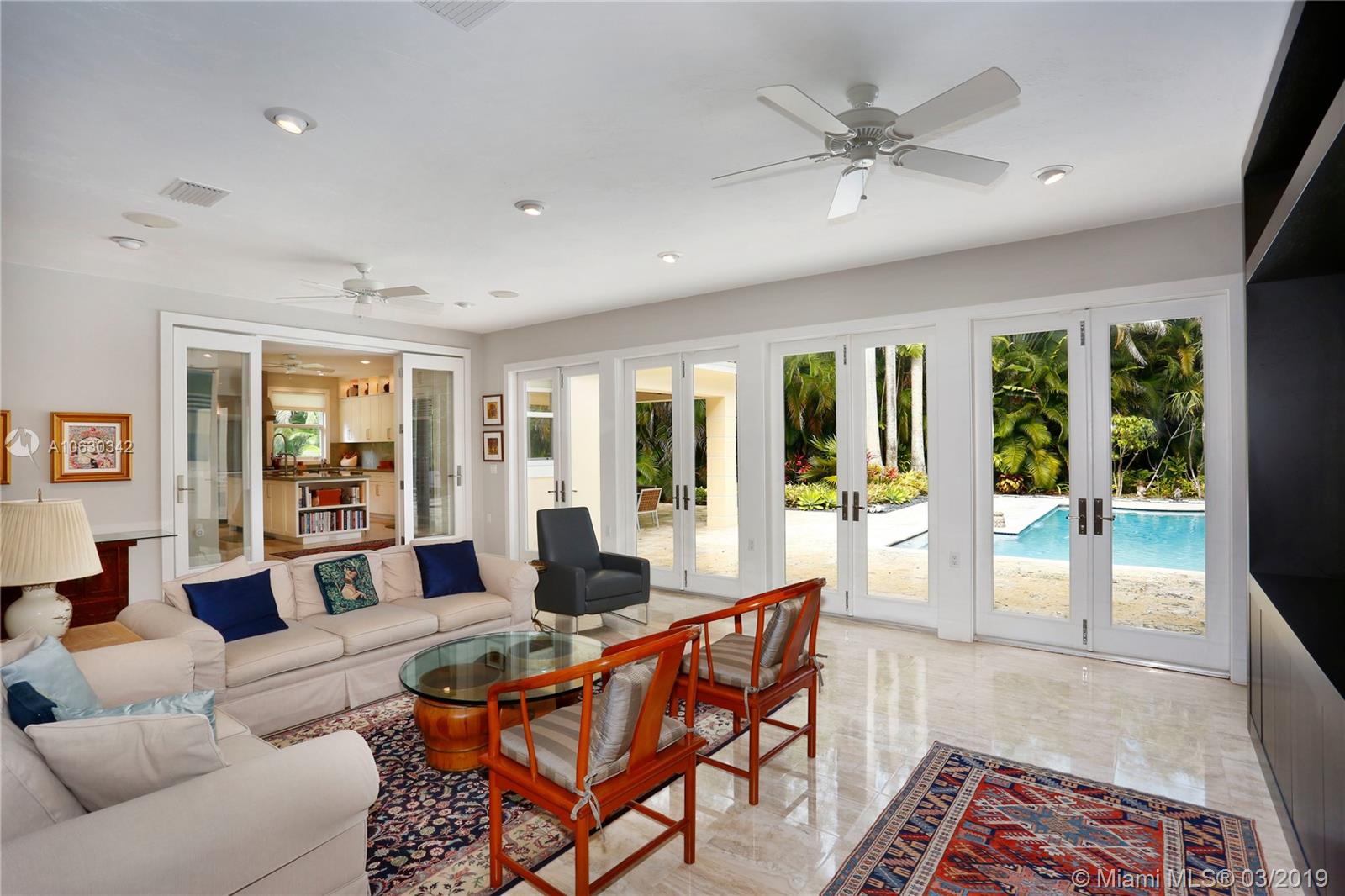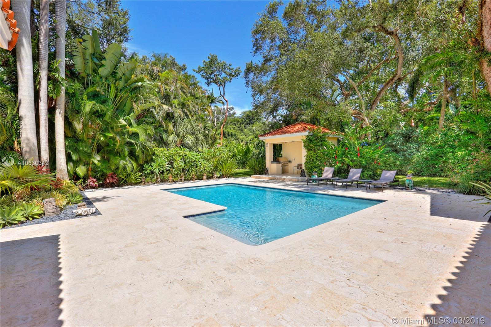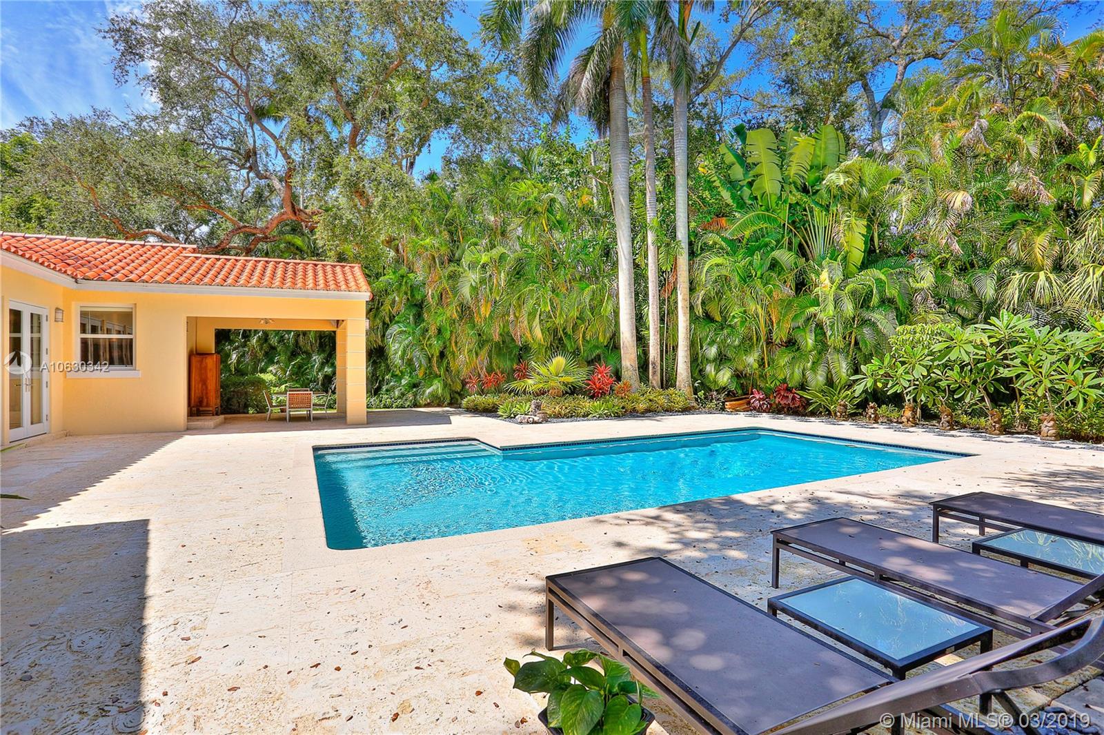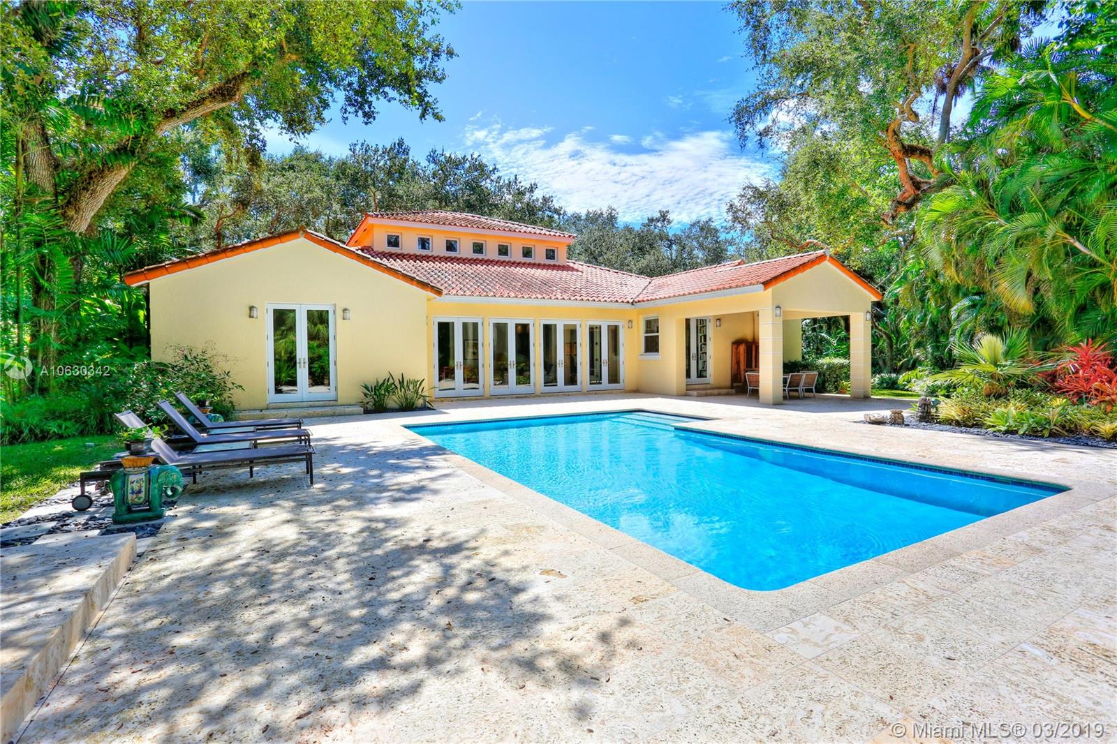 Absolutely beautiful home on private tree lined street in South Gables. This 5 bedroom, 6 bathroom home has been exquisitely updated including a newly enclosed family room, new gourmet kitchen, new master bathroom, full house generator, and impact glass windows and doors. Magnificent oaks and lush landscaping welcome you into this gated property and fabulous one story house with center great room with vaulted ceilings. Generous rooms and split plan make this home so wonderfully livable! The backyard features a newly resurfaced pool, covered patio and outdoor summer kitchen with cabana bath, all on the most private 27,000+ square foot lot. 2 car garage, laundry room, gym, and Pinecrest Elementary!