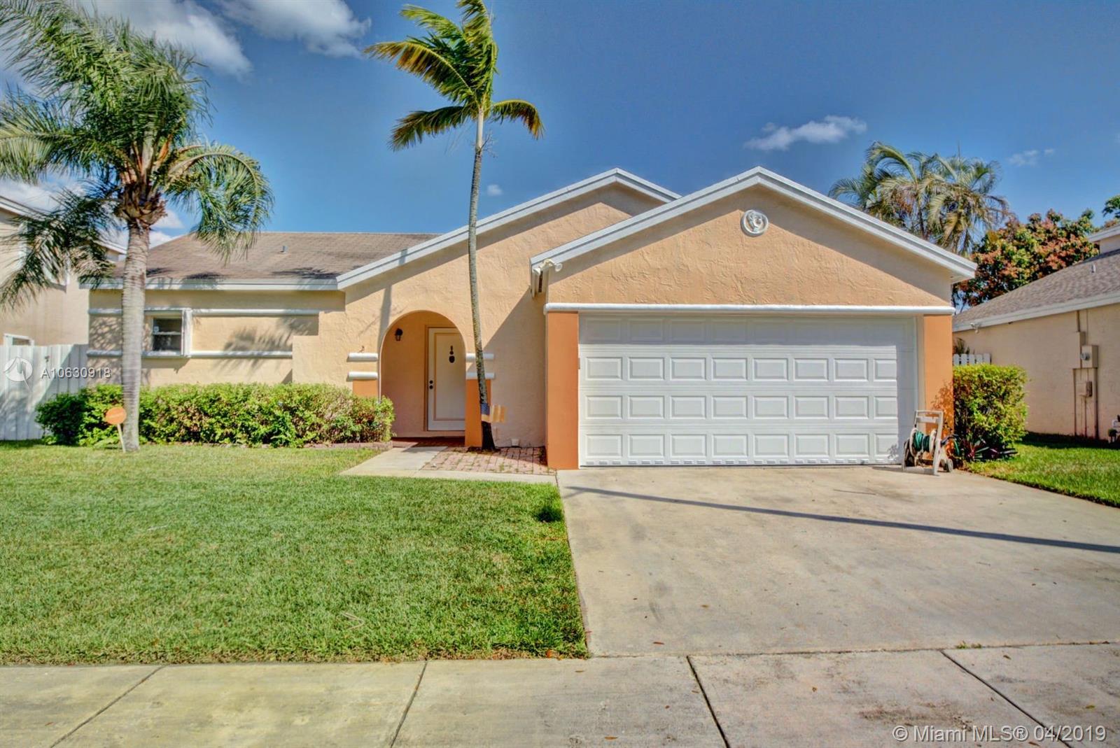 Gorgeous 1 story home in pristine condition! This home features large social areas, upgraded kitchen with stainless steel appliances, ceramic tile & wood flooring, plantation shutters, elegant light fixtures, french doors, upgraded bathrooms, garage door hurricane proof, accordion shutters (except patio sliding door kitchen). Master suite with large walk-in closet, dual sinks & shower/tub. New washer & dryer, water heater, electrical panel, alarm system, smoke detectors. Roof was replace in 2010. A/C unit was changed 5 years ago. Fenced backyard with large screened covered patio, perfect for entertaining, lush landscaping with mango trees. Close to schools, shopping and main streets. Low association fee. Must see!