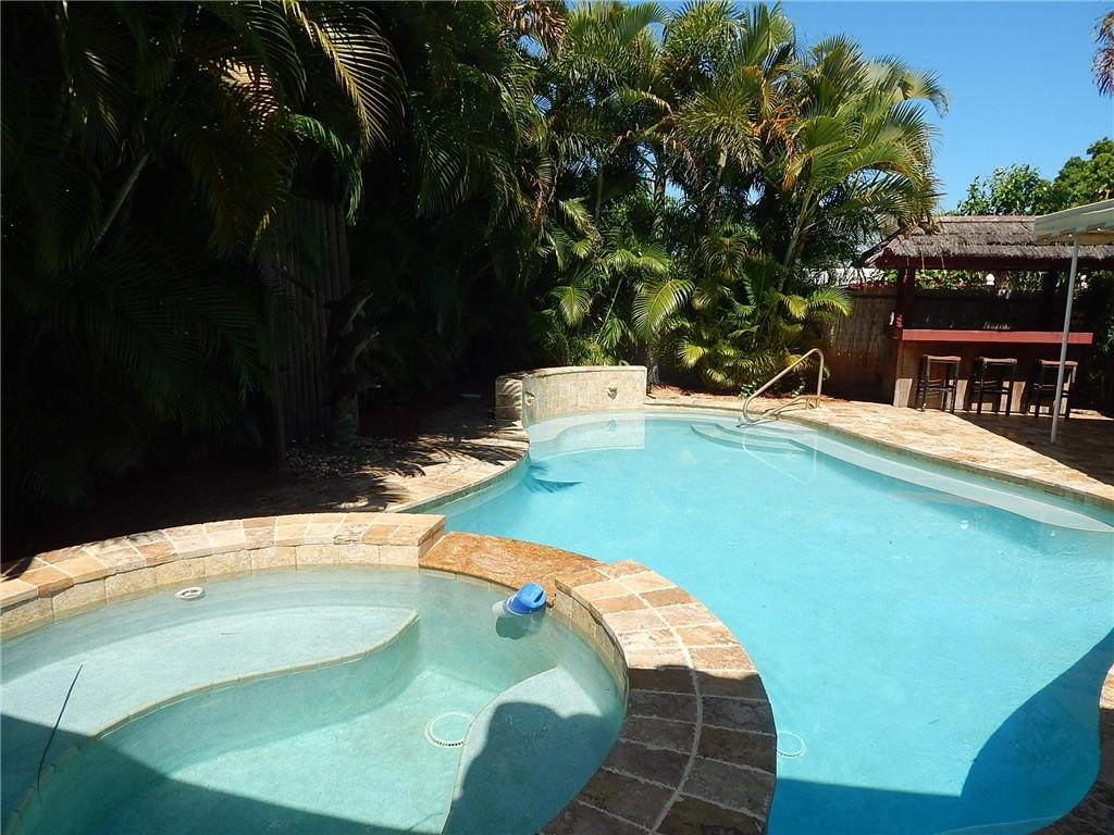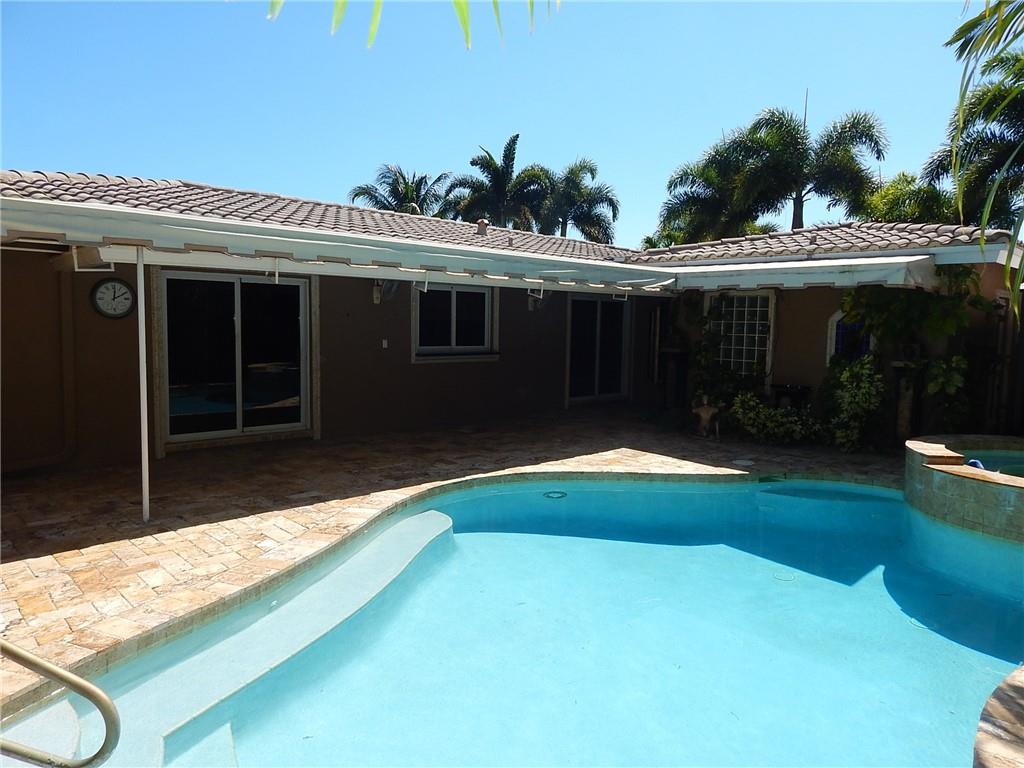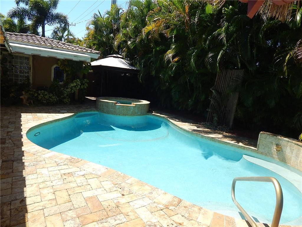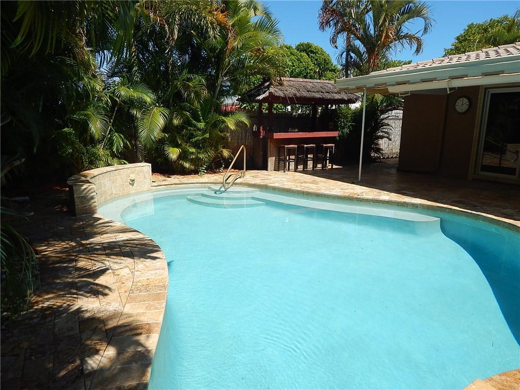 Priced below tax assessor just market value! Live in northeast Fort Lauderdale in this 3-bedroom tropical oasis pool home with a two-car garage. Wood flooring throughout, granite counter-tops, cherry wood cabinets, crown molding, large master bedroom with over-sized walk-in closet. Master bath has separate spa tub, full sit-down shower, dual sinks and cabana door to pool area. Large living area with extra room off kitchen that can be used in many ways. Private fully landscaped fenced backyard with pool, spa, lighting and covered areas for entertaining. Outside shower, kitchen has pass through window to back. Shed and Tiki Bar. Impact glass windows. Built in generator. Close to many local parks and activities. Near Commercial and Federal Hwy shopping, dining and beach corridor.