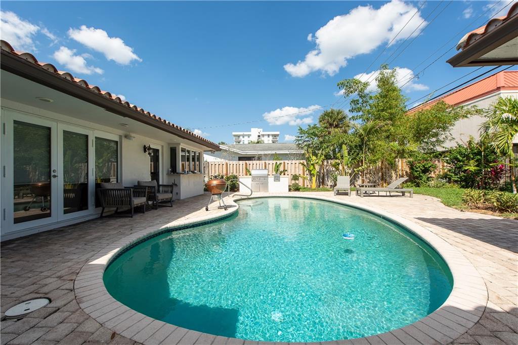 Enjoy the ease of East Fort Lauderdale living in Imperial Point. This open floor plan 3-bedroom home is situated on the east side of Imperial Point, providing easy (walking or biking) access to shopping and dining. Meticulously maintained, the curb appeal is apparent upon arrival - visitors are welcomed with beautiful landscaping, paver driveway and walking gate garden entry. Just a few of the interior features include porcelain tile floors throughout with wood floors in bedrooms, modern updated baths with frameless glass showers, custom craftsmanship and marble stonework. Enjoy magnificent light, bright, and spacious living areas, large island kitchen overlooking living room and opening up to pool area. Summer kitchen and built-in grill. New A/C's and hurricane impact windows & doors.