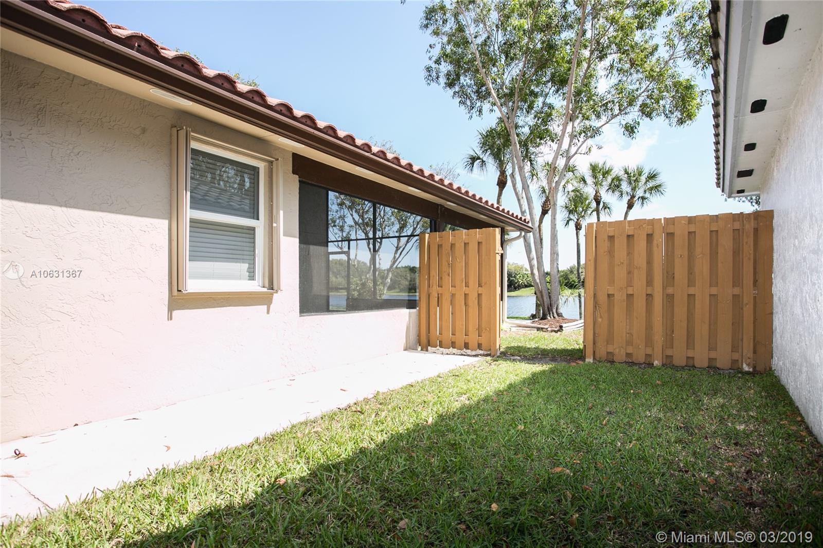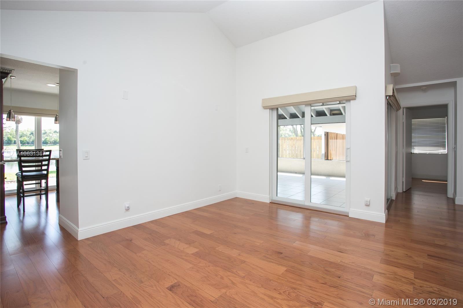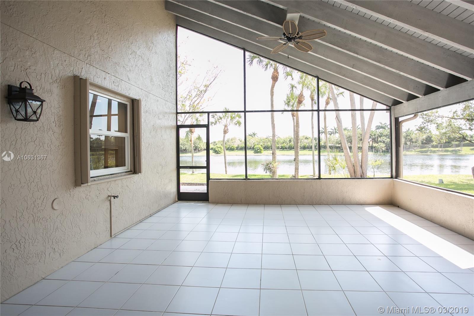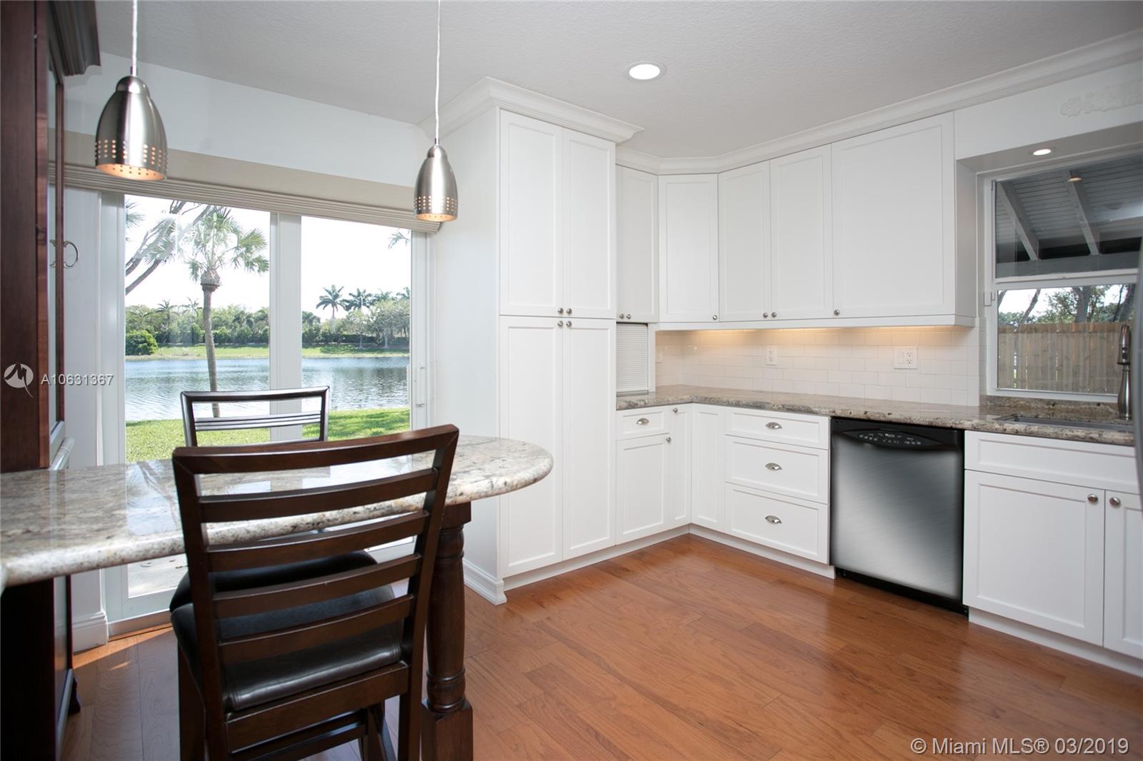 Move in Ready! Completely updated 3/2 one story set on a private lakefront lot with WIDE WATER VIEWS and no neighbors behind. Spacious 400 sq ft covered and tiled patio is perfect for entertaining or just relaxing. Tastefully remodeled eat-in kitchen boasts white Shaker style cabinets, unique granite, subway tile backsplash, undermount lights, and stainless steel appliances. Bathrooms have also been redone with wood cabinets, neutral tile and trendy fixtures. High quality wood flooring throughout. The ceilings are textured and completed with LED lights. All doors and windows are hurricane IMPACT glass, no stress during hurricane season! Association fee includes lawn maintenance and sprinklers as well as community pool which is just steps away!