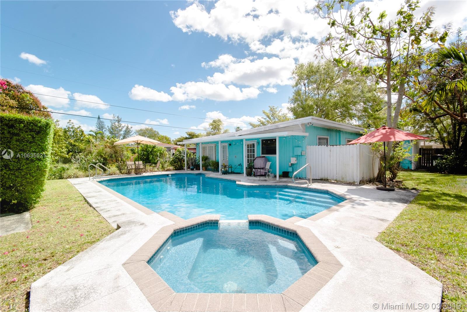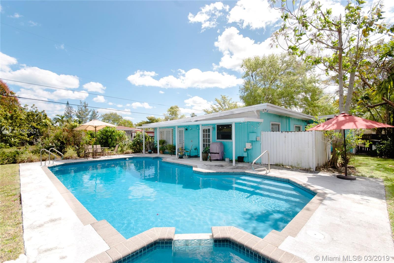 Beautifully designed mid-century home on oversized lot, close to everything. This home features a total of 3 bedrooms, 2 of them can serve as masters and 2 bathrooms, one of them is a cabana with access to pool area. The lot is completely fenced in and private with stunning tropical plant species and separate garden structure for storage. Kitchen, living room, and dining room have open plan concept perfect for entertaining. Corner lot with circular driveway and stunning approach waiting for the perfect buyer that appreciates this home's charm.