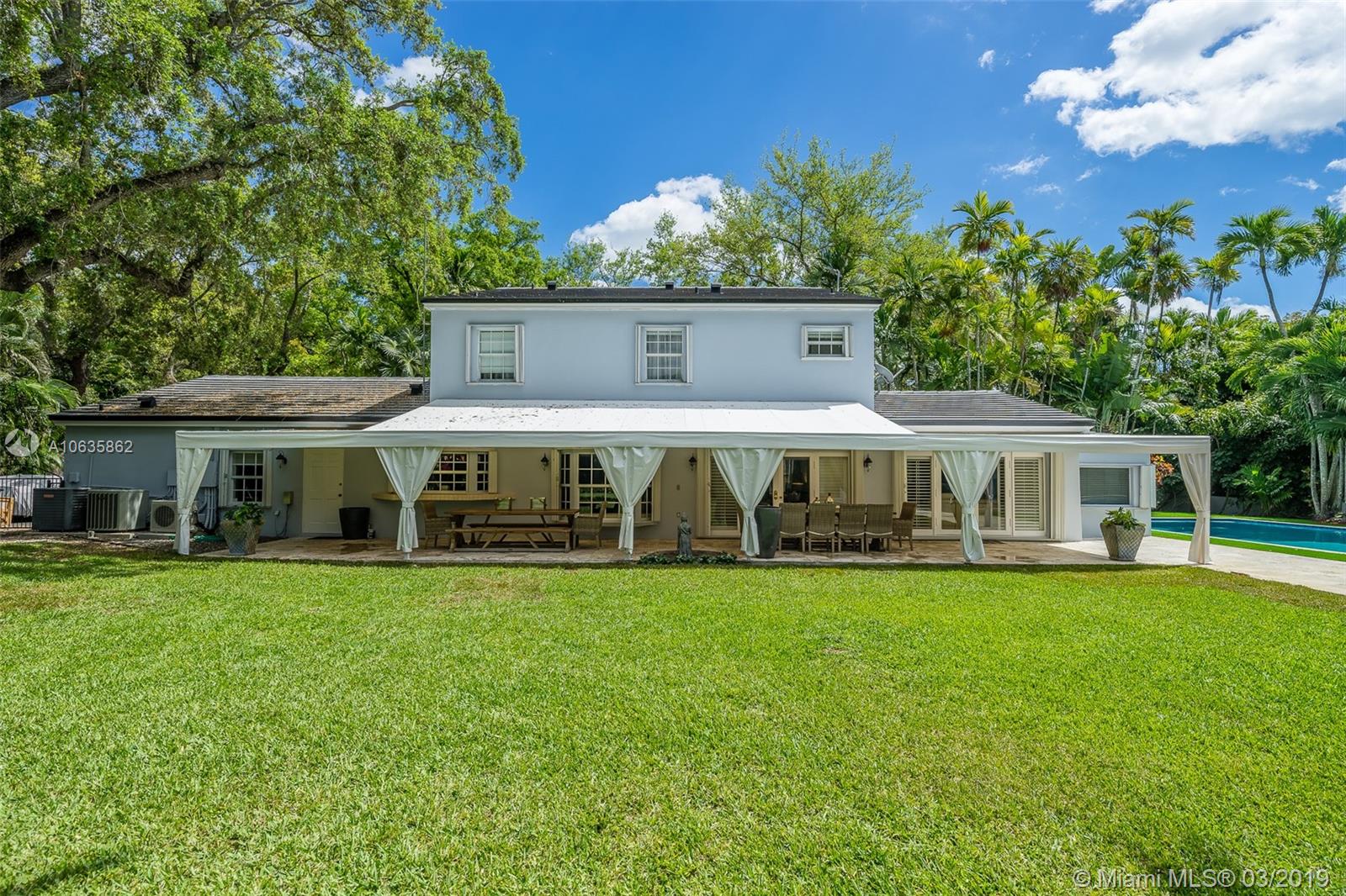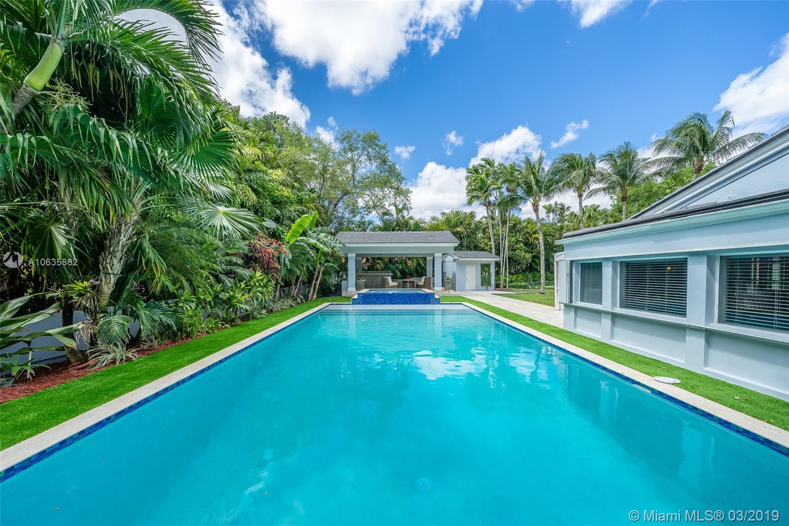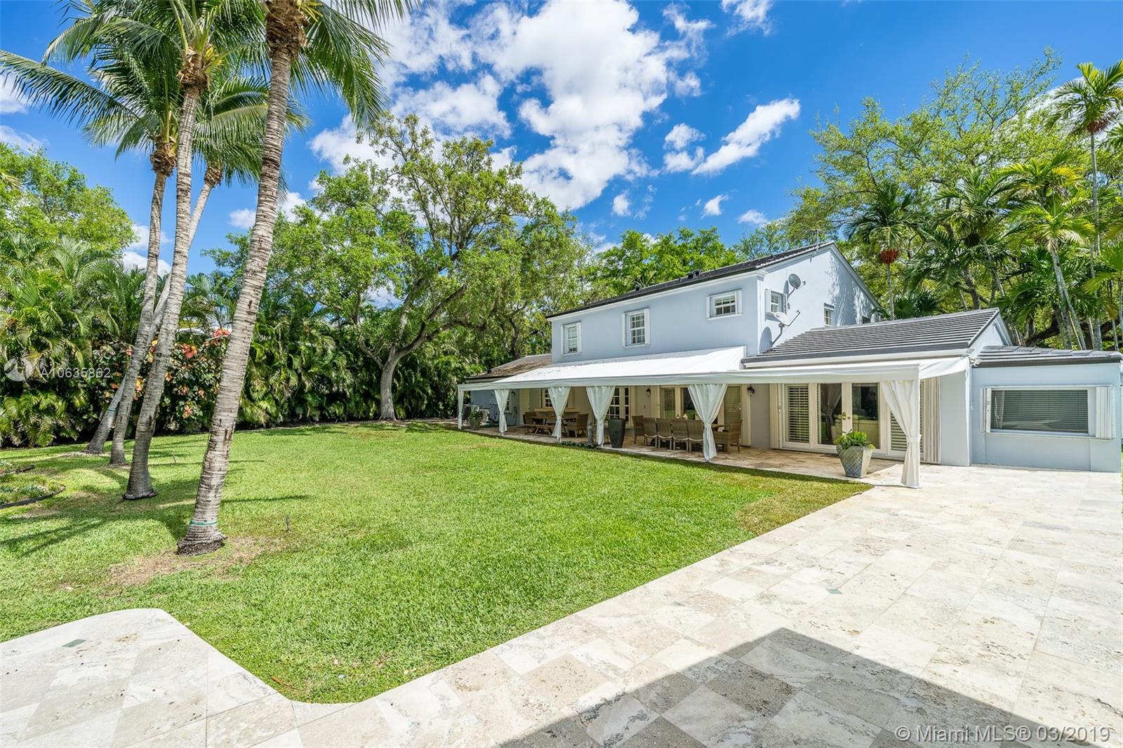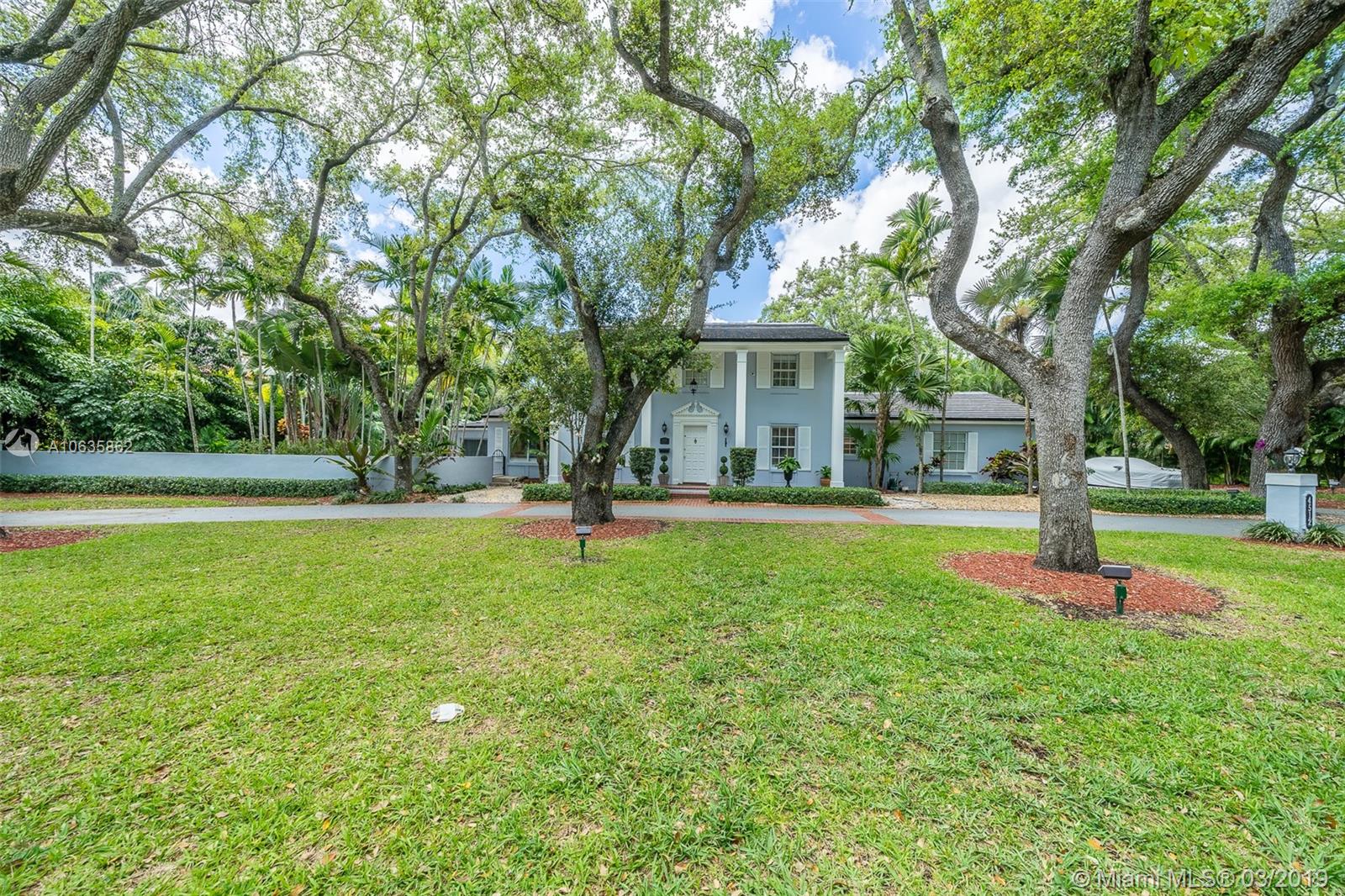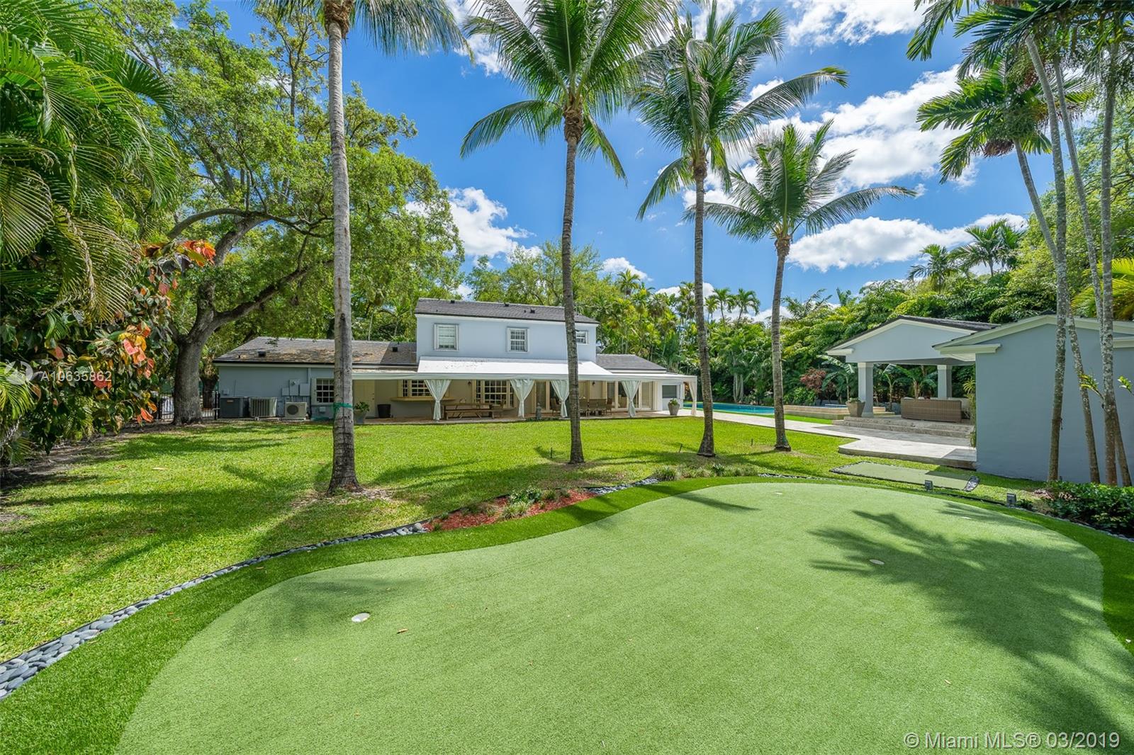 Beautiful corner Colonial Home on oak filled 21,000 sq ft lot! This stunner features a newly remodeled oversized pool and jacuzzi next to a great gazebo, custom putting green with summer kitchen and outdoor cabana bath. The yard space on this house is absolutely off the charts! Marble and wood floors throughout this well designed home. A natural chimney is the center piece of this house with generous living spaces, a kitchen featuring granite and stainless steel appliances, a new roof, an FPL installed generator, and an all around positive vibe! Do not miss out on viewing this Coral Gables gem!!