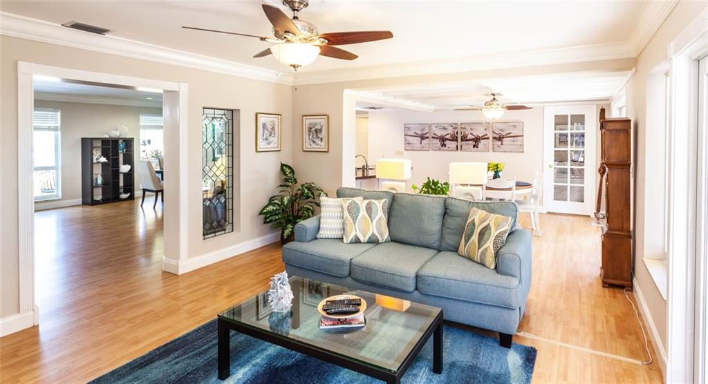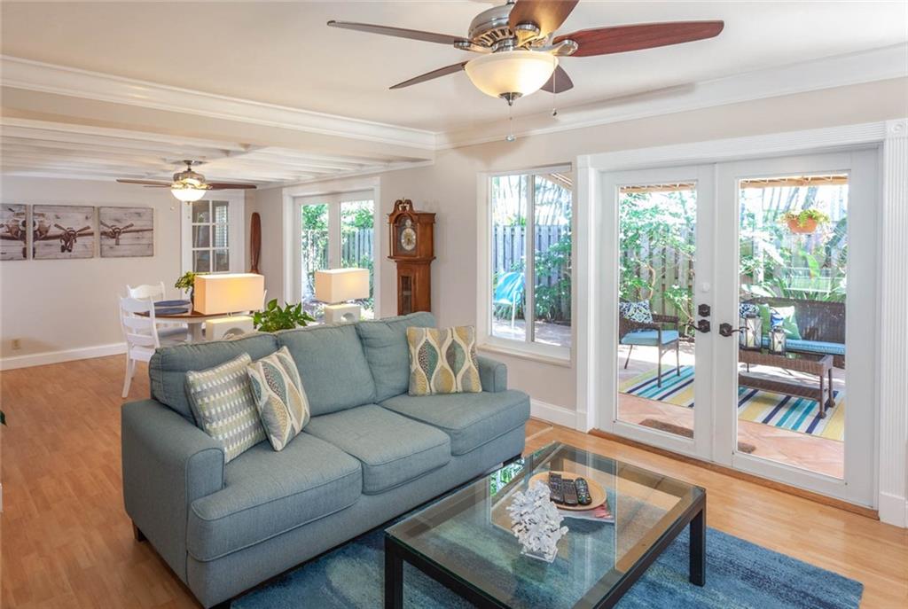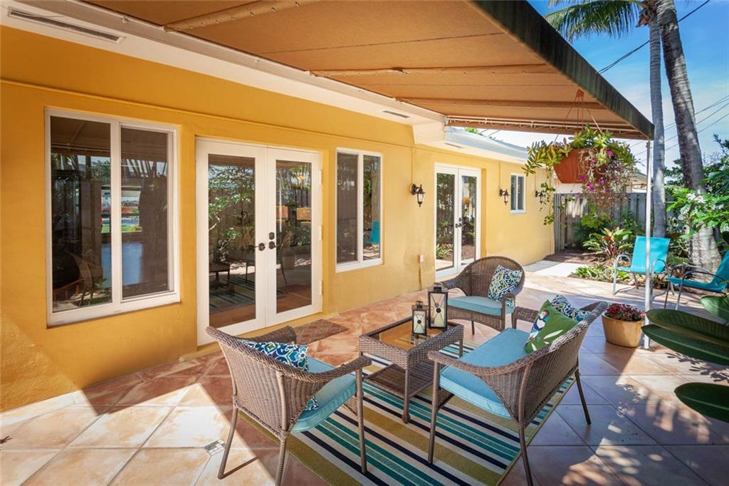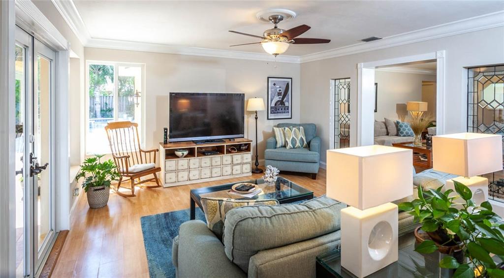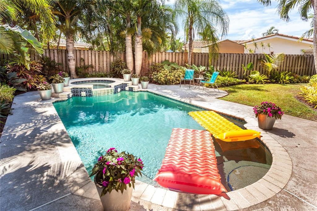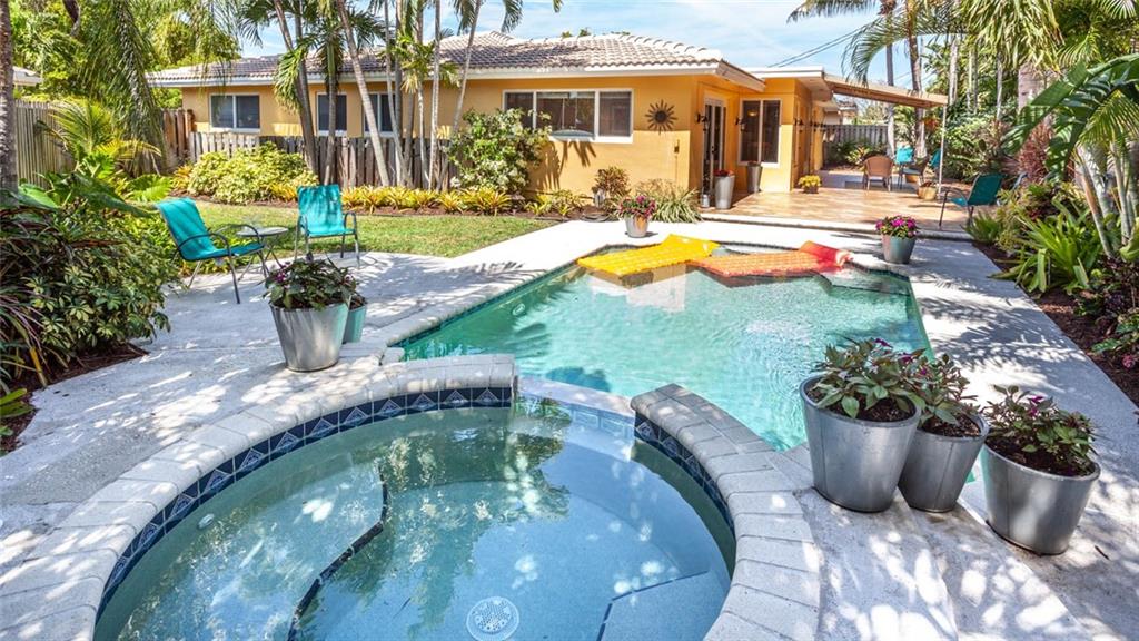 Discover this tropical pool home in the heart of Northern Ft Lauderdale conveniently located close to the beach, shopping, restaurants, excellent schools & I-95. Updated & lovingly maintained this home features almost 2000 sq ft under air with a designated foyer, living rm and family rm, formal dining area & casual dining area, a custom office with built-in desk and cabinets, all impact windows & doors, crown molding, a stylish white kitchen with SS appliances & granite counter tops, garage and unique details like the leaded glass inset dividers off the living areas. 3 sets of French doors open to a spacious covered patio, heated pool with spa & waterfall with mature tropical landscaping. Outdoor lighting really makes the evenings glow as the lush landscaping is meticulously highlighted.