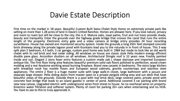 Beautiful Custom Built 5BR/4.5 BA, Swiss Chalet Style Home on park like setting on over 1.28 acres w/pool & 3CG. Private electronic entry gate w/video camera at bridge entry provides 24 hour recording surveillance. Mature oaks, royal palms, fruit and nut trees provide shade, beauty and tranquility. Private lagoon pond with fountains lead you to the rotunda in front of house. Elegant 2 story foyer entry features a custom wood staircase w/imported European antique tile. Living area features beautiful solid oak floors w/crown molding. New carpets in bedrooms. Eat in kitchen w/breakfast nook has marble floors & European wood cabinets, granite counter tops and s.s. appliances. The entire 2nd floor is a huge master suite. Private pond w/foot bridge that leads to island gazebo in center of pond.