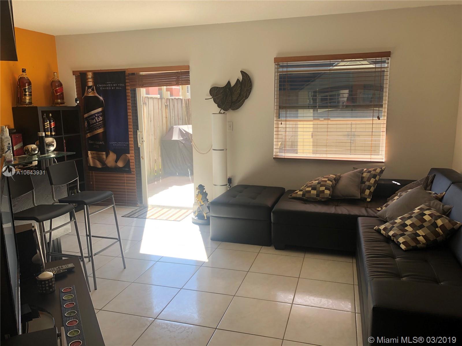 Beautiful and very well maintained 3 Bed, 3 bath townhouse located in the Hialeah (1 room on the first floor, and 2 rooms on the second floor). Tile on the first floor, wood on the second floor and stairs. For convenience, rooms are very spacious, and each room has it's own bathroom. Backyard is fenced and has tile on the ground. Conveniently located to major highways; FL-826 & I-75. MUST SEE