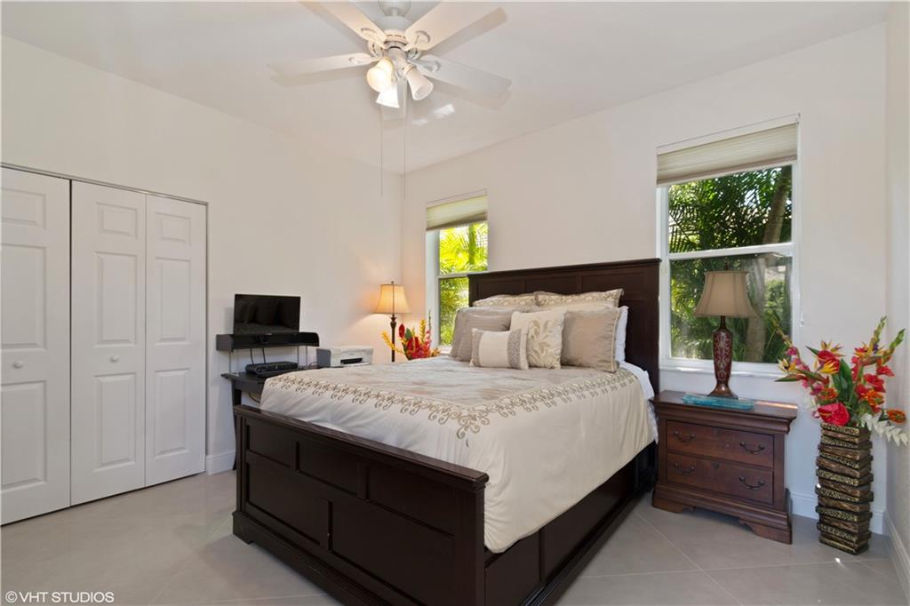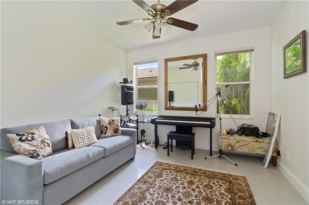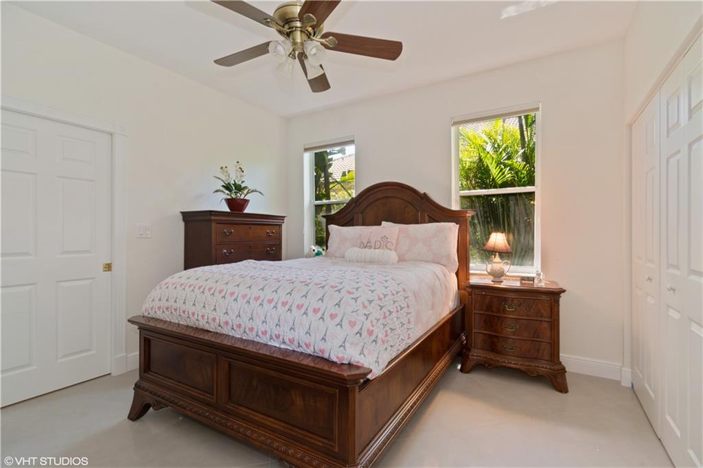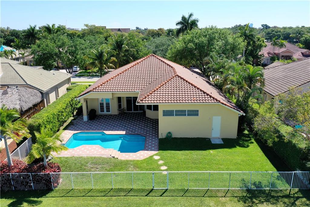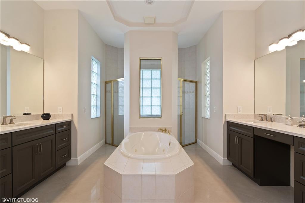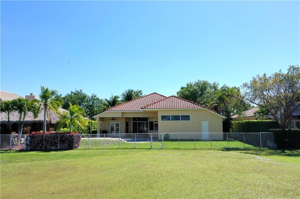 Open the doors to this beautiful home and the view of the pool and the golf course through the sliding doors will transport you to paradise! Better than a model! 32" tile on the diagonal throughout. The truly gourmet kitchen is a chef's delight complete with a stainless steel appliance package and a contemporary design/colors including a long center island. A large family room adjoining the kitchen. Formal living room and charming dining room. Triple split bedroom plan. Spacious master with a luxurious master bath with dual sinks and a large tub and separate shower. Jack and Jill bathroom for bedrooms 2 & 3. Separate suite off of the family room with full hallway bathroom. Interior laundry room. Three car garage. Sparkling pool and covered patio with lovely golf course views. Guard gated!