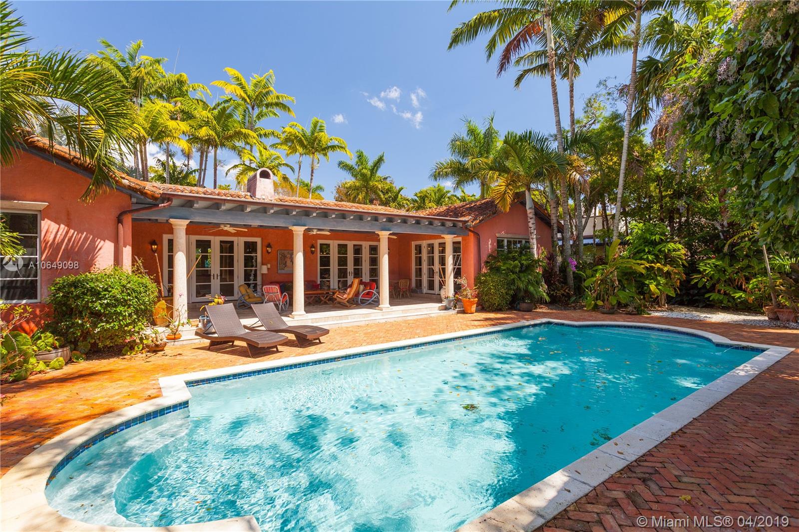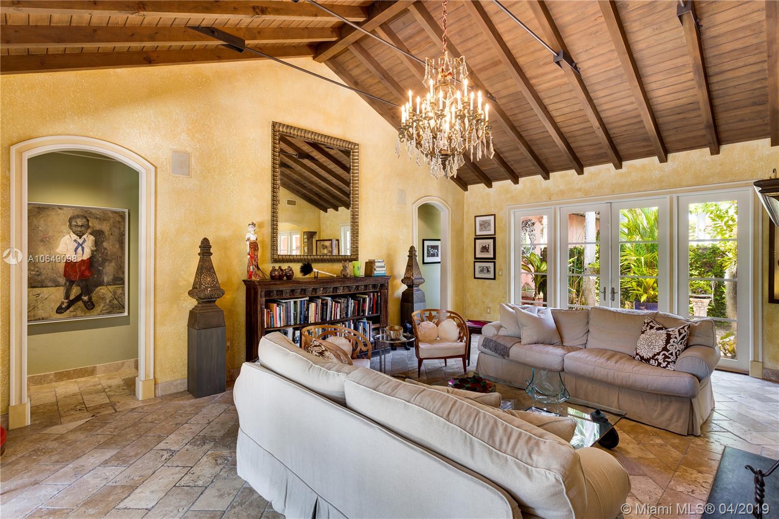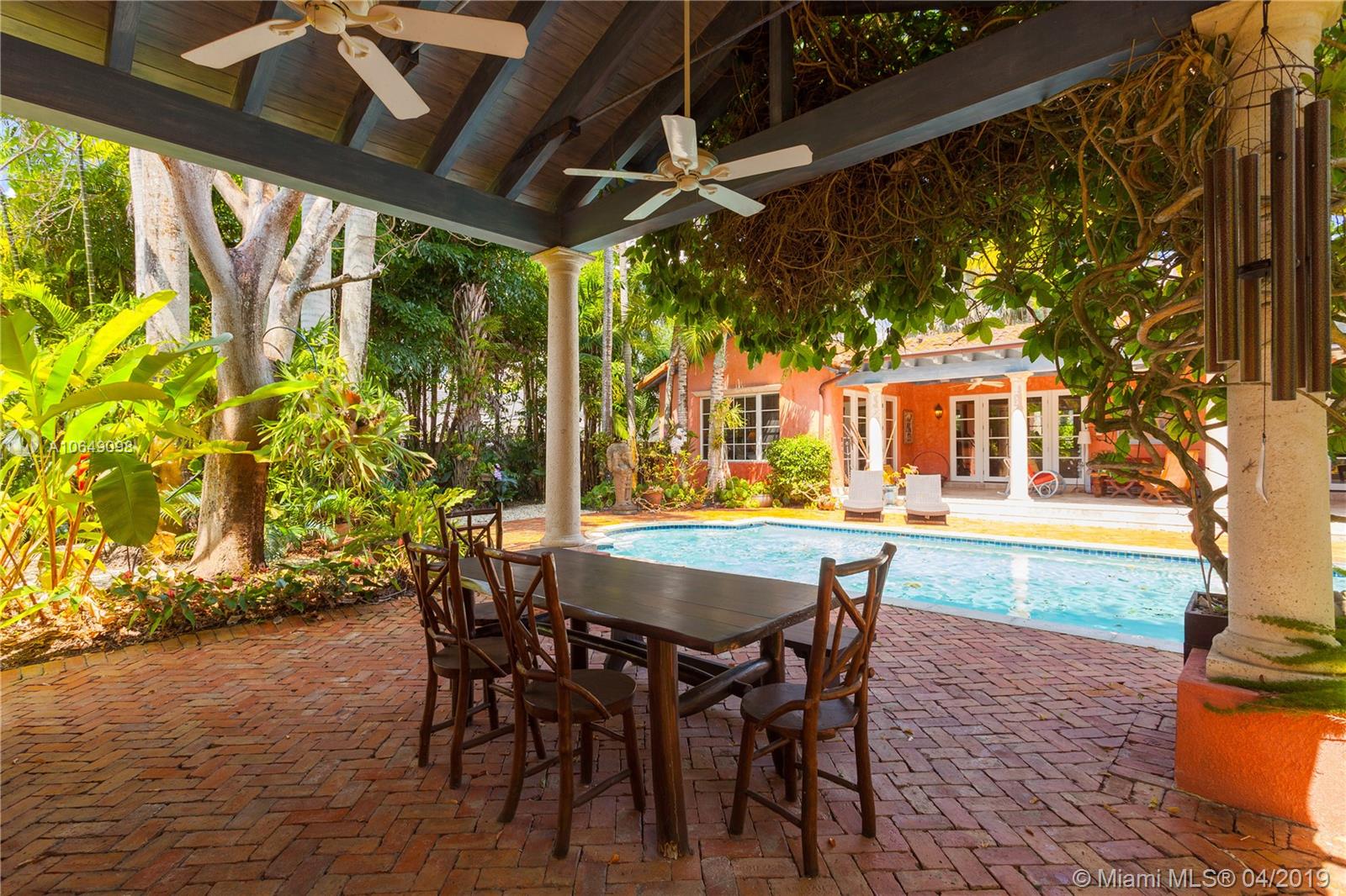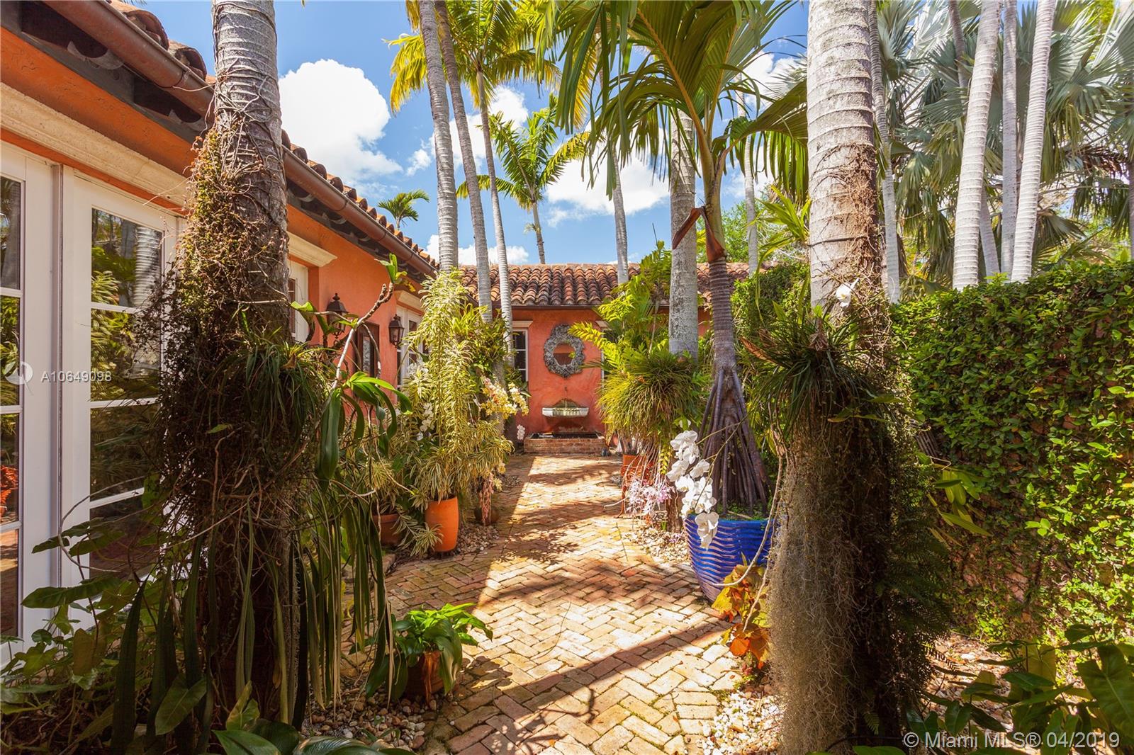 Built in 2000 this remarkable 4031 actual square foot 3 bedroom 3.5 bath replica of a Spanish Colonial Hacienda was designed by renown architect, Luis Jauregui with landscaping by Lester Pancoast. Built in a classic H shape to maximize openness to nature, breezes and natural light. The loggia entry leads past a serene courtyard of rare palms & orchids to the main entrance gallery. The main salon has a 14' tall open timbered ceiling and a wood-burning fireplace. Floors throughout the home are tumbled Travertine marble. Impact doors & windows throughout. Formal dining room, chef's style kitchen open to a family room. In the bedroom wing there is a master suite + two other bedrooms. Cabana house with bath. 40' pool. 100'X150' lot. Sublime Old World architecture with every modern convenience.