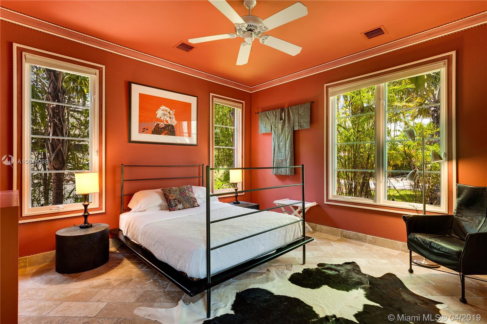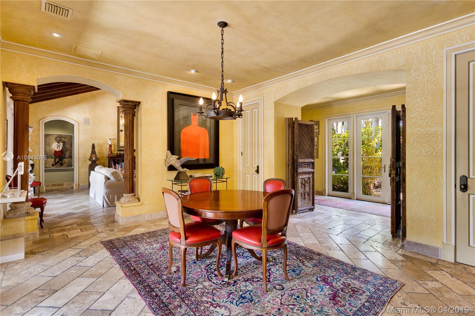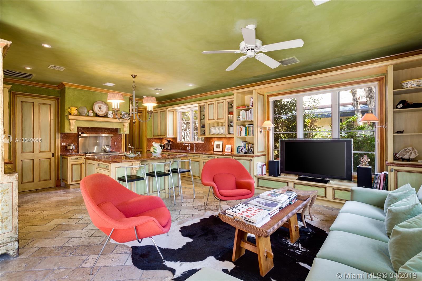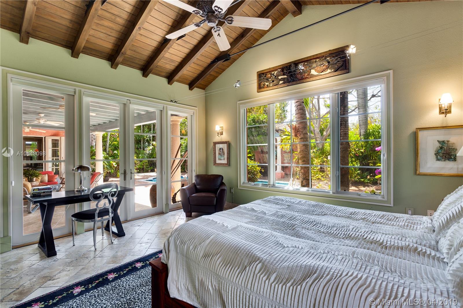 Built in 2000 this remarkable 4031 actual square foot 3 bedroom 3.5 bath replica of a Spanish Colonial Hacienda was designed by renown architect, Luis Jauregui with landscaping by Lester Pancoast. Built in a classic H shape to maximize openness to nature, breezes and natural light. The loggia entry leads past a serene courtyard of rare palms & orchids to the main entrance gallery. The main salon has a 14' tall open timbered ceiling and a wood-burning fireplace. Floors throughout the home are tumbled Travertine marble. Impact doors & windows throughout. Formal dining room, chef's style kitchen open to a family room. In the bedroom wing there is a master suite + two other bedrooms. Cabana house with bath. 40' pool. 100'X150' lot. Sublime Old World architecture with every modern convenience.