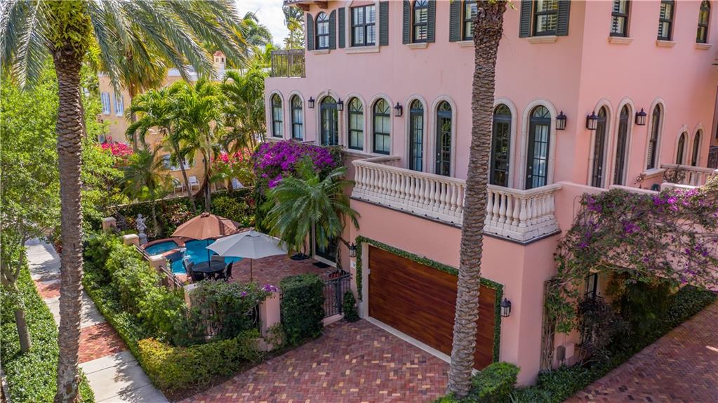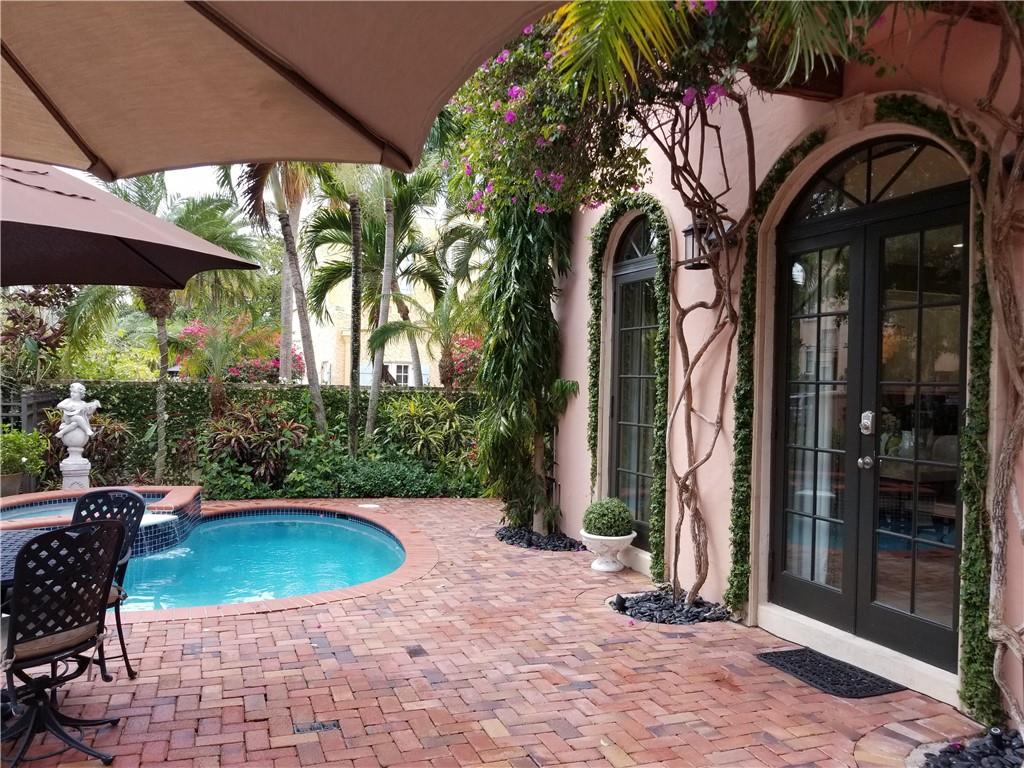 Sophistication abounds in this luxury townhome nestled within blocks of famed Las Olas Blvd. Magnificent curb appeal with enchanting patio entrance thru a private gated, meticulously manicured garden with heated saltwater pool. Volume ceilings, high-end finishes, gleaming marble flooring & impact windows are some highlights of this timeless design. Beautifully refinished open concept kitchen with gas stove. Refined living spaces with 3 en-suite bedrooms plus powder room and spacious media/den. Walkout patios on every level. Private elevator, 2 car garage and more complete the appeal for a discerning Buyer.