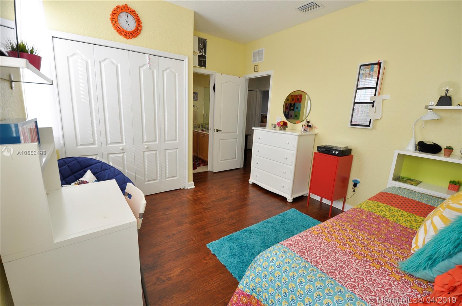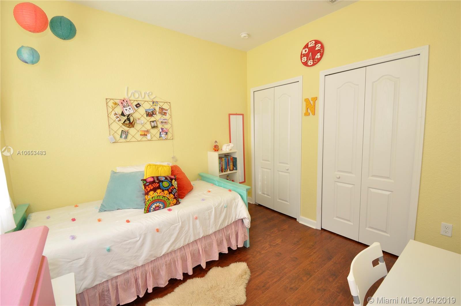 Beautiful Mariana model kept in excellent condition. Customed remodeled kitchen, ceramic floors in social areas, crown moldings ,family room with accent stone wall looking out to a very cozy tropical patio and relaxing lake view. Spacious tiled 2 car garage , accordions shutters throughout. This is a 4 bedrooms,3 full baths ( 1 bedroom 1 bath on the first floor). Laminated wood on stairs and second floor. Jack and Jill bathroom shared by two bedrooms and a very large master suite with finished walk- in closets, master bathroom with double sink, shower and roman tub. Laundry room conveniently located upstairs. This is a great property located within walking distance to Ronald Reagan H.S. and a community pool only 2 houses away. Your buyers won't be disappointed, call today .