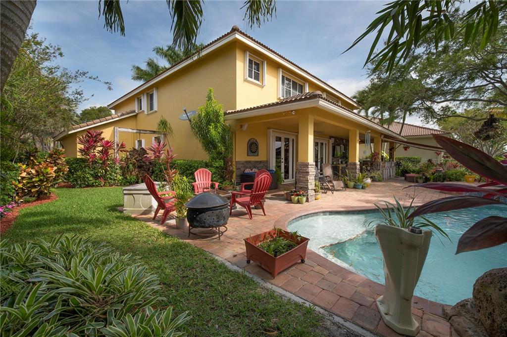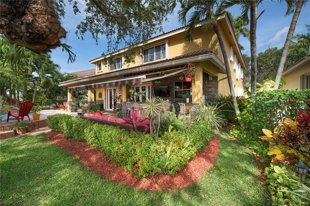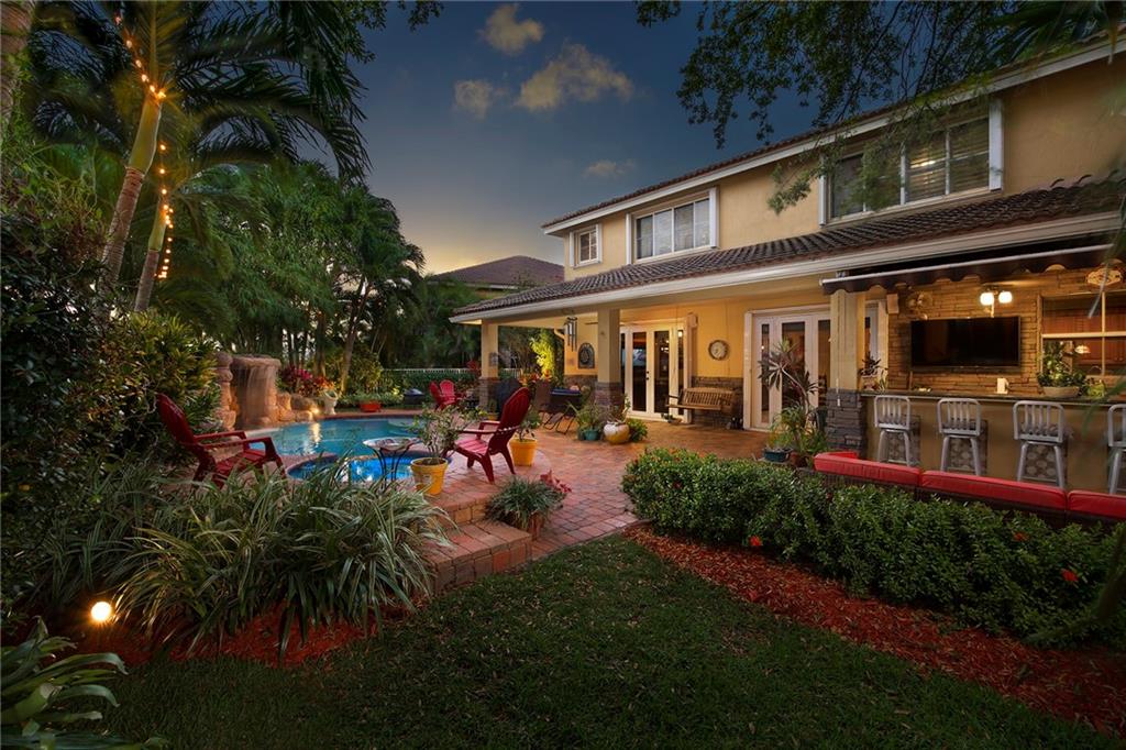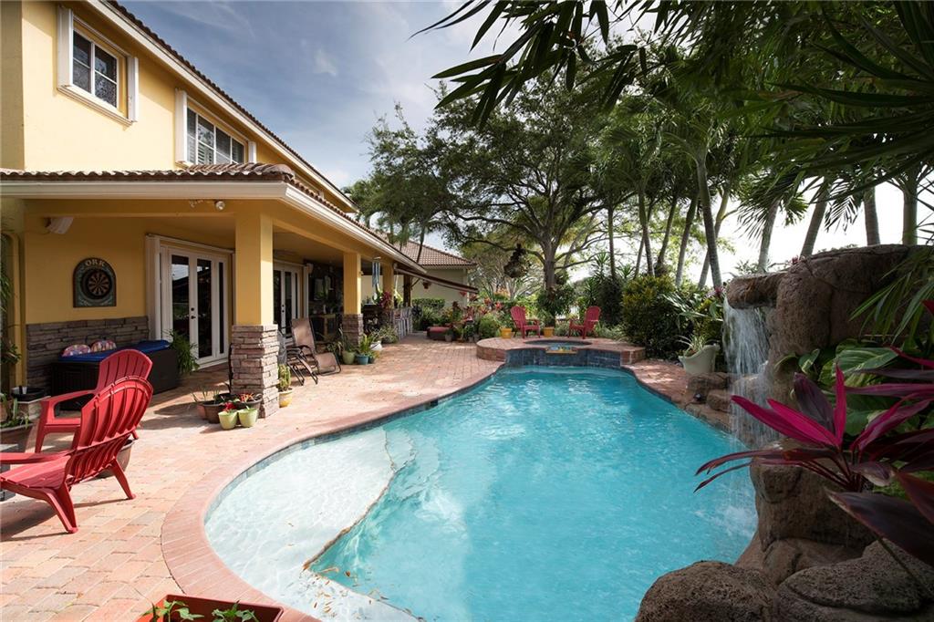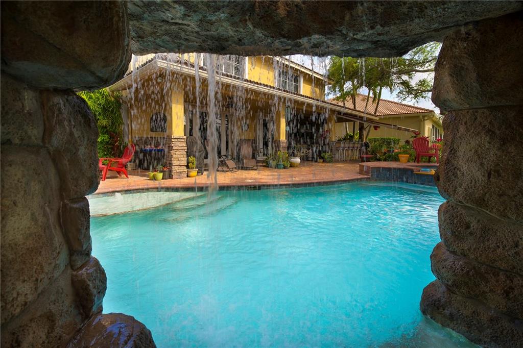 Breathtaking waterfront home nestled on a cul-de-sac with tons of upgrades and designer finishes throughout. Large kitchen with center island. Living room boasts vaulted ceilings and charming 20 ft fireplace. Oversized family room is an entertainers dream with custom built bar. Large master suite with sitting area. Four bathrooms are newly renovated with spa like finishes. Live like you are on vacation in the lushly landscaped private oasis backyard with resort style heated pool, hot tub, grotto cave, & waterfall. Grillmaster gourmet outdoor kitchen. Home has been meticulously maintained with new a/c's, accordion shutters, garage organization system, security system, custom closets, and more! Not your average Weston home - This home has a tremendous amount of living space with a cozy feel