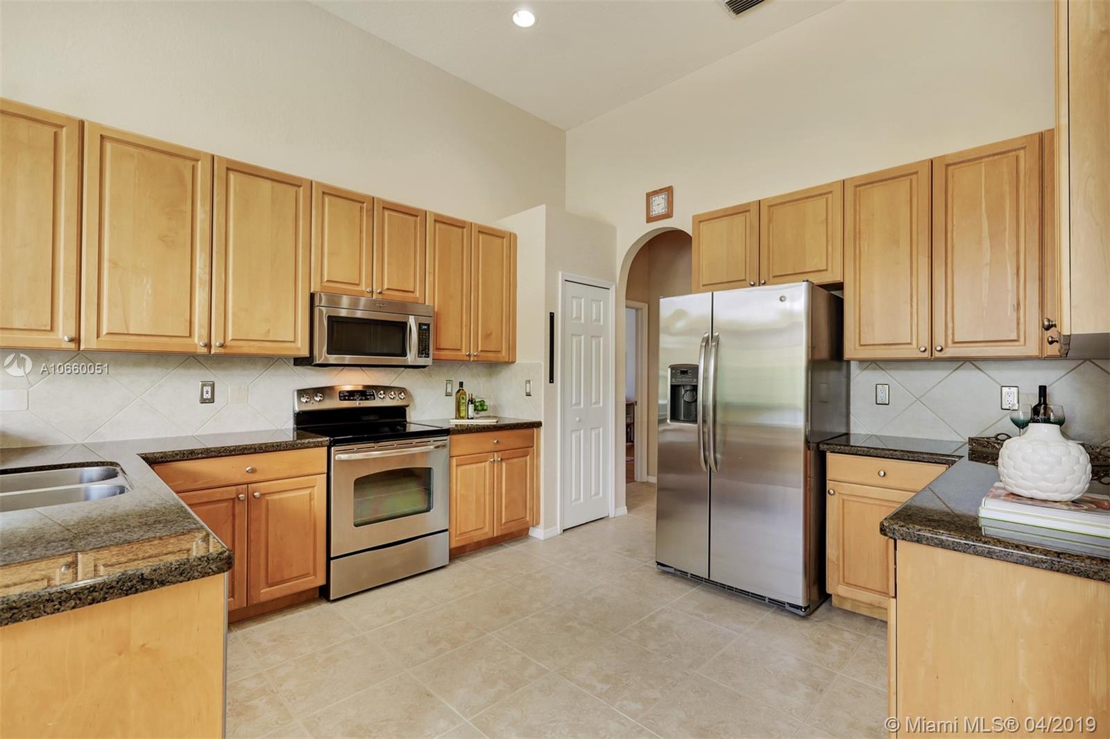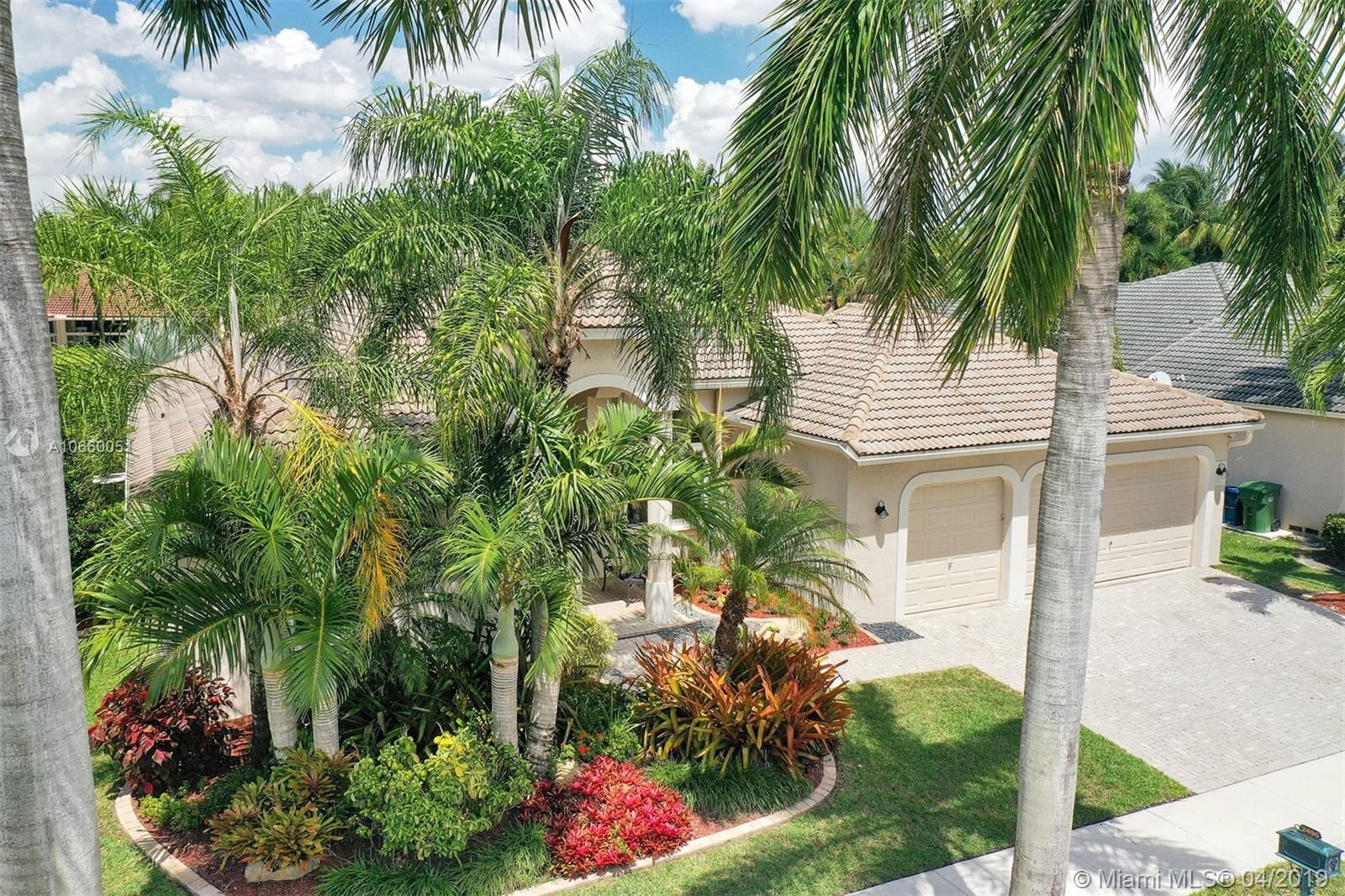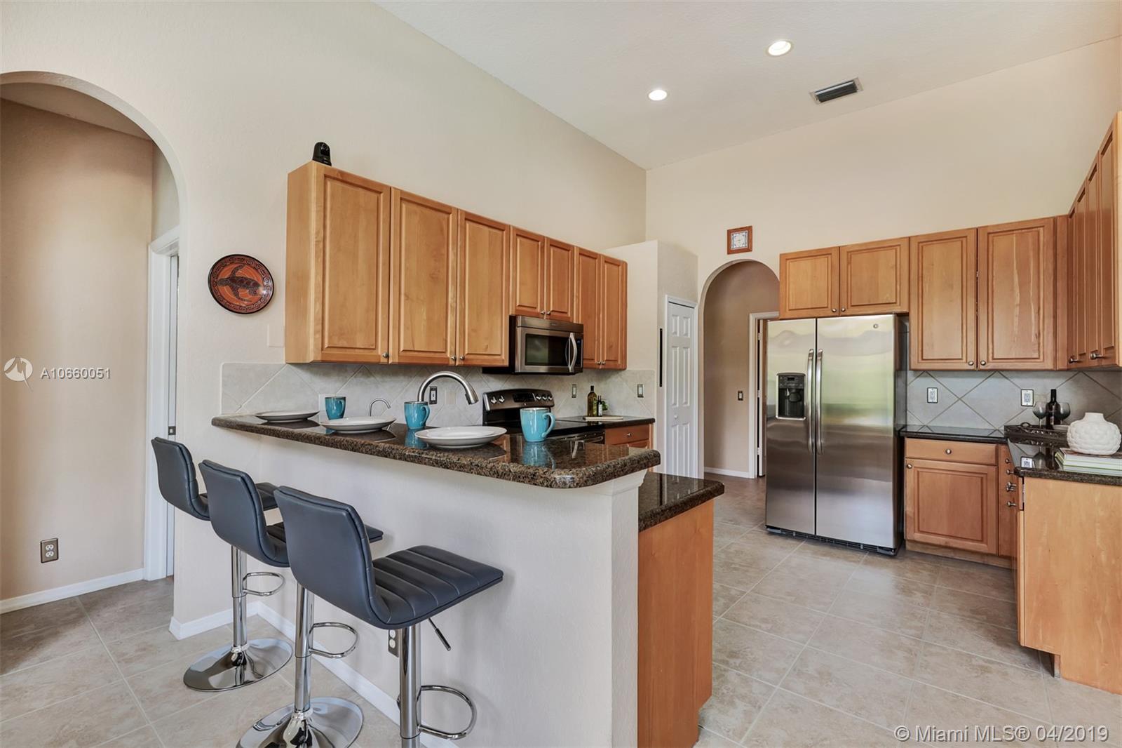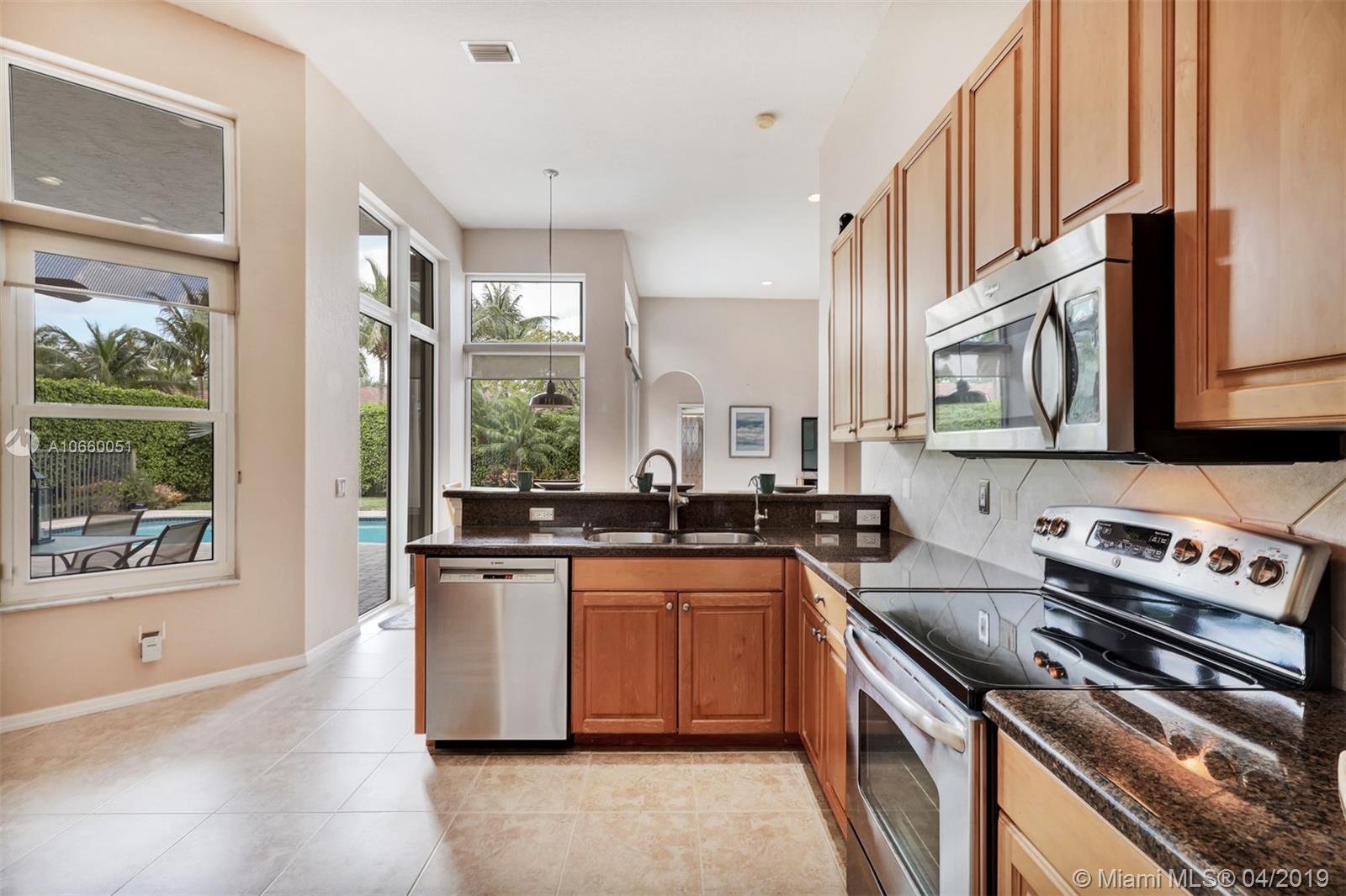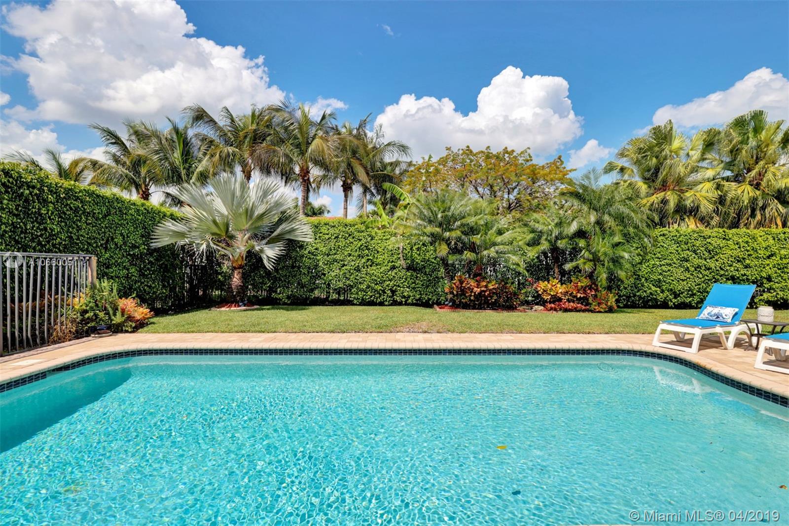 Custom built 3-way split floor plan offers 5BR/4BA/3-car garage. Brick paver driveway and entryway. PGT Premiere Vinyl Impact glass window and doors with Low-E glass (2015) plus accordion shutters. Freshly painted interior and exterior (2019), Ceramic tile floors in social areas; engineered wood flooring in MBR and one bedroom and laminate floors in 3 bedrooms. Newer stainless steel kitchen appliances, wood cabinetry and granite counters. Very private backyard, saline chlorinated (2018) and heated (2014) pool, diamond brited (2013). Newer 2-zone A/C (2015).