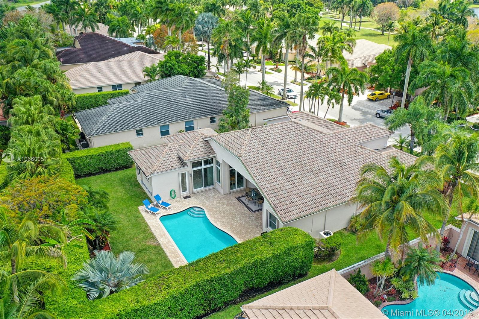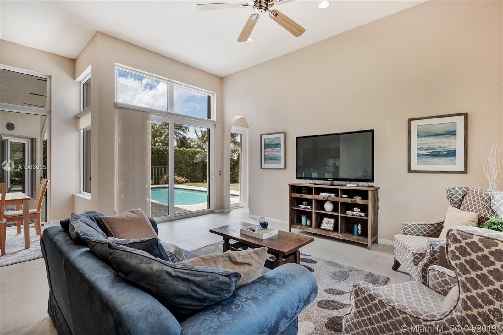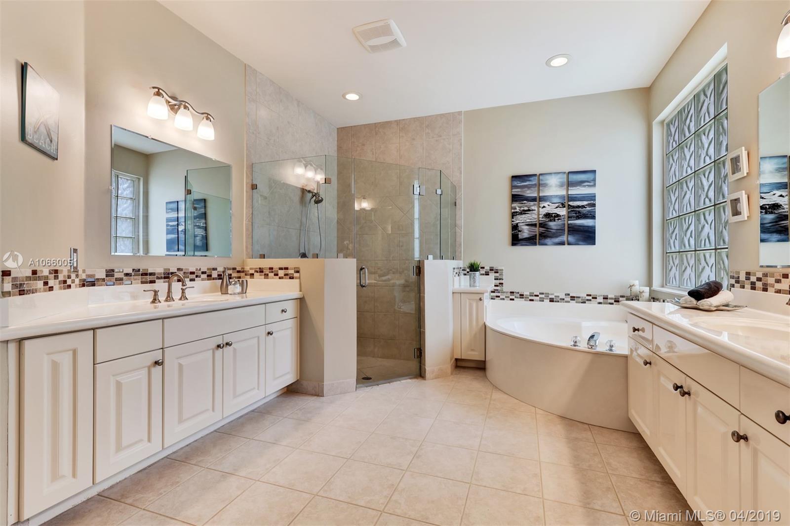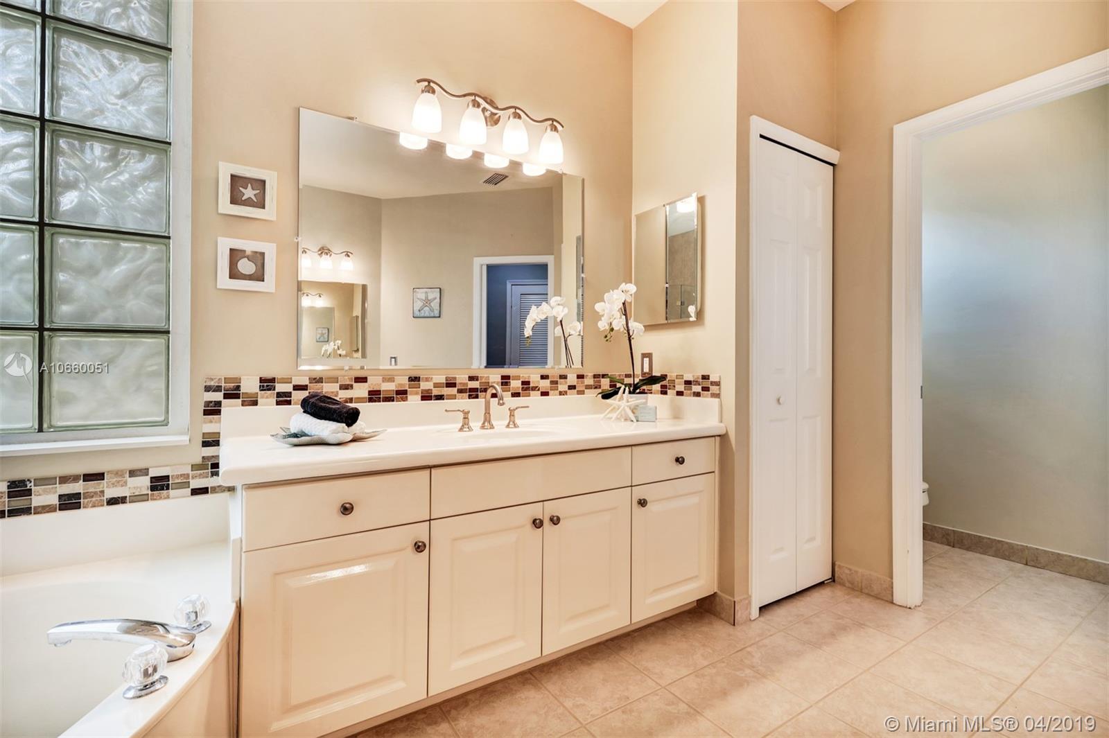 Custom built 3-way split floor plan offers 5BR/4BA/3-car garage. Brick paver driveway and entryway. PGT Premiere Vinyl Impact glass window and doors with Low-E glass (2015) plus accordion shutters. Freshly painted interior and exterior (2019), Ceramic tile floors in social areas; engineered wood flooring in MBR and one bedroom and laminate floors in 3 bedrooms. Newer stainless steel kitchen appliances, wood cabinetry and granite counters. Very private backyard, saline chlorinated (2018) and heated (2014) pool, diamond brited (2013). Newer 2-zone A/C (2015).