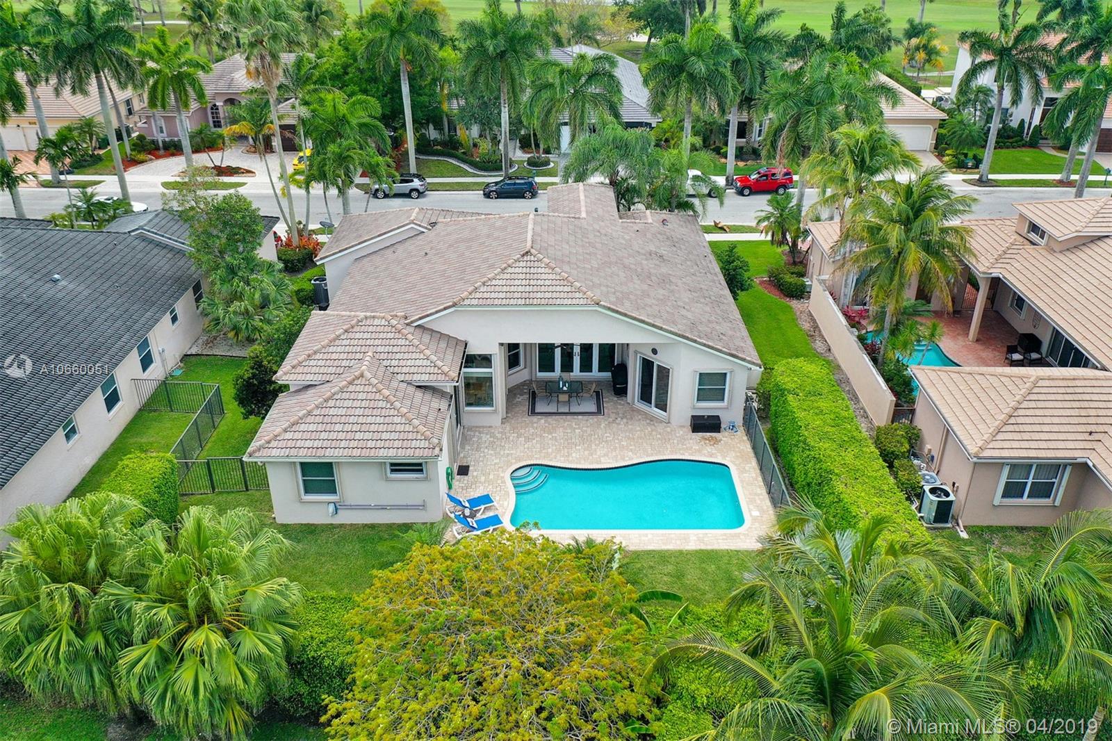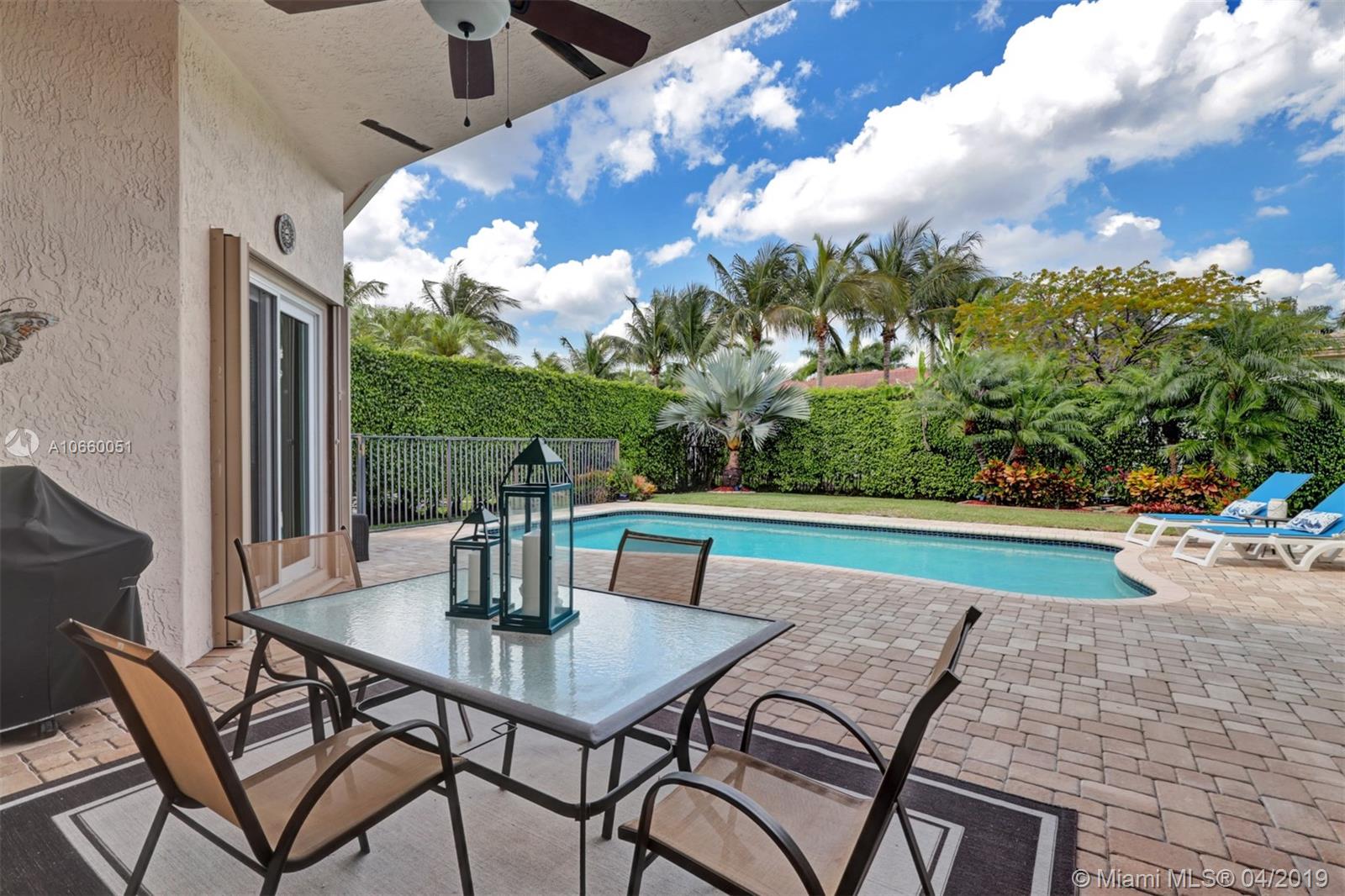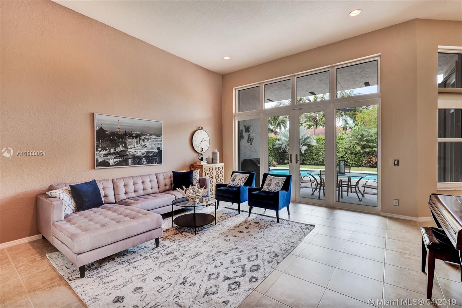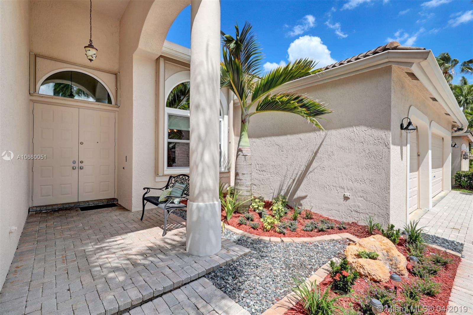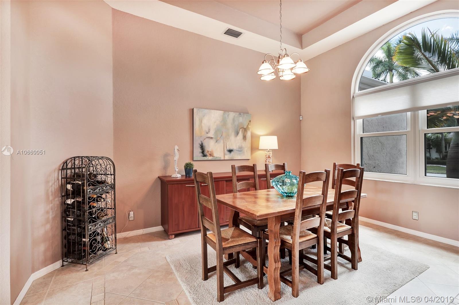 Custom built 3-way split floor plan offers 5BR/4BA/3-car garage. Brick paver driveway and entryway. PGT Premiere Vinyl Impact glass window and doors with Low-E glass (2015) plus accordion shutters. Freshly painted interior and exterior (2019), Ceramic tile floors in social areas; engineered wood flooring in MBR and one bedroom and laminate floors in 3 bedrooms. Newer stainless steel kitchen appliances, wood cabinetry and granite counters. Very private backyard, saline chlorinated (2018) and heated (2014) pool, diamond brited (2013). Newer 2-zone A/C (2015).