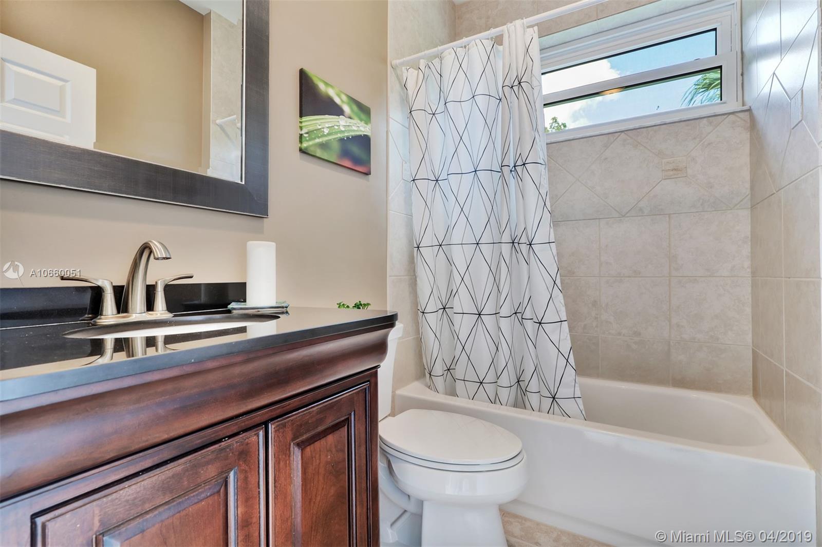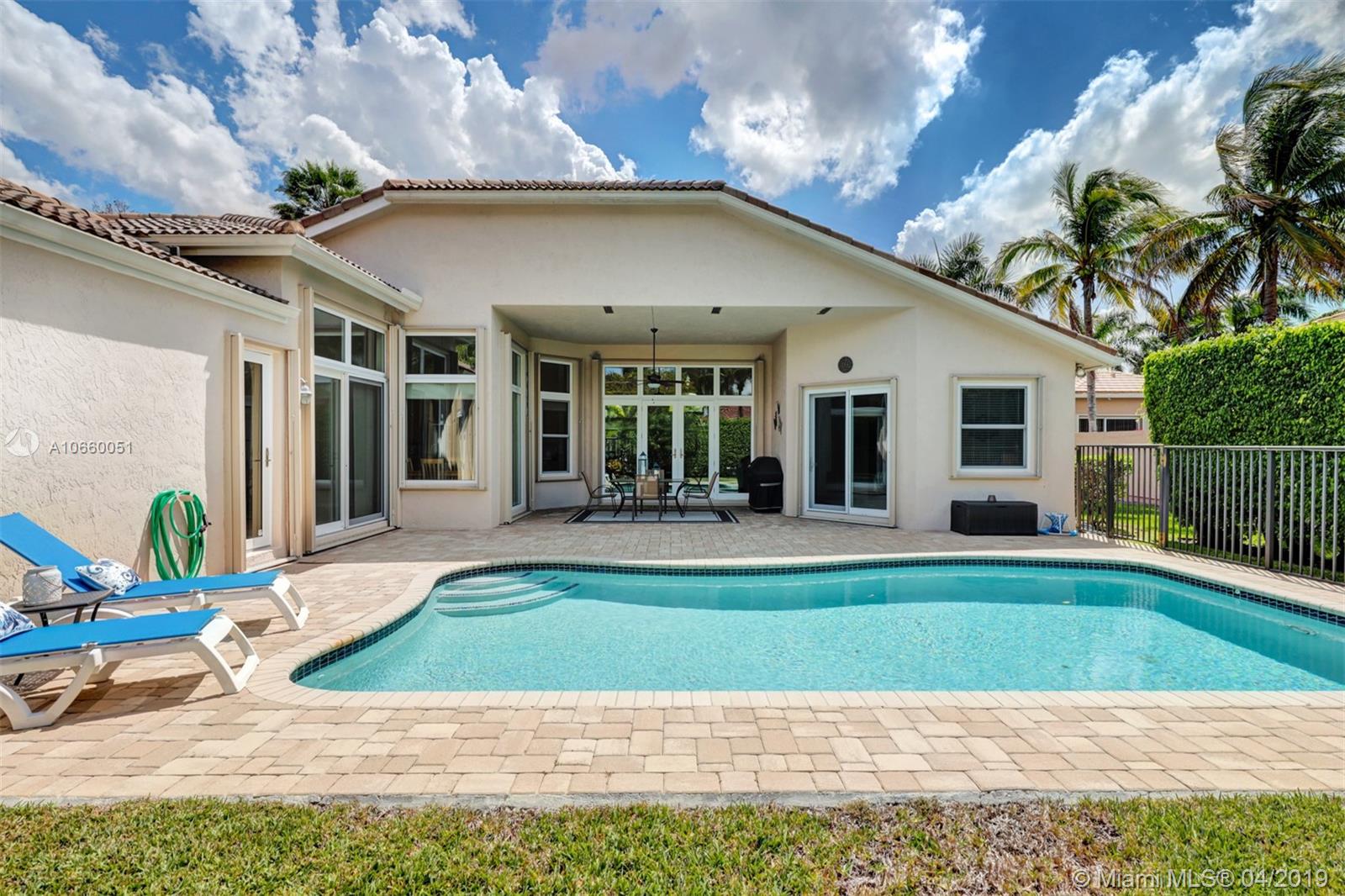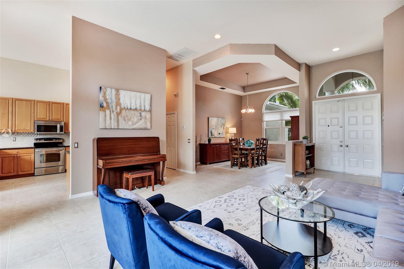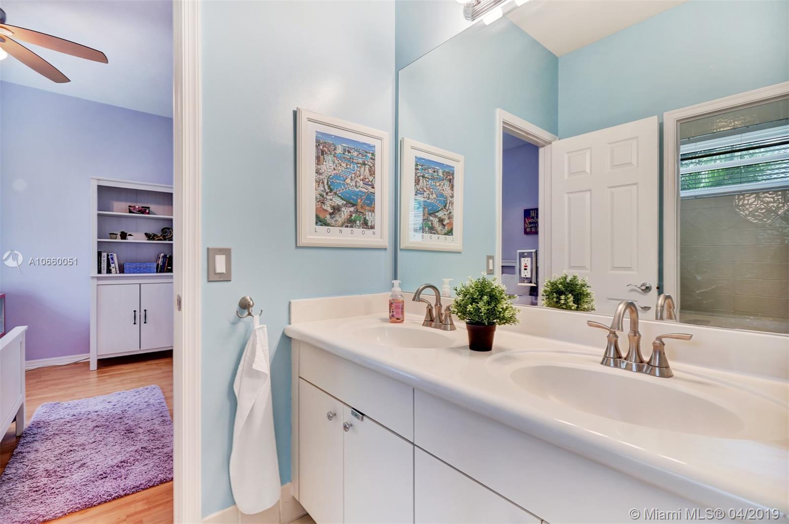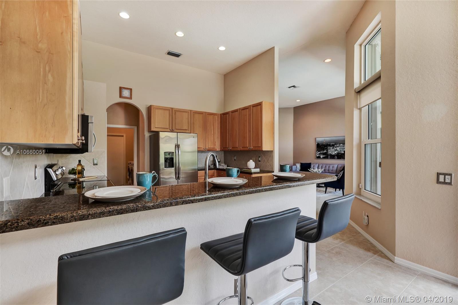 Custom built 3-way split floor plan offers 5BR/4BA/3-car garage. Brick paver driveway and entryway. PGT Premiere Vinyl Impact glass window and doors with Low-E glass (2015) plus accordion shutters. Freshly painted interior and exterior (2019), Ceramic tile floors in social areas; engineered wood flooring in MBR and one bedroom and laminate floors in 3 bedrooms. Newer stainless steel kitchen appliances, wood cabinetry and granite counters. Very private backyard, saline chlorinated (2018) and heated (2014) pool, diamond brited (2013). Newer 2-zone A/C (2015).