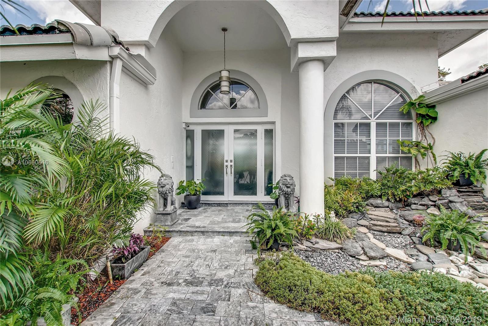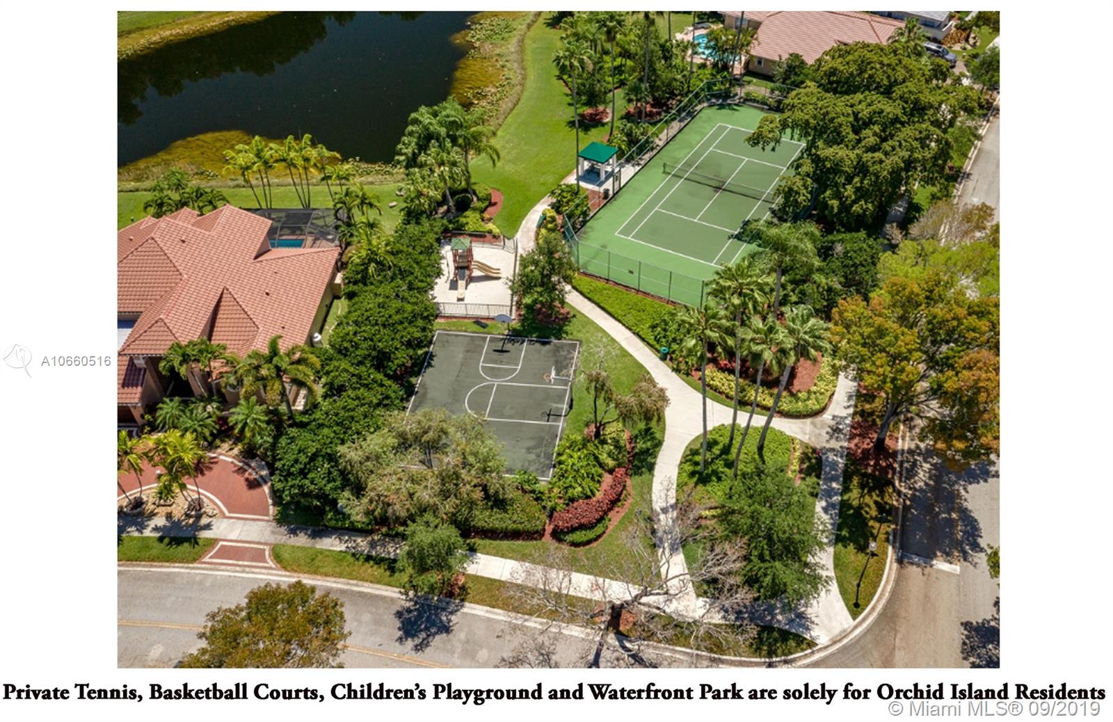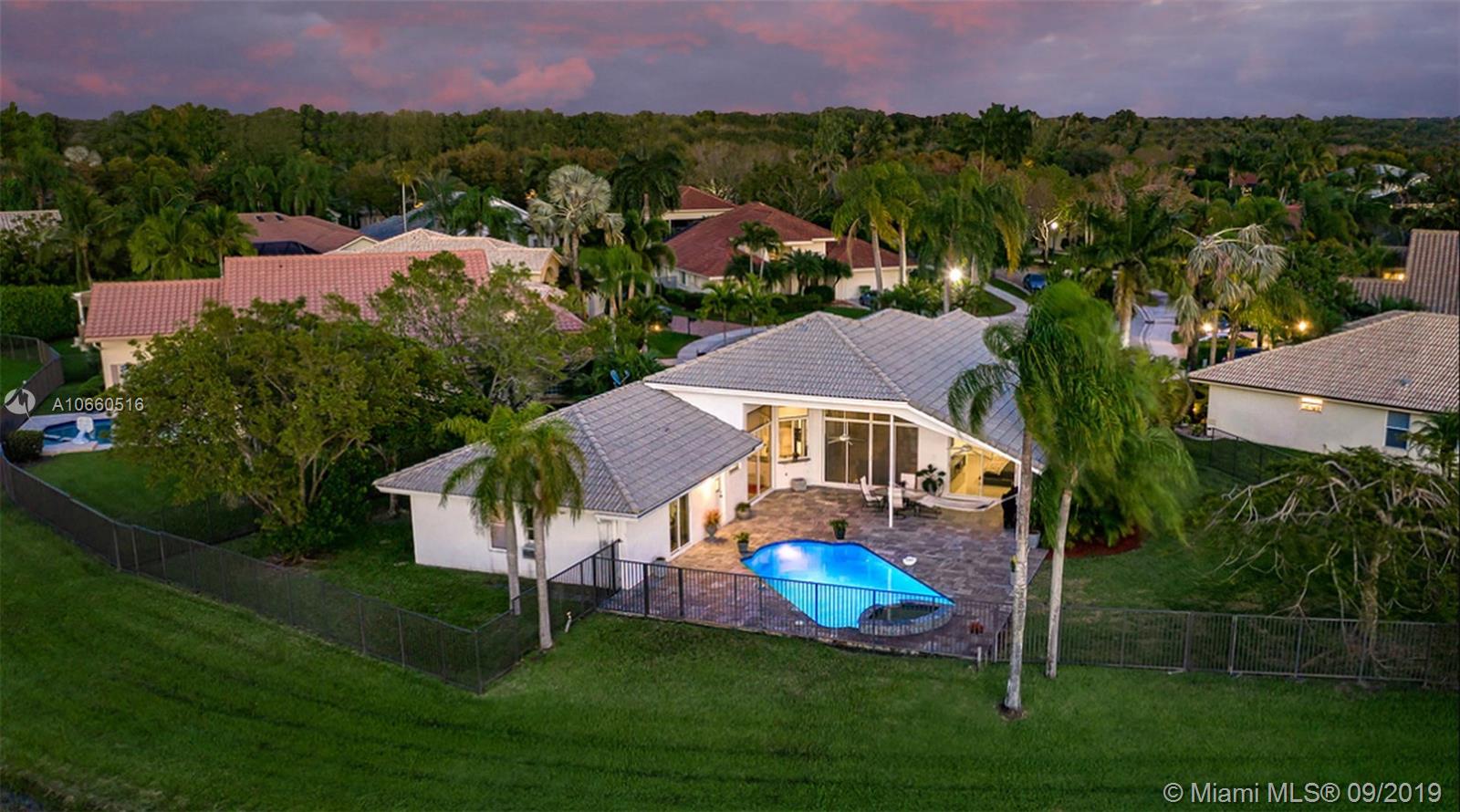 LUXURIOUS WESTON WIDEST (Sunset) LAKE VIEW HOME: ORCHID ISLAND w/community tennis, basketball & playground. Cul-de-sac, exotic landscaping, marble pavers front & back. 18" glass-like Porcelain tiles throughout, granite tops, marble master bath, stainless steel sinks & appliances. ROOF: 2007. Stone entertainment wall, 71' TV surround sound, music, intercom throughout. Each window & door alarmed + motion, fire & smoke sensors. Huge side yard, 16,101 sq. ft. Pie-shaped lot. Waterfall pool faces directly west for year-round sunsets. Large Jacuzzi tub in Master, single Jacuzzi in the second bathroom. Toilets are all Kohler & separated by doors for privacy. All closets have systems. TURNKEY.