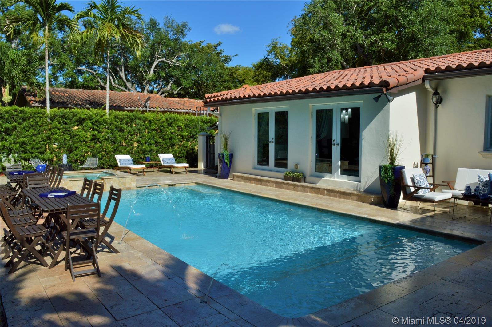 Beautiful 3/3.5 home in the heart of Coral Gables. Fully updated in all areas and with no spare to detail, this home is conveniently located, close to Miracle Mile, Village of Merrick Park, supermarket, great schools, etc... Ideal for a small family who likes to entertain. The home has a built in outdoor kitchen with entertainment area, cooling misters, mosquito repeller throughout the back yard, spa, salt water pool, etc... Impact windows and doors, security system throughout property. Very easy to show!!!