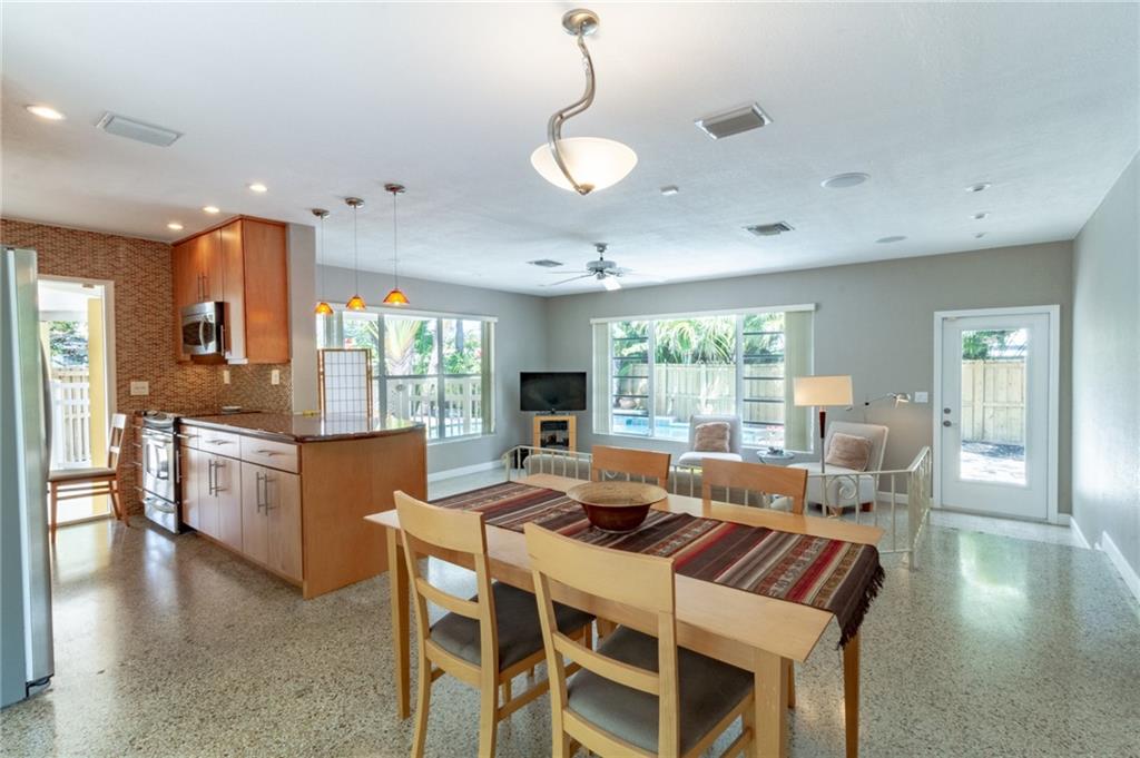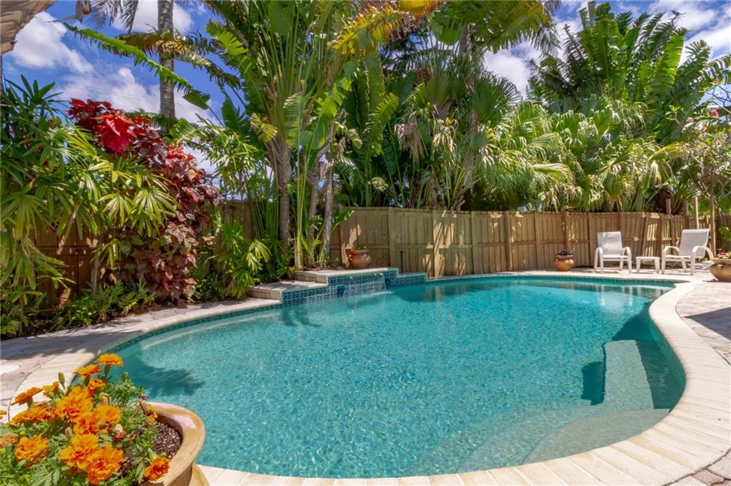 don't miss the photos for this charming home on an oversized and lushly landscaped corner lot. the pool area, in full view from the dining and step down living area add to the beauty of this home. polished terrazzo throughout for easy care and living. the geographic positioning of this home makes for lots of natural light, especially in the living areas. entire property is fenced. updated galley style kitchen makes being in the kitchen easy and convenient to the raised dining area. bathroom makes good use of combo tub/shower with a window. double carport with access for a standard sized vehicle and a compact is a real plus in the florida sun. shaded patio off the dining area is easily accessible for grilling or just chillin, while the pool deck affords plenty of sunshine!