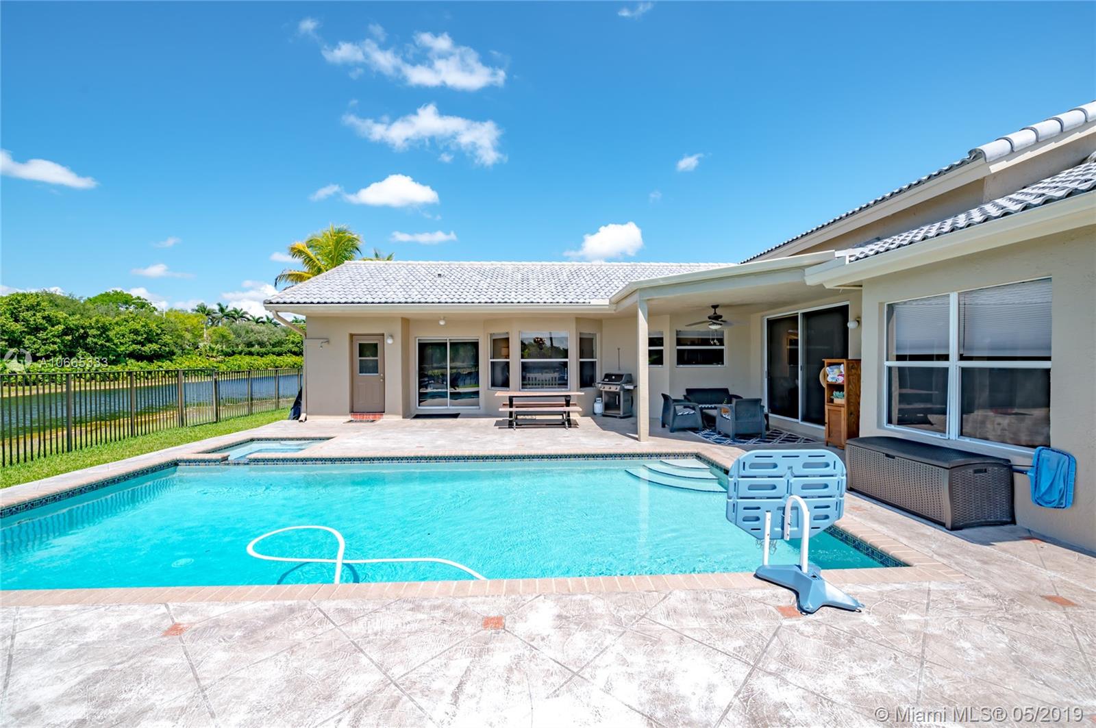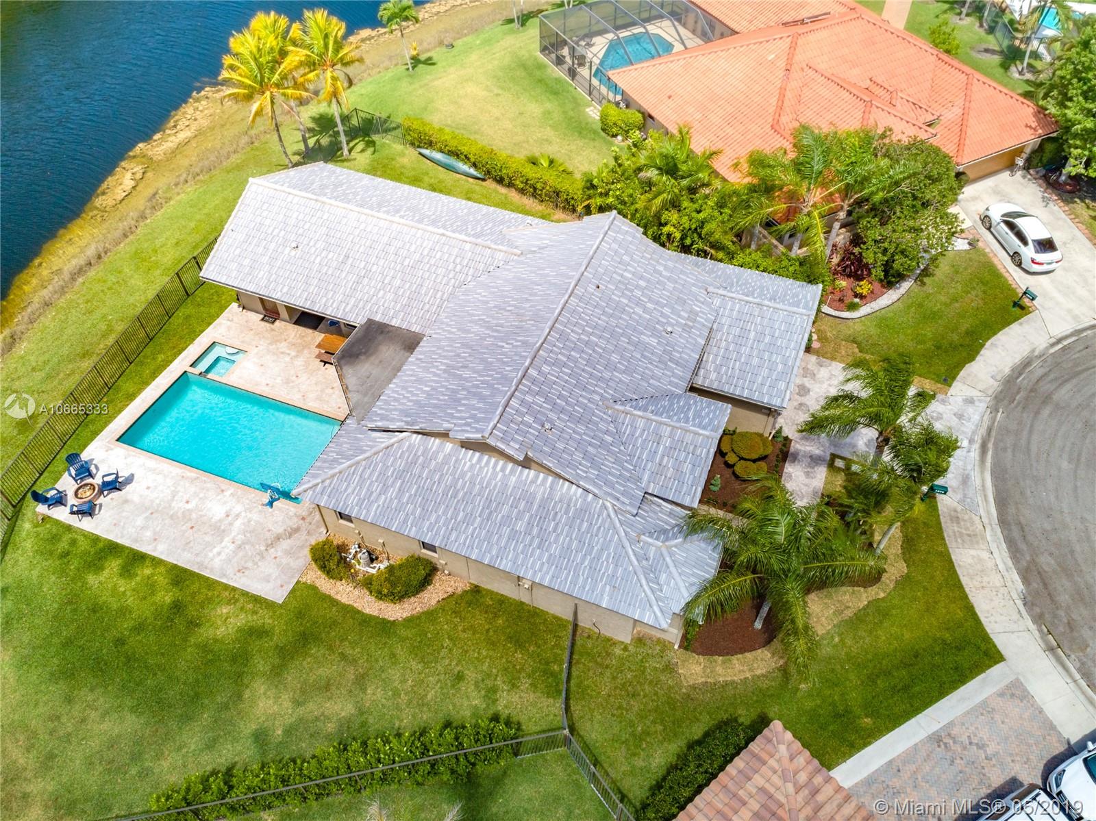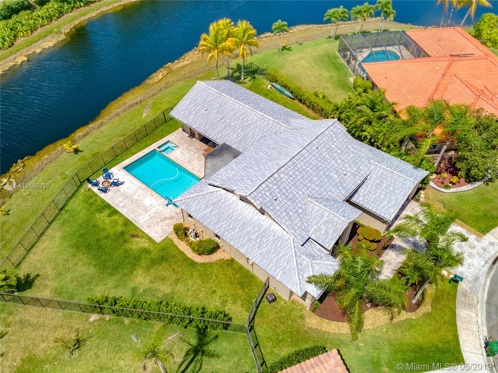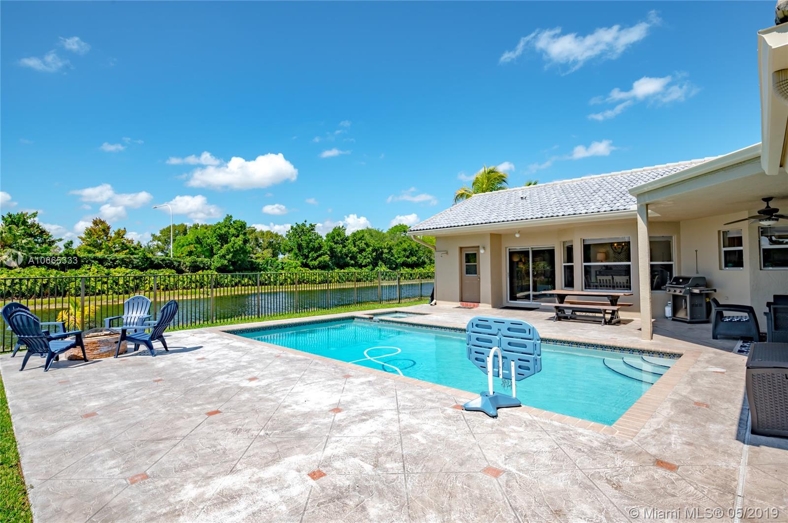 Inviting grand lot in Cul de Sac in exquisite gated Sunset Springs. Captivating water views from the moment you enter. Timeless sunsets. Nicely renovated, many upgrades! New roof, less than 6 years old, 2 A/C units approximately 5 years old, large pool with Spa with newer pool heater and motor. Bathrooms newly renovated. New floors throughout the house, popcorn ceiling removed. Kitchen with all stainless steel appliances almost new, granite countertops. Serene landscape, freshly updated. Biggest one story four bedrooms, 2.5 baths in the community. A+ school. Community has tennis and basketball courts, playground. Ready to move in!