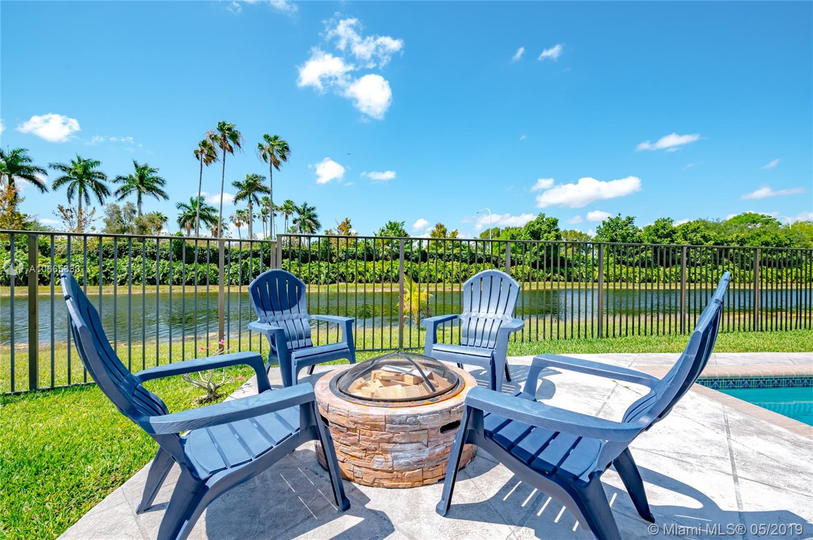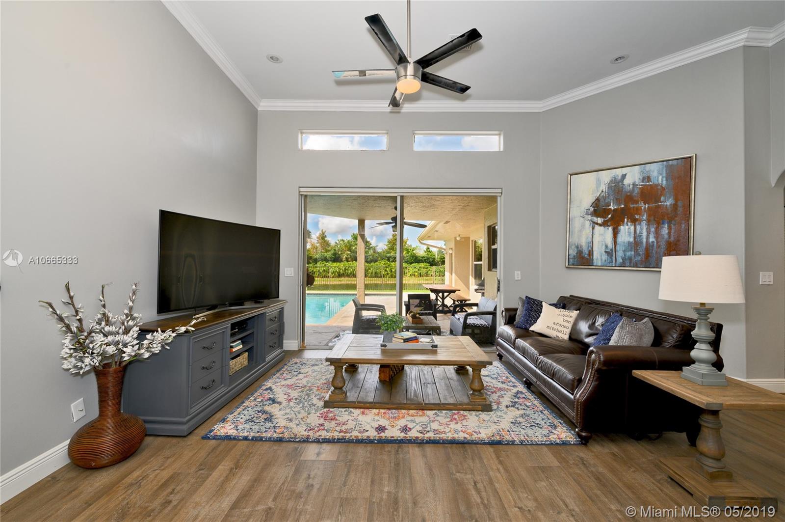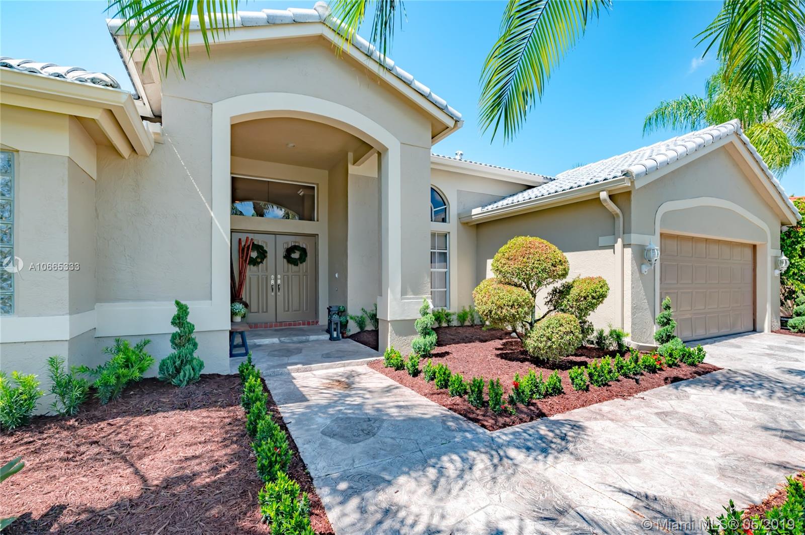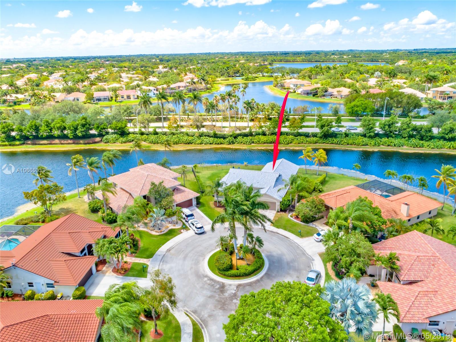 Inviting grand lot in Cul de Sac in exquisite gated Sunset Springs. Captivating water views from the moment you enter. Timeless sunsets. Nicely renovated, many upgrades! New roof, less than 6 years old, 2 A/C units approximately 5 years old, large pool with Spa with newer pool heater and motor. Bathrooms newly renovated. New floors throughout the house, popcorn ceiling removed. Kitchen with all stainless steel appliances almost new, granite countertops. Serene landscape, freshly updated. Biggest one story four bedrooms, 2.5 baths in the community. A+ school. Community has tennis and basketball courts, playground. Ready to move in!