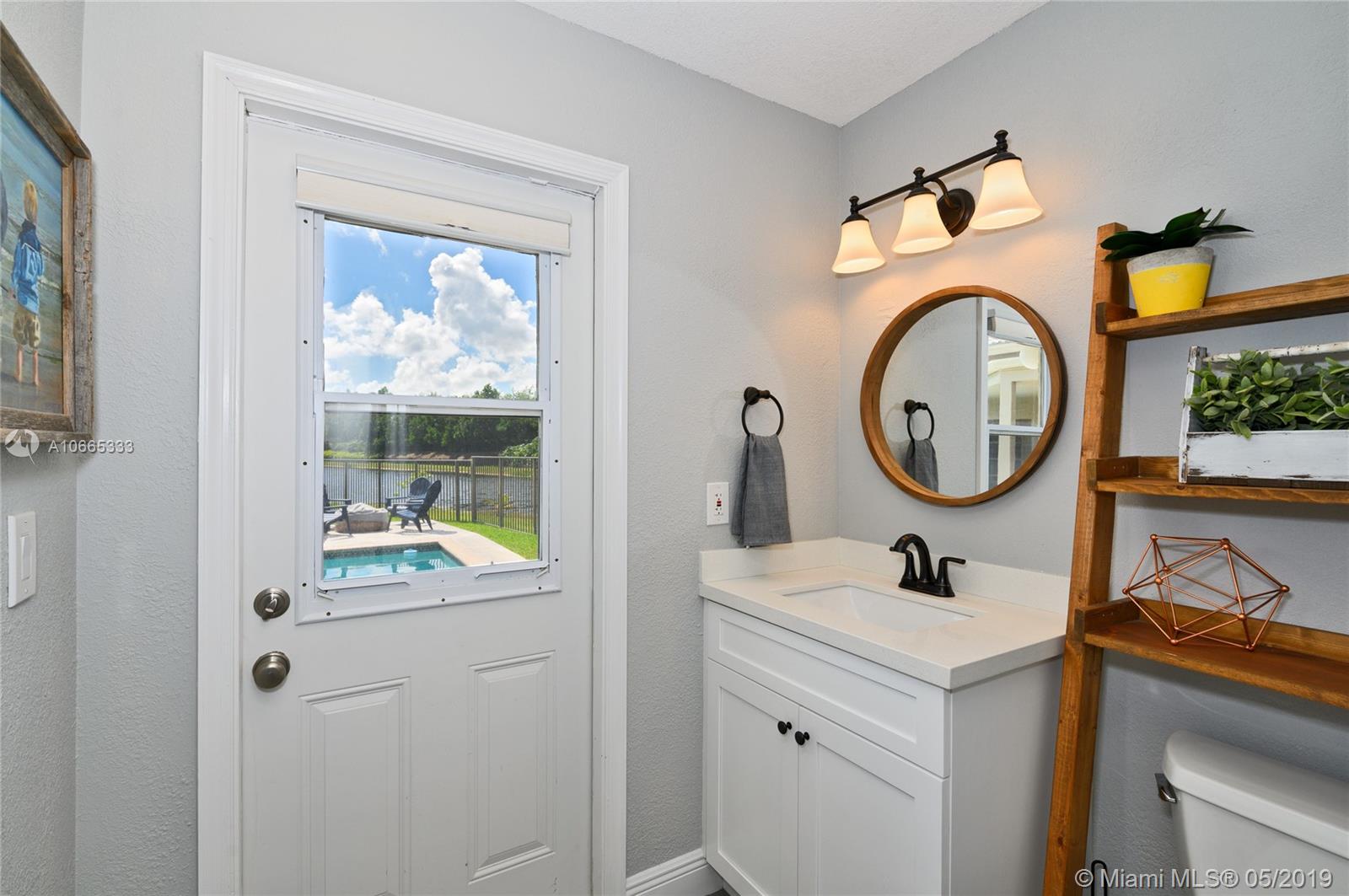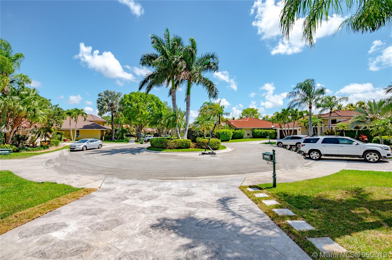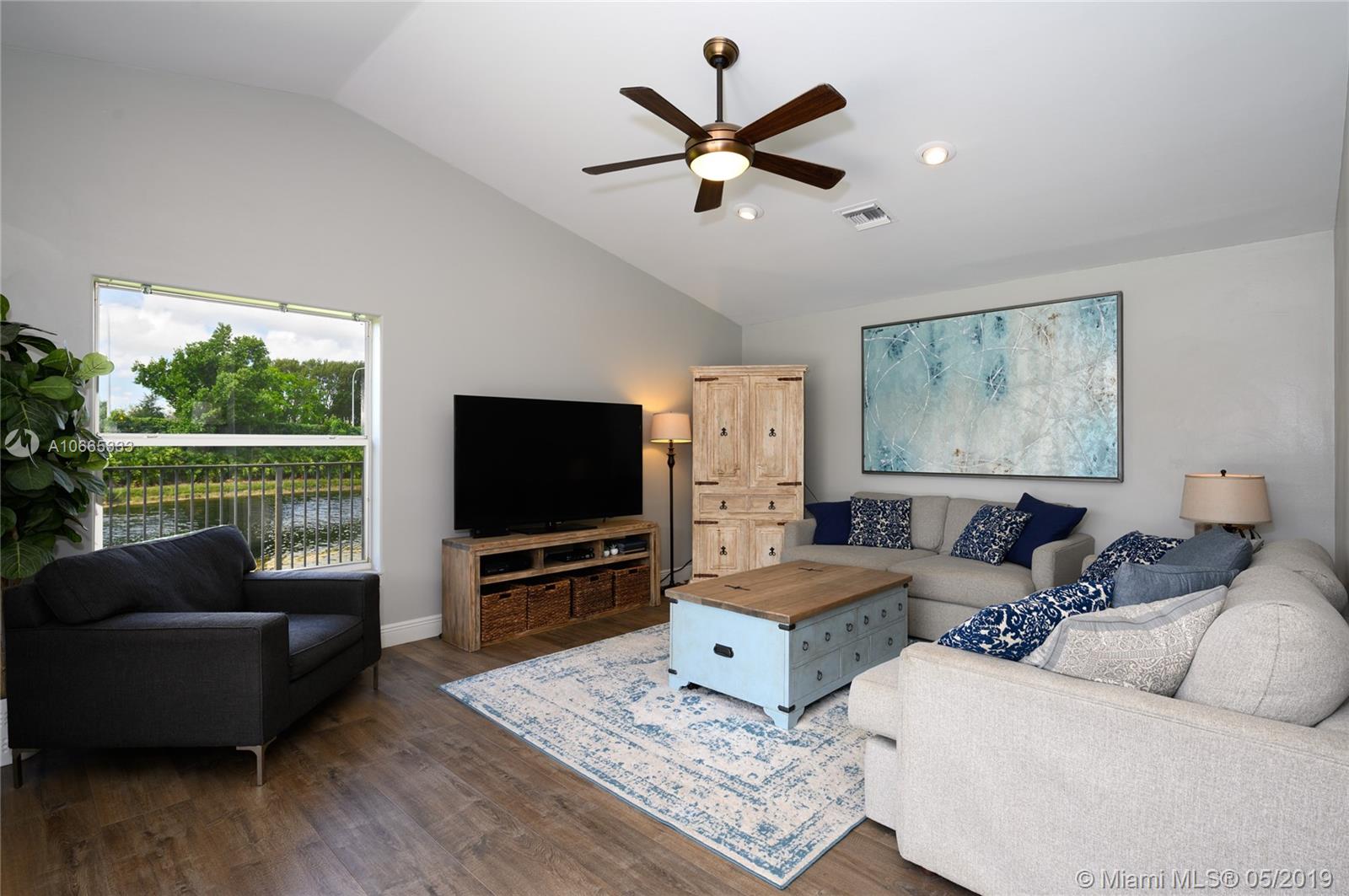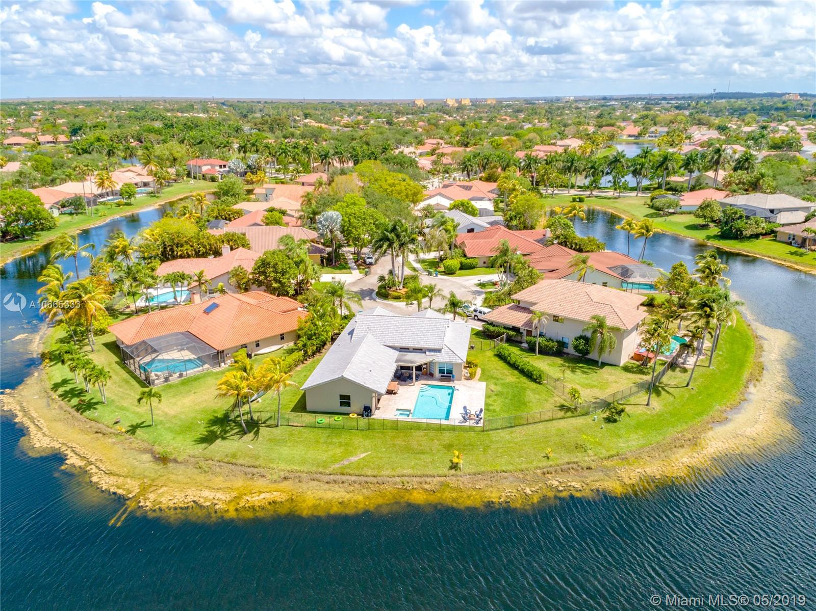 Inviting grand lot in Cul de Sac in exquisite gated Sunset Springs. Captivating water views from the moment you enter. Timeless sunsets. Nicely renovated, many upgrades! New roof, less than 6 years old, 2 A/C units approximately 5 years old, large pool with Spa with newer pool heater and motor. Bathrooms newly renovated. New floors throughout the house, popcorn ceiling removed. Kitchen with all stainless steel appliances almost new, granite countertops. Serene landscape, freshly updated. Biggest one story four bedrooms, 2.5 baths in the community. A+ school. Community has tennis and basketball courts, playground. Ready to move in!