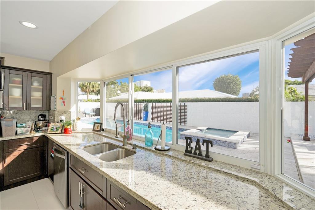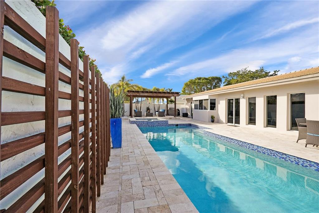 Modern updated home in Bermuda Riviera. 3 bed 3 bath w/ maid quarters+den customized w/ built-in Murphy bed as 4th bedroom. Open living+dining space w/ custom bar+built-ins. State of the art security system with exterior and interior cameras in addition to both outside and inside surround sound system that comes with the home. 24' white tile in living+dining areas w/ bamboo in the bedrooms. Oversized eat-in kitchen. Custom lighting throughout the home. 2014 tile roof, impact windows throughout+custom outdoor space with recently renovated oversize lap pool, jacuzzi/spa and pergola for shade. Bayview School District location. Walk to the beach, Galt Ocean Mile+Lauderdale-By-The Sea. New and improved community gate+camera security being added. A great opportunity to live in paradise!