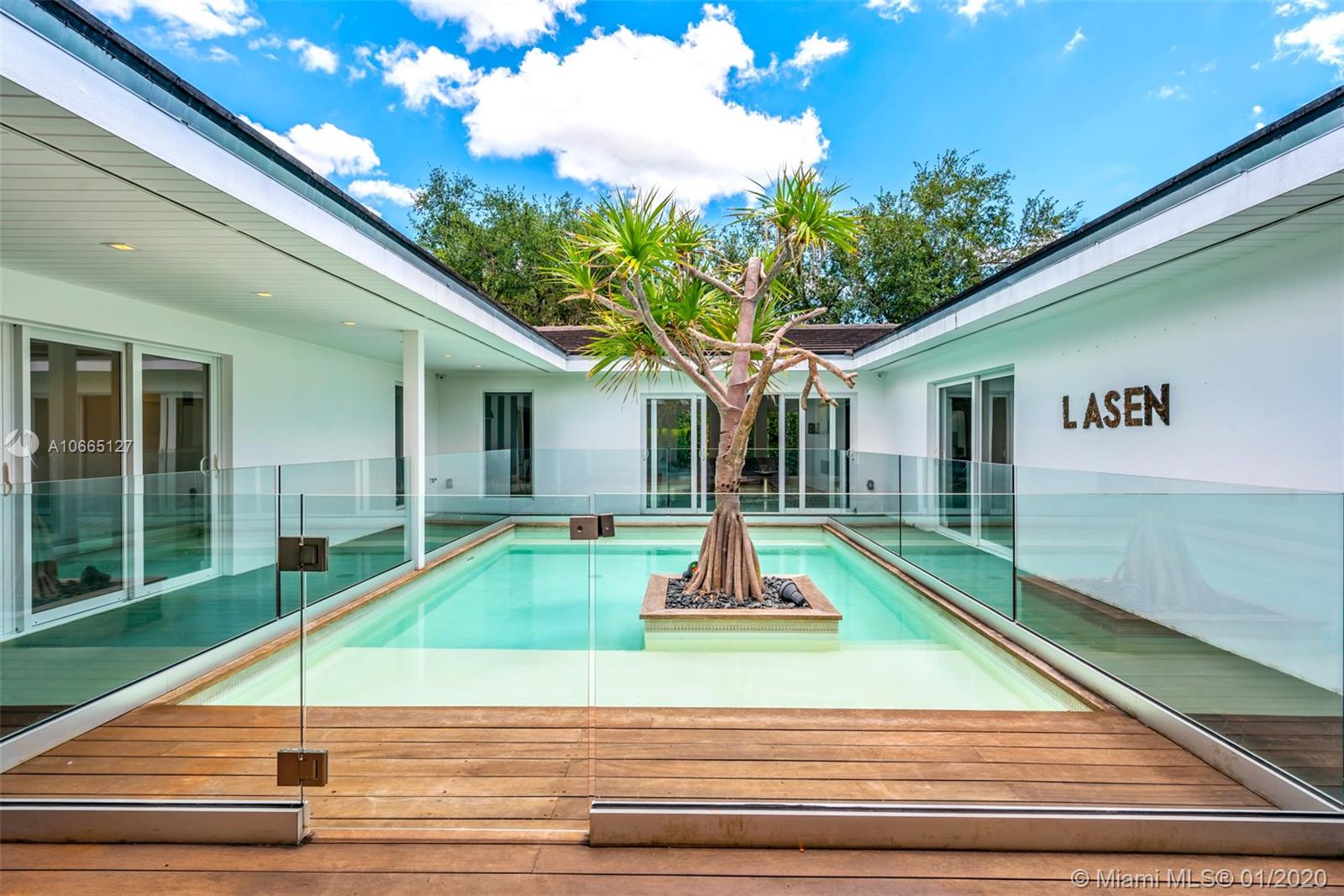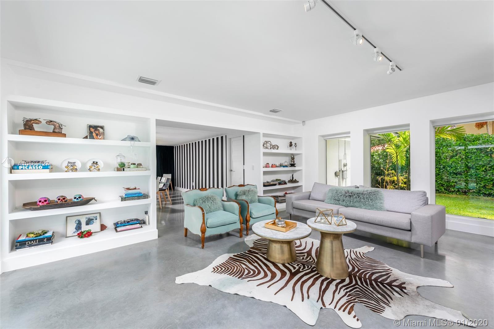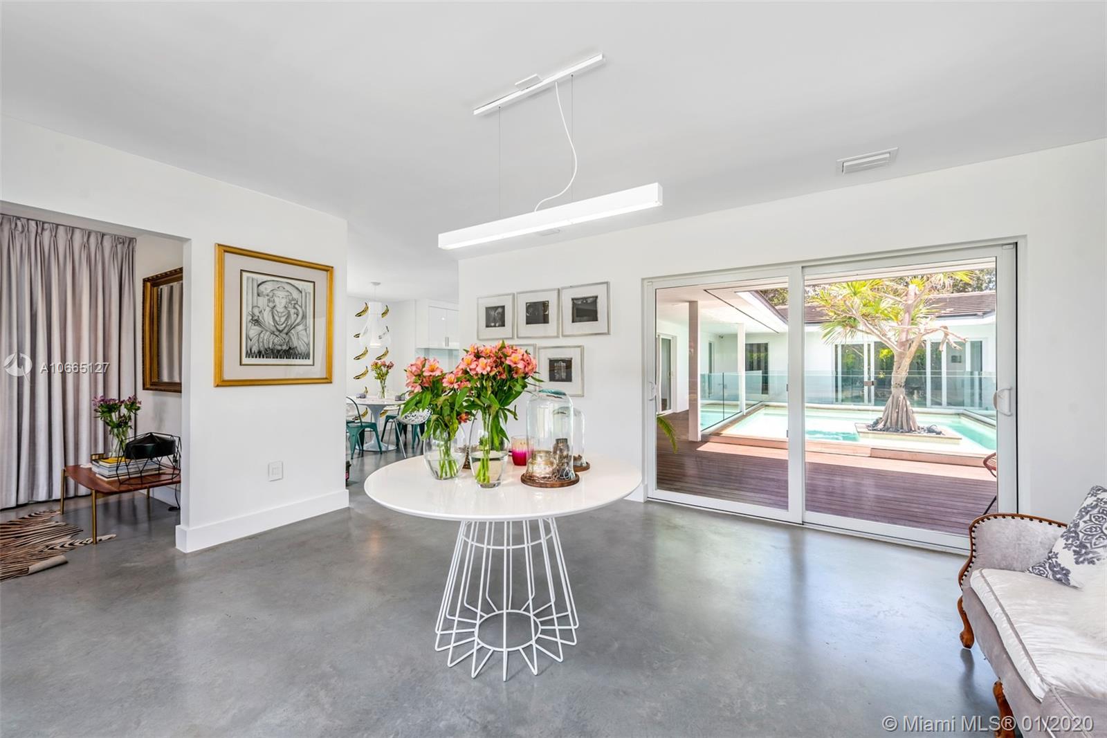 A meticulously renovated architectural gem that sits on a generous 17,400 SF lot in the heart of Coral Gables, this ultra-chic and modern estate is a must-see. This home offers open-concept living and a unique central courtyard that encompasses a resort-style, serene pool. Special features include Italian cabinetry in the kitchen with top-of-the-line appliances, IPE wood accents, and polished cement flooring throughout. The elegant master bedroom comprises large windows, a stunning en-suite bathroom, and an oversized walk-in closet. Guest bedrooms are sizeable and naturally lit, with en-suite bathrooms. Additional spaces include a separate dining room, family room, and media rooms. Minutes from Merrick Park and fine dining restaurants.