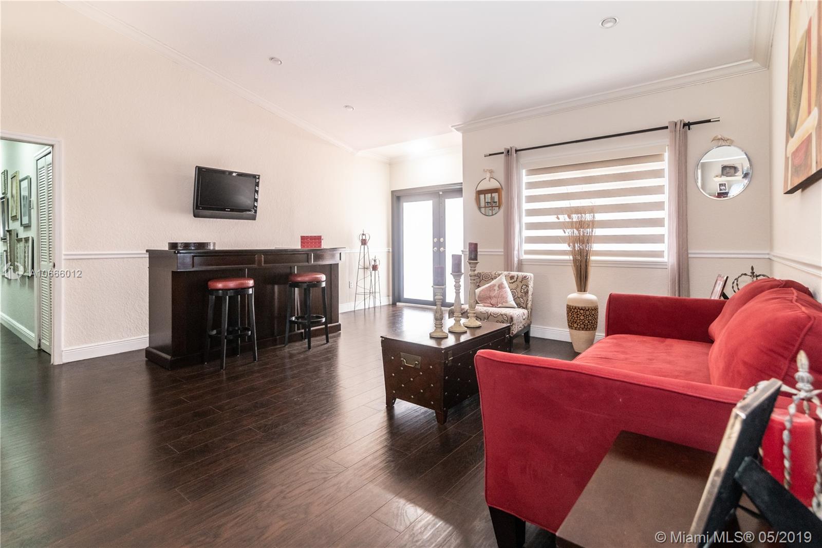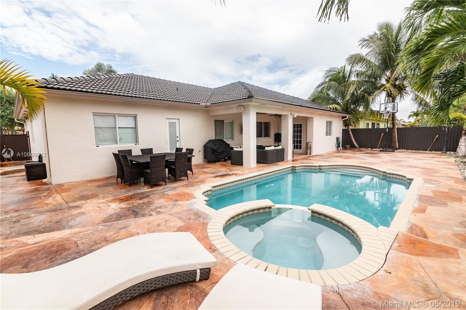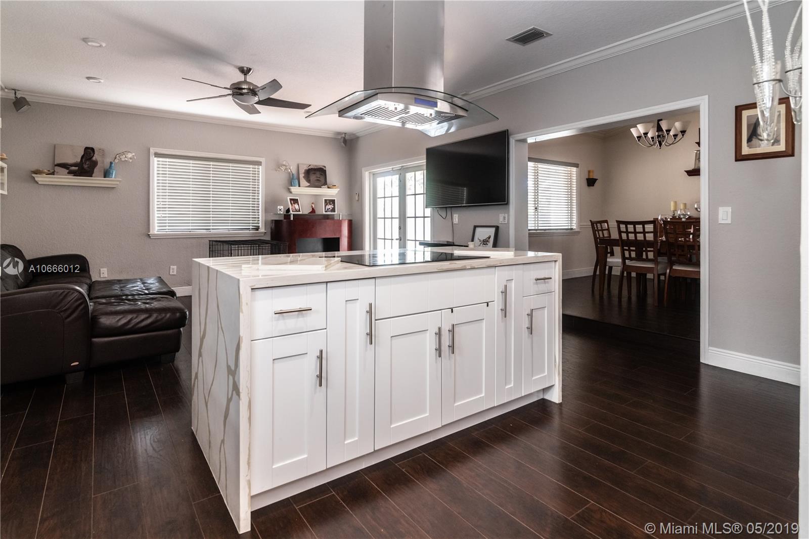 Lovely updated spacious 4/2 pool home. This home features vaulted ceilings, wood laminate floors, open concept kitchen with quartz counter tops, stainless steel appliances & wine cooler w/ a snack counter, formal dining room, large master suite and bath, covered patio wired for flat screen TV, large open pool patio area, Pool has a Jacuzzi, fenced back yard for privacy, great for entertaining. Garage has been converted to partial storage, part made into laundry room adjacent to kitchen, under air with sink & cabinetry with floor poured up to grade. Circular driveway holds minimum of 6 cars.