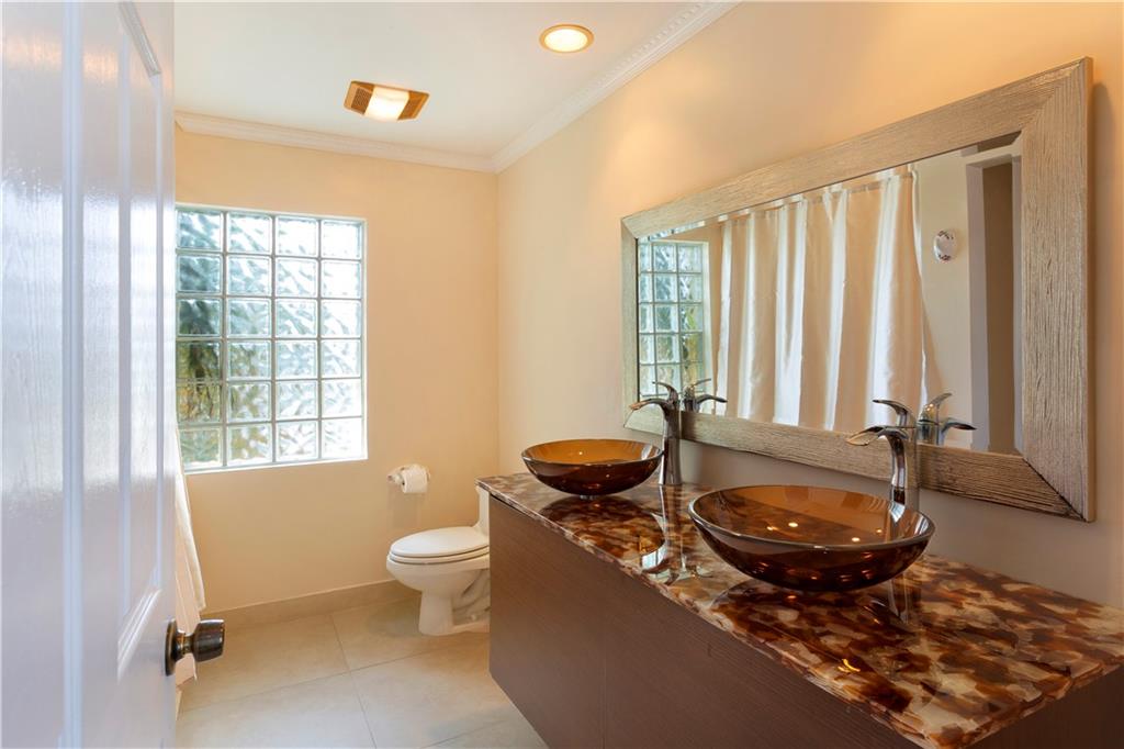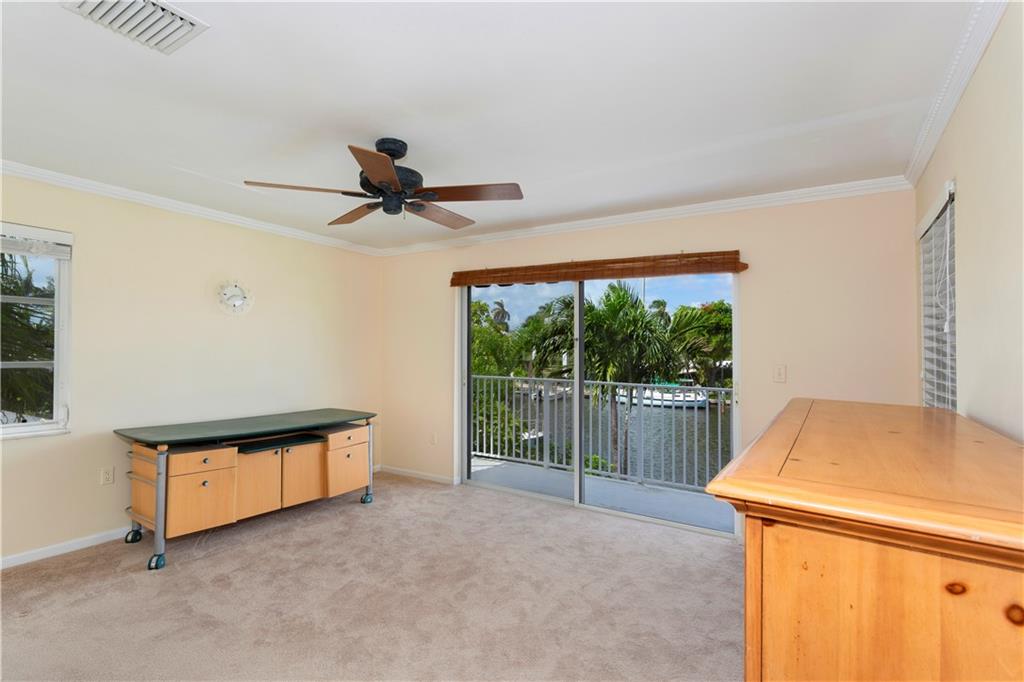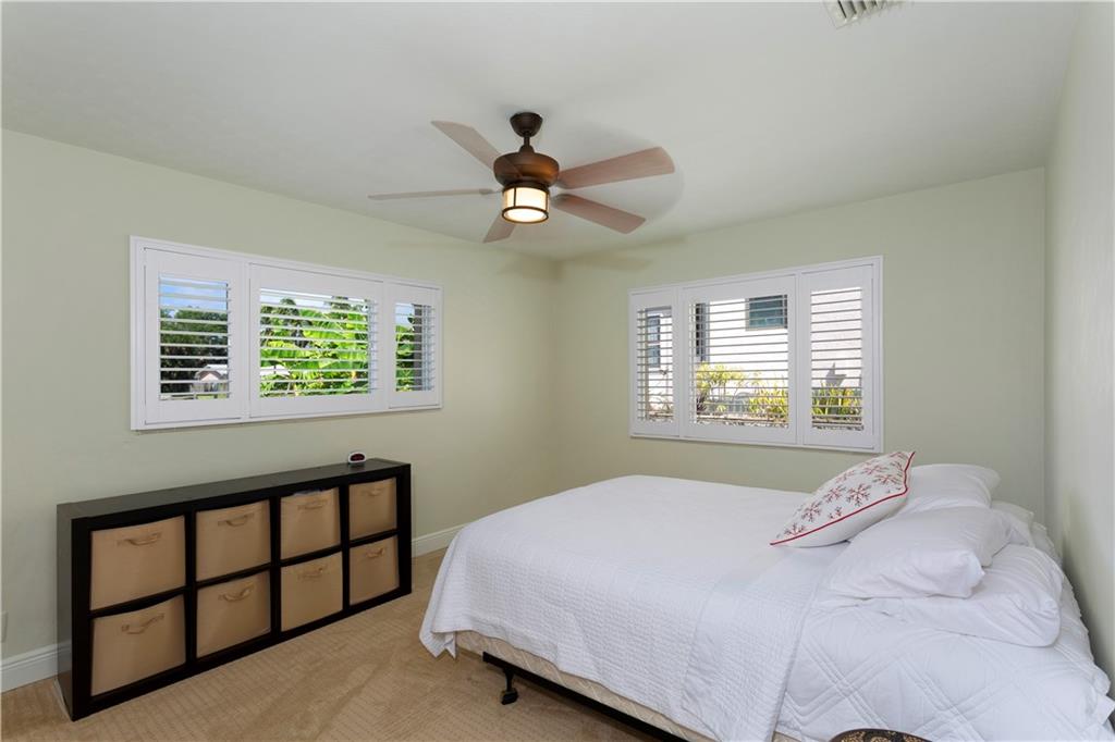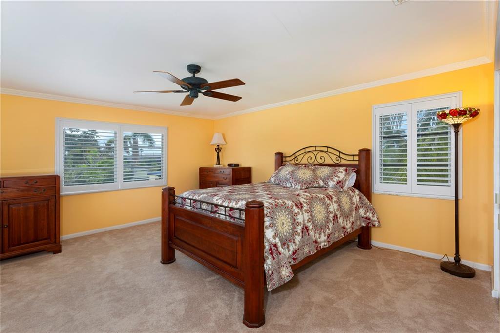 Designed in a clean-lined style, the comfortable layout totals 2,403± sf w/ 4 BR/3BA and an attached garage. Amenities include two air conditioning systems and storm shutters throughout. Neutral-tone ceramic tile floors unify the great room where banks of windows bring in the waterfront view. Leading to the terrace, this generous open space combines the main living and dining areas with the renovated kitchen - granite counters, cooking island, and stainless steel appliances. Den opens to the waterside terrace with full bath. Across the great room, two more bedrooms, one facing the water, are accompanied by another bath. Upstairs, the master suite opens to balcony over the waterway and tree-studded shoreline. The master bath includes a dual vanity. Additional bedroom on this level.