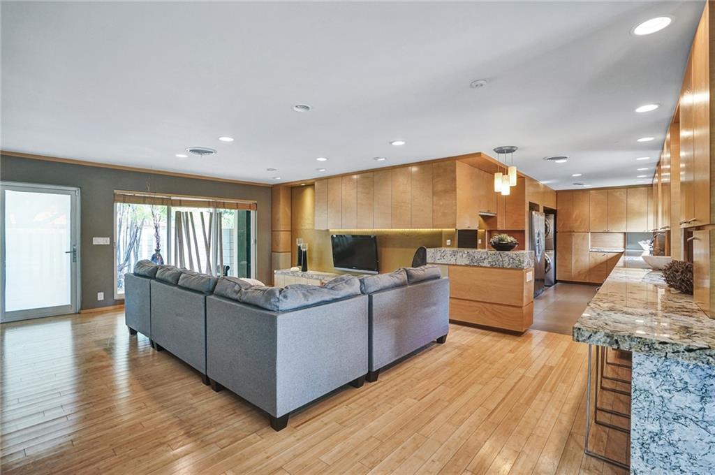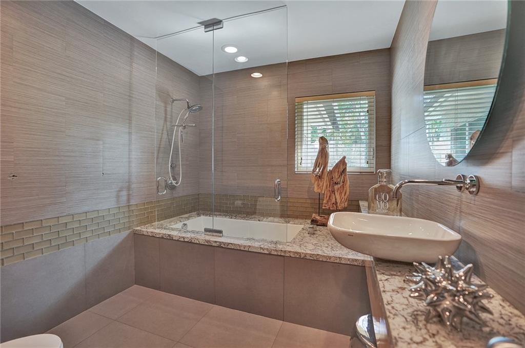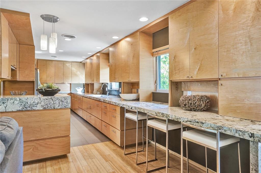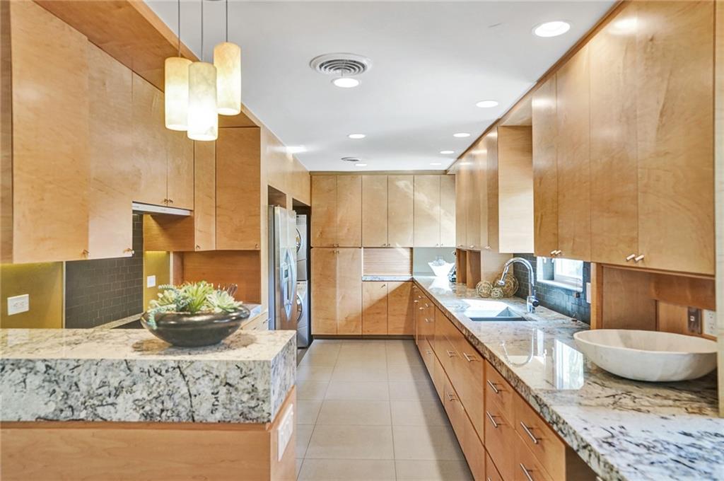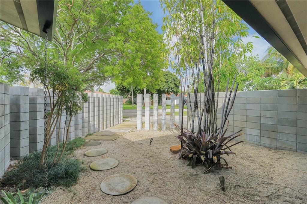 MID CENTURY BEAUTY; W/ CLEAN LINES THRU-OUT HOME. 23 CONCRETE BLOCK COLUMNS W/ CONCRETE WALL FORM THE FRONT "ZEN LIKE" COURTYARD W/ LG RECTANGLE & CIRCLE STEPPING STONES. WALK IN FRONT DOOR & SEE POOL. FLOOR TO CEILING WINDOWS IN LIVING ROOM W/ CUSTOM "BIRD'S EYE" MAPLE CABINETRY W/ STUNNING BLACK & WHITE GRANITE FORM THE FLOATING TV ENTERTAINMENT CENTER & CONTINUES THRU TO STUNNING 30X10 CUSTOM KITCHEN W/ MIELE & KITCHEN AID STAINLESS STEEL APPL. 23 RECESSED LIGHTS IN KITCHEN & LIVING ROOM. FORMAL DINING W/ WALLS OF IMPACT GLASS OVERLOOK POOL. "SPA FEELING" MASTER BATH W/ SOAKING TUB & SEAMLESS GLASS SHOWER DOORS & FLOATING CABINETRY. BAMBOO FLOORS IN MAIN AREAS & 23" GREY STONE TILE IN BEDROOMS. METAL ROOF & 2 CAR GARAGE & FEATURES A BUILT IN CONCRETE & GRANITE POOL BAR.